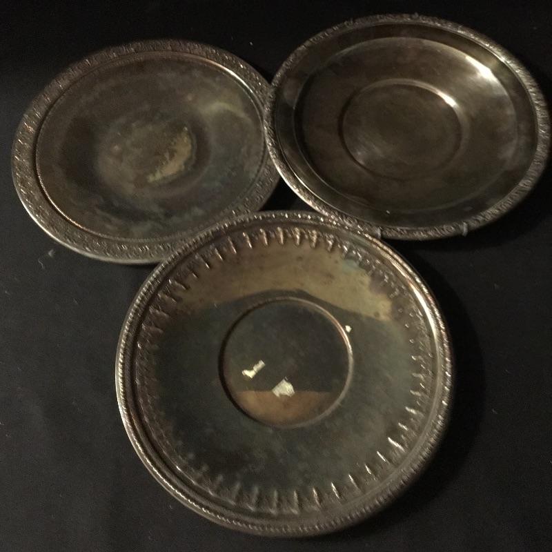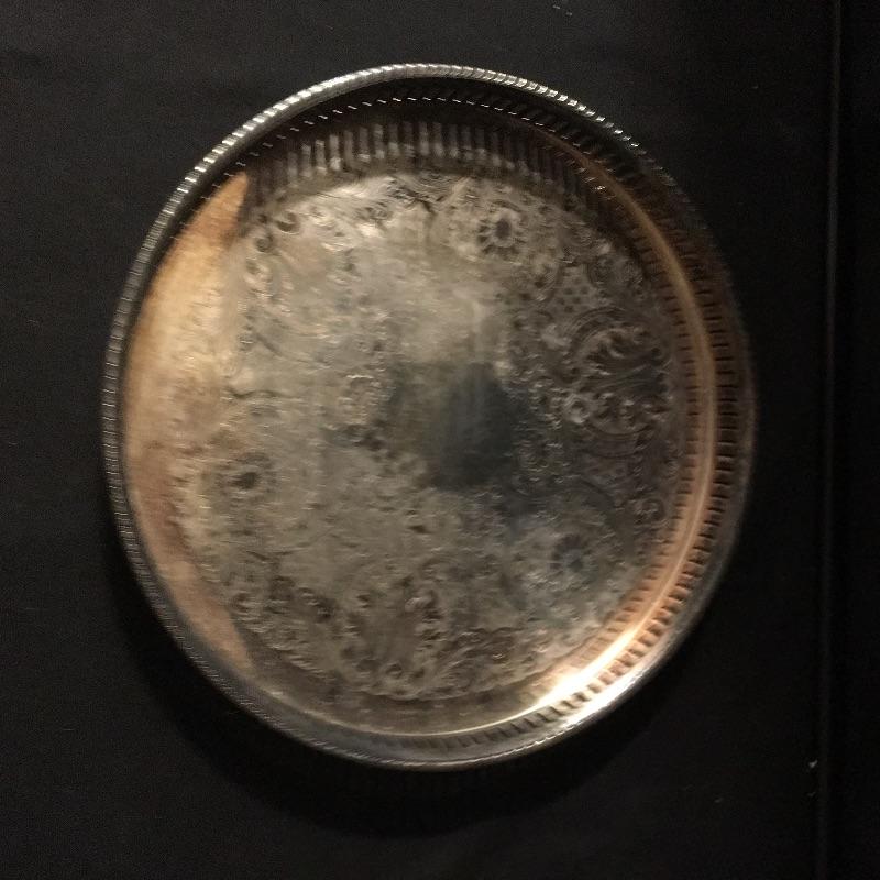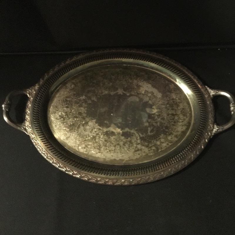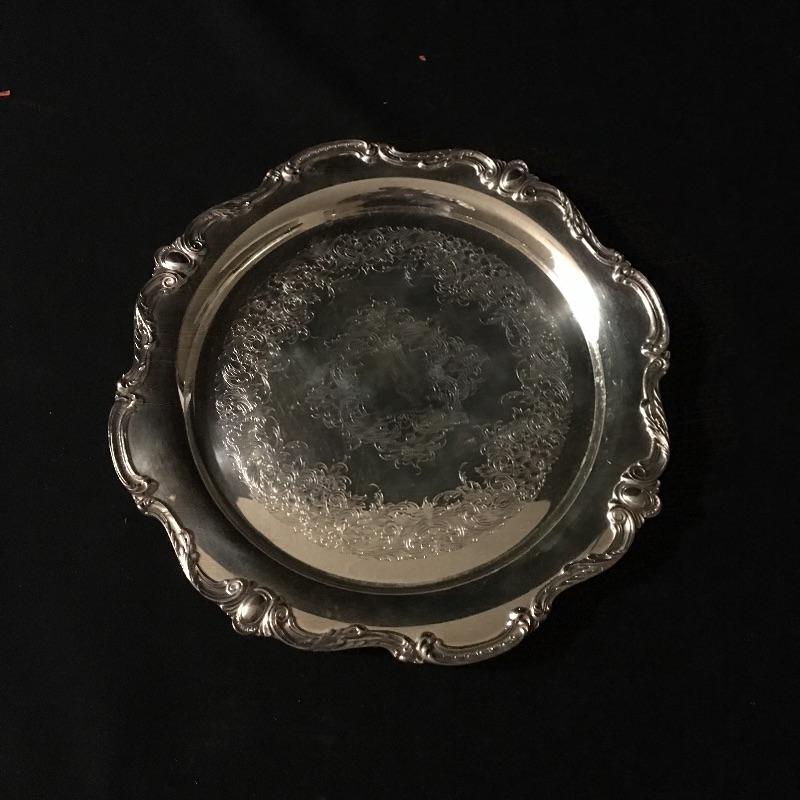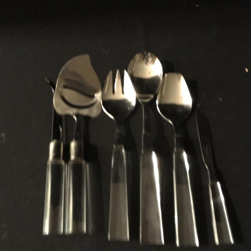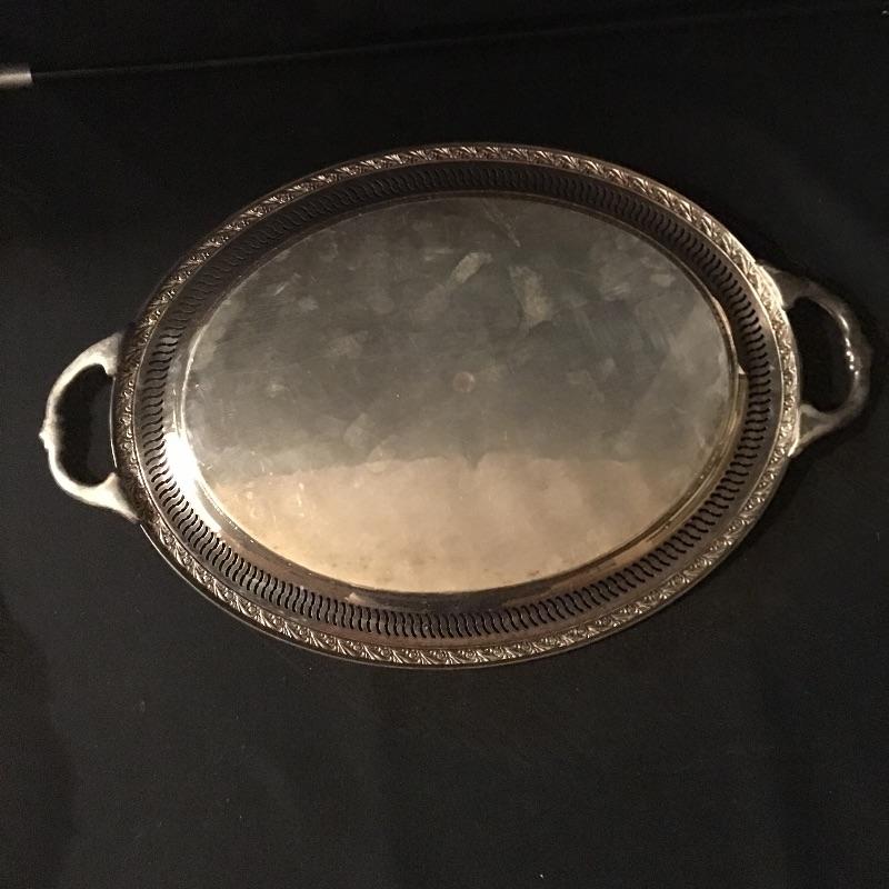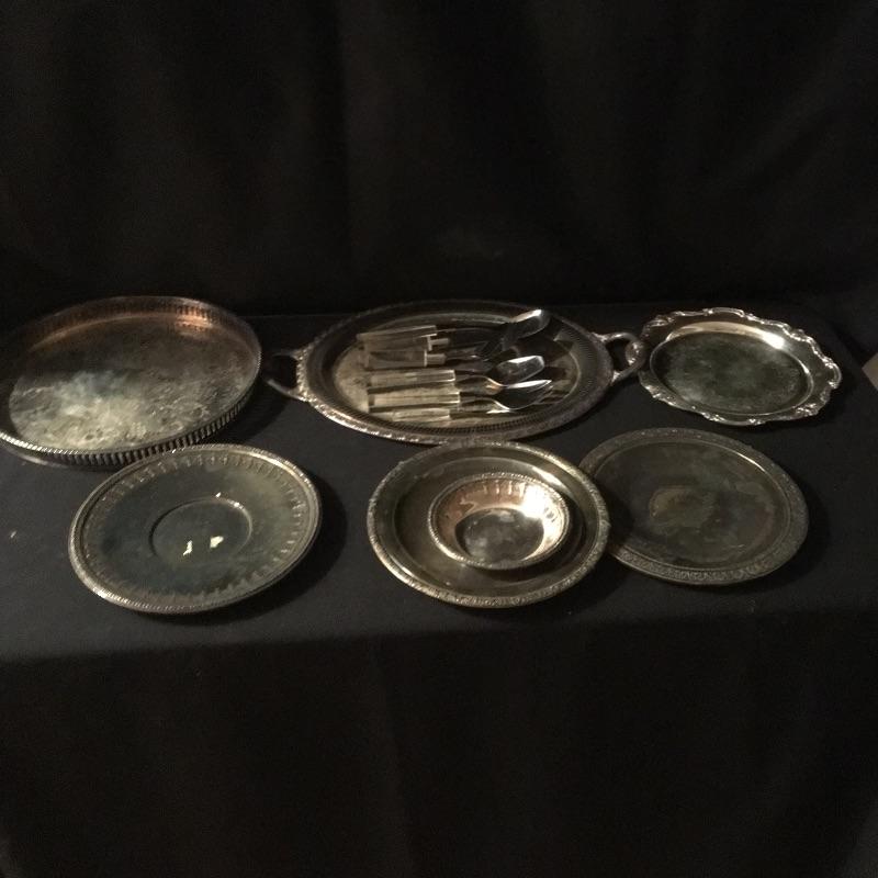 Assortment of silver serving trays with serving utensils including some by Reed and Barton, Rogers and More. Utensils have clear acrylic handle. Largest tray measures 13.5” x 22”.