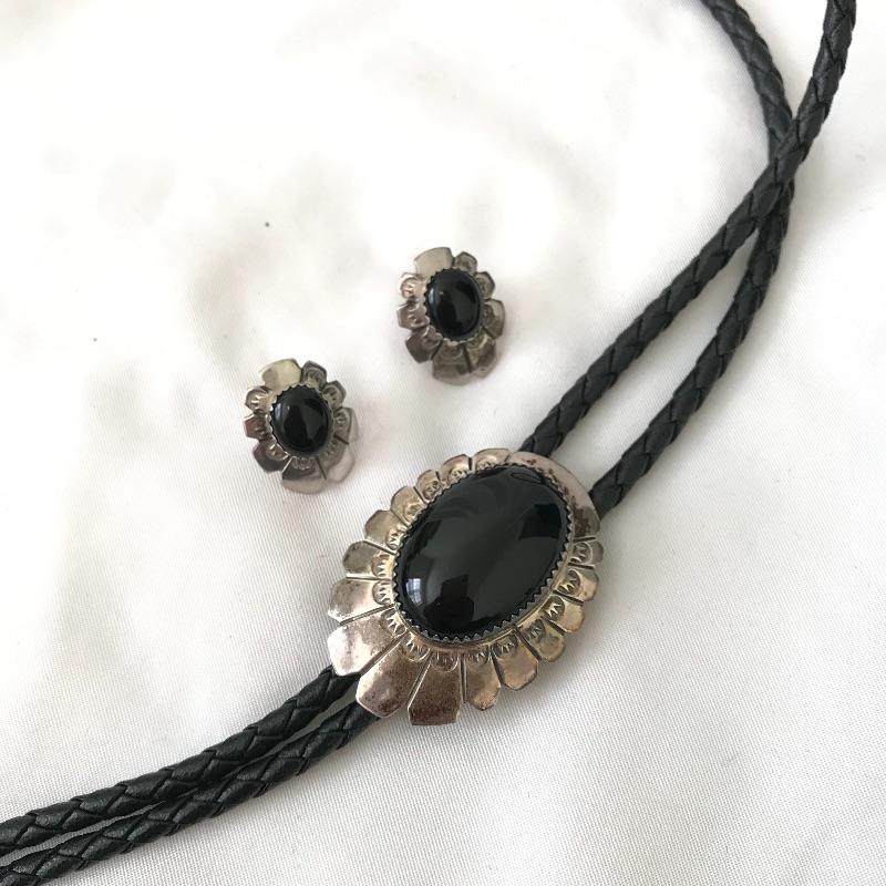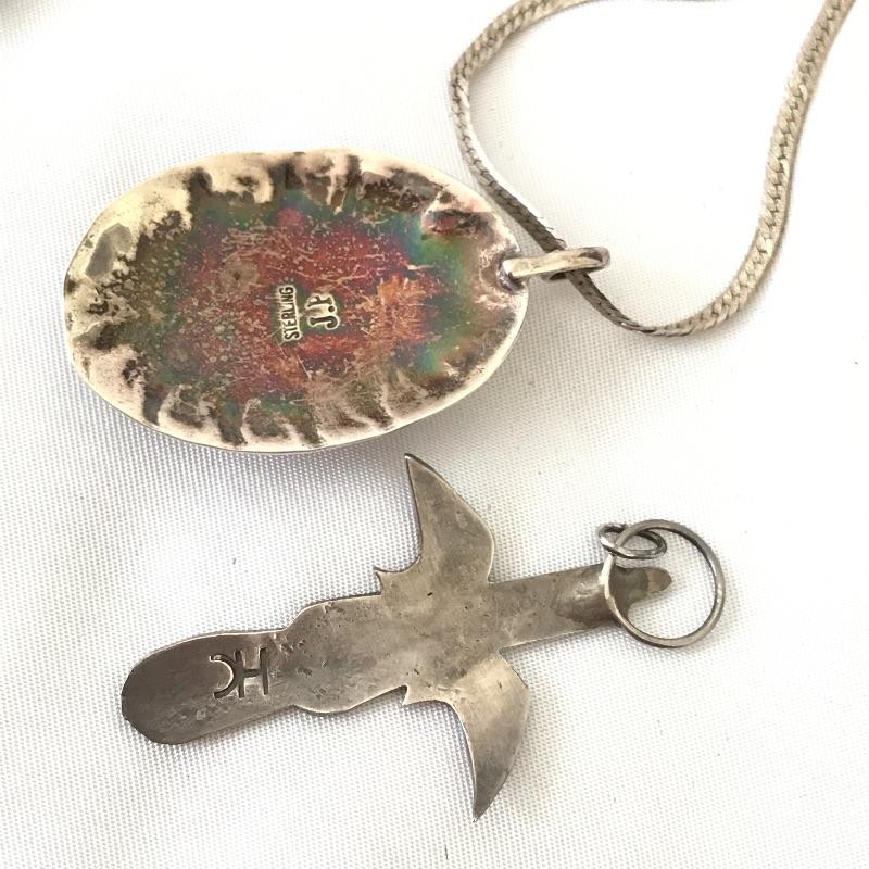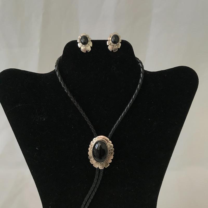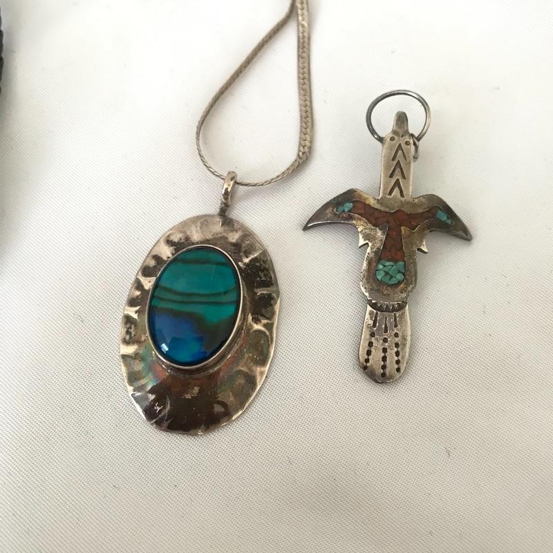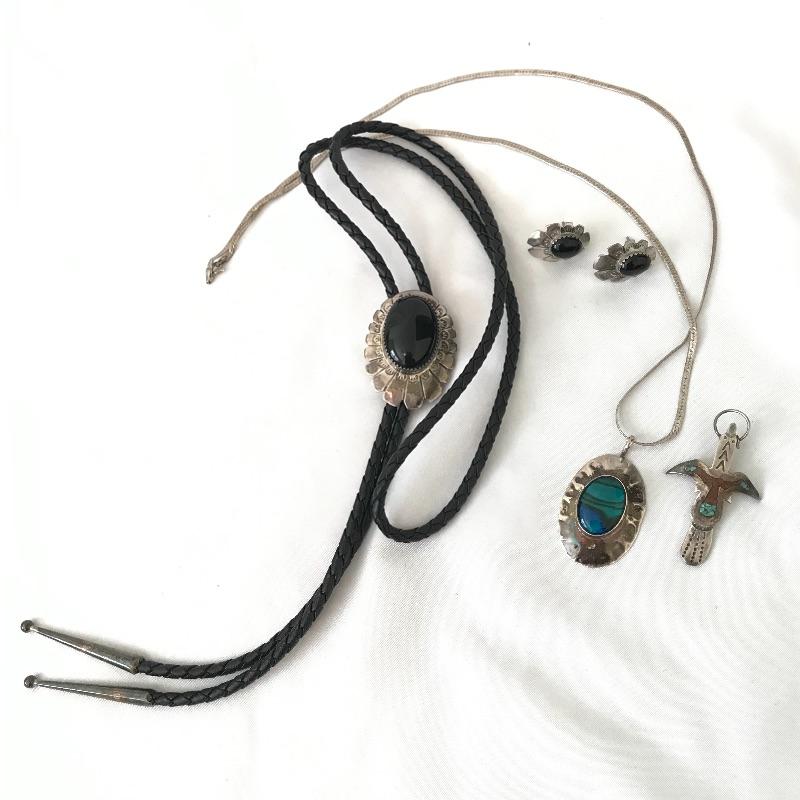 Eye catching lot with bold colors. A leather Bolo and earring set with what appears to be onyx and marked STERLING JB. Lot also features a pendant with turquoise colored stones and an indigenous style marked HC. Lastly, a gorgeous deep yet bright blue and green pendant with chain both with Sterling/925 marks. See photos. Shipping available.