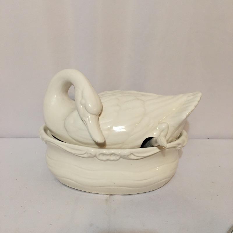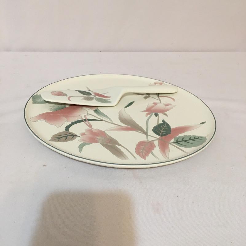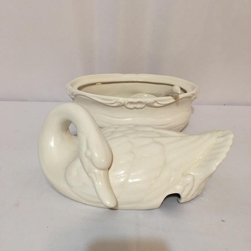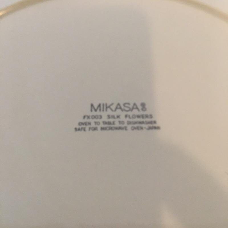 Mikasa dessert platter with server, sean lidded serving bowl and more. Lot includes covered swan serving bowl with ladle, matching Mikasa Silk Flowers platter and serving utensil, shell shaped dish and a gravy bowl with spoon. Be ready for a party with this neat lot. Platter measures 12”D.