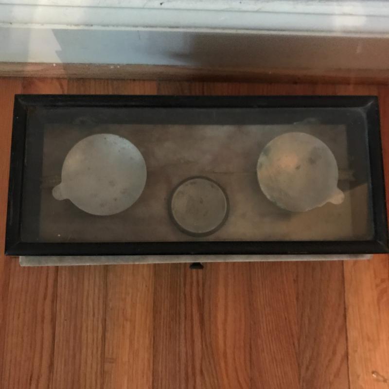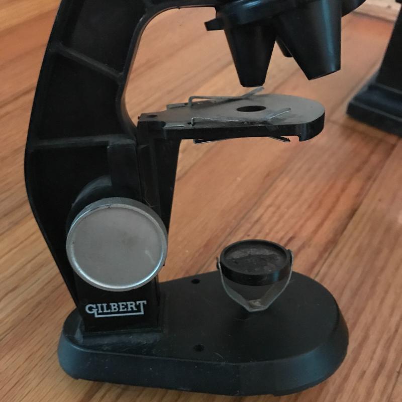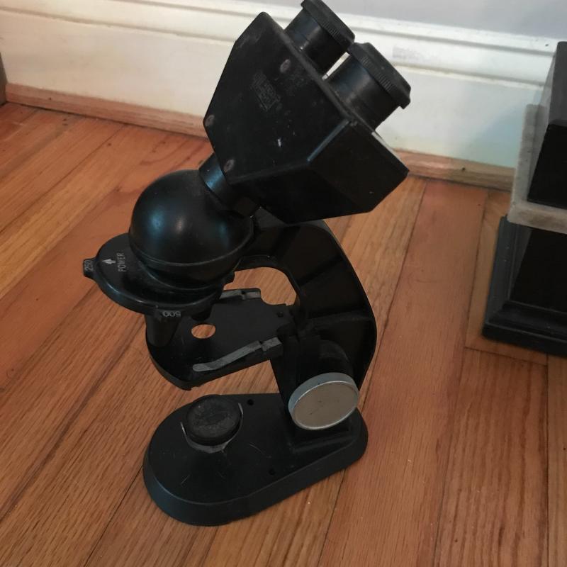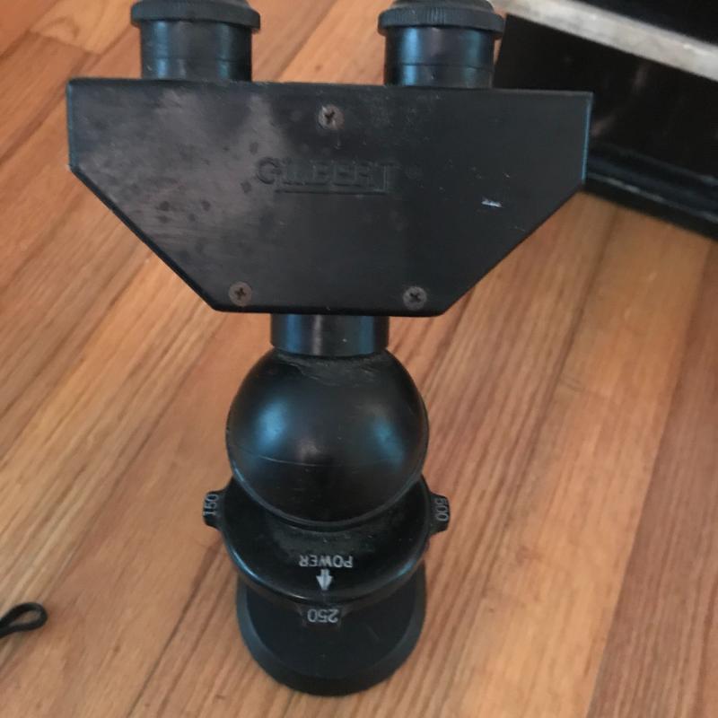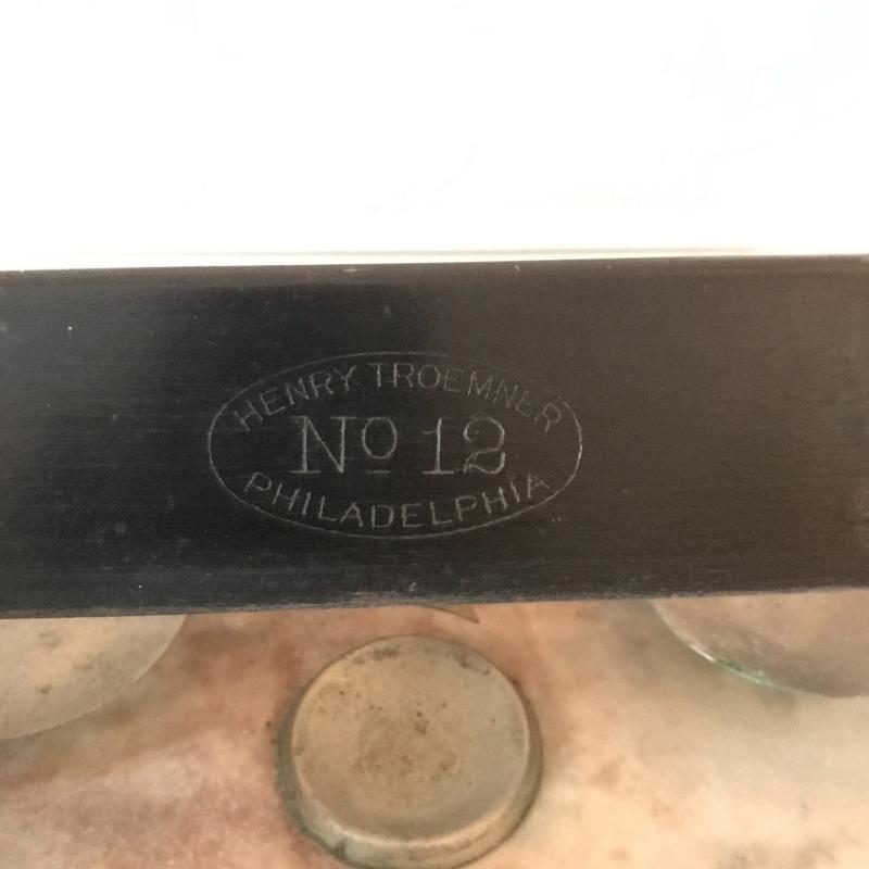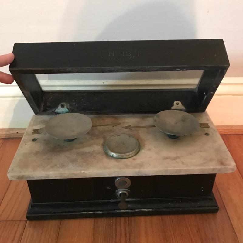 Vintage pharmacy scale by Henry Troemner No. 12 from Philadelphia. Marble piece under balance. Top lifts for scales. Has some wear. Measures 13” x 6” x 7”. Lot also includes a Gilbert microscope. Shipping available.