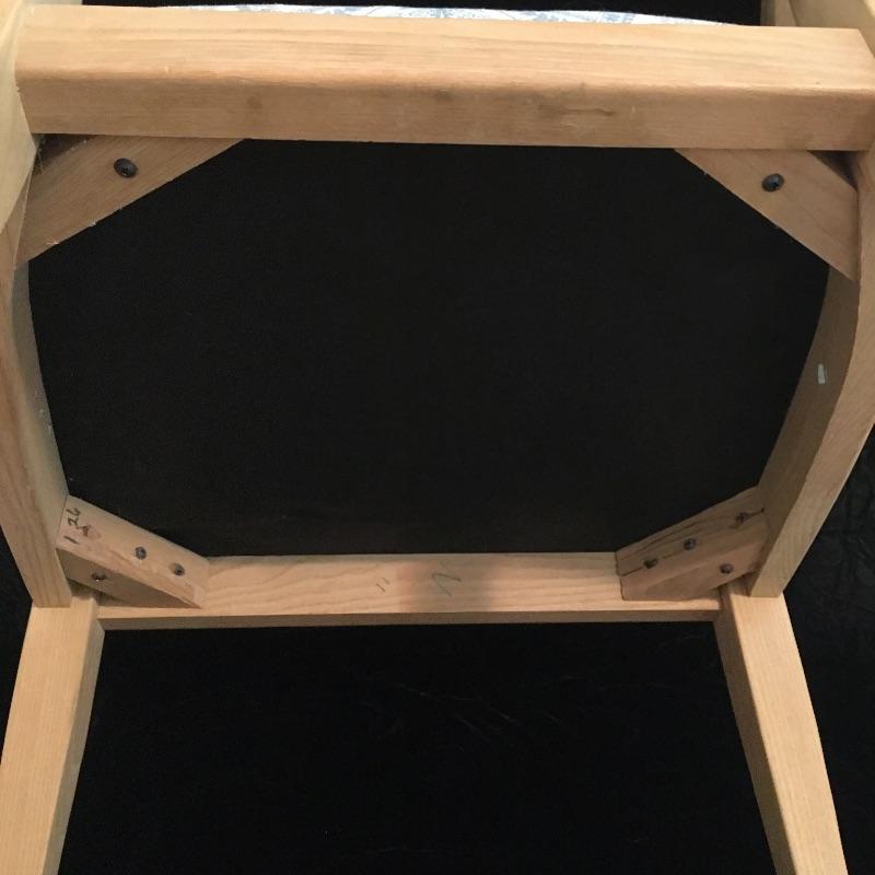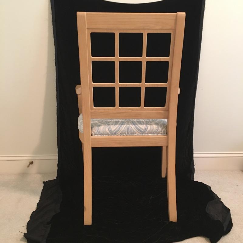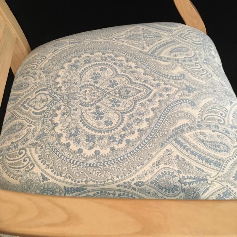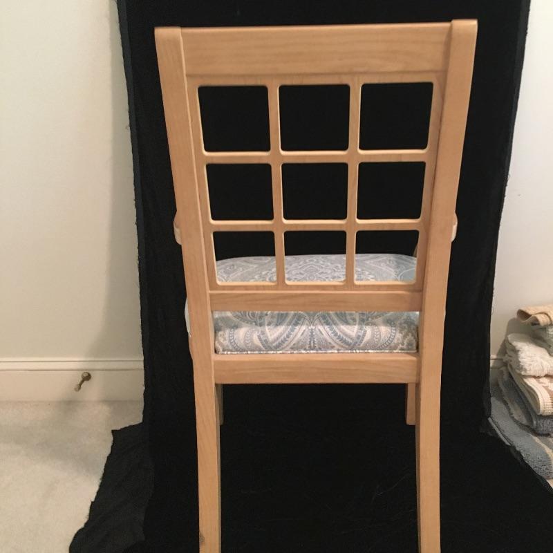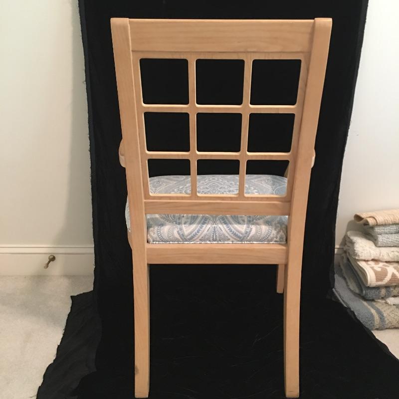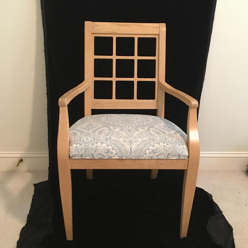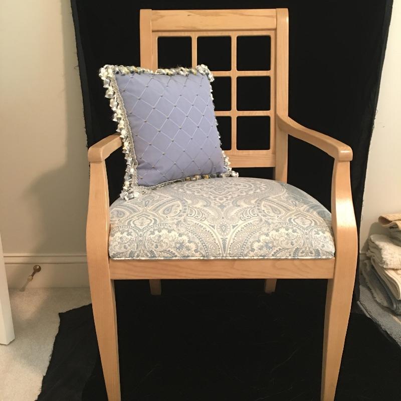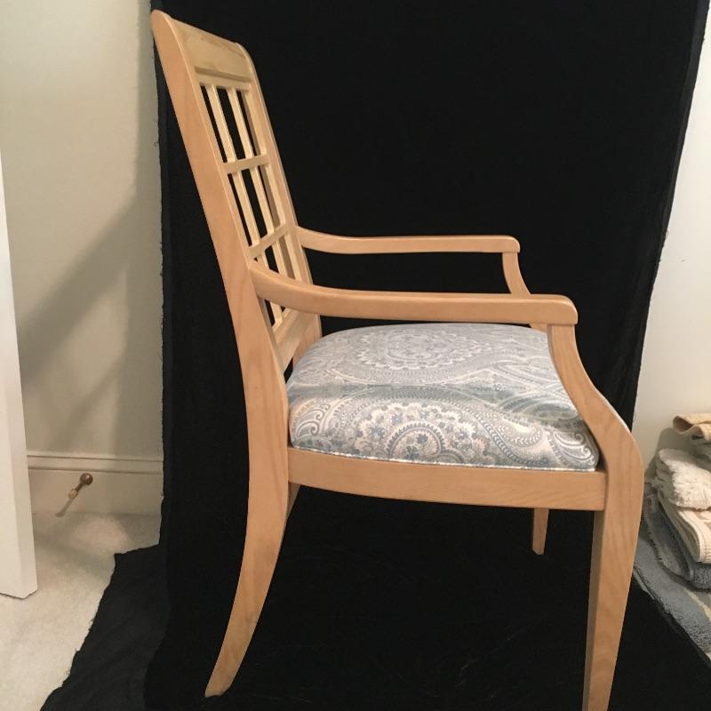 Wooden arm chair with small pillow and a blue and white seat. Great chair with a unique design on the back. Chair measures 22.5” x 22.5” x 36” with a 18.5” seat height.