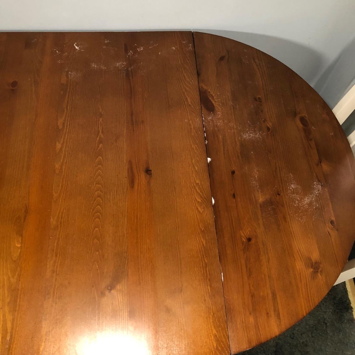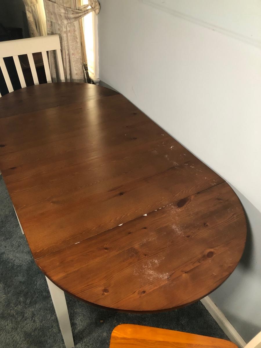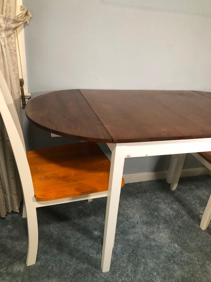Table measures 31.5W (55W w/ 2 drop leaves out) x 28D x 29.5H and has slight condition issues.