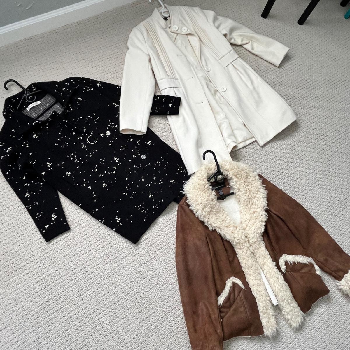 Lot 156 Brown suese coat (L), white dress coat (8), sweater coat (S)