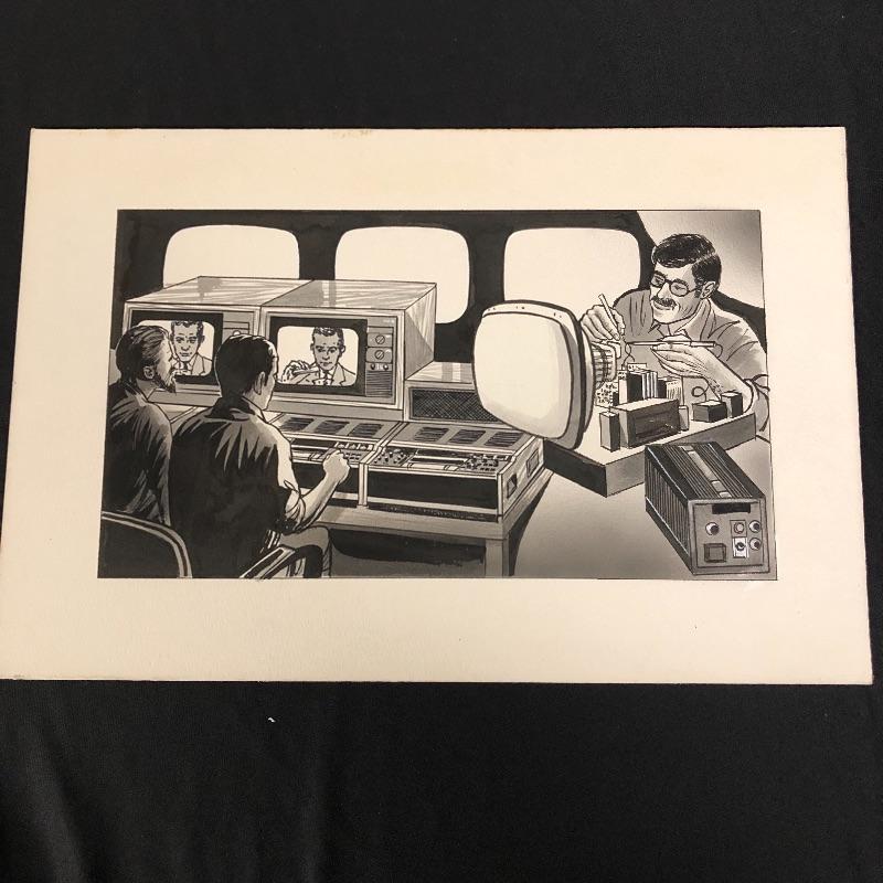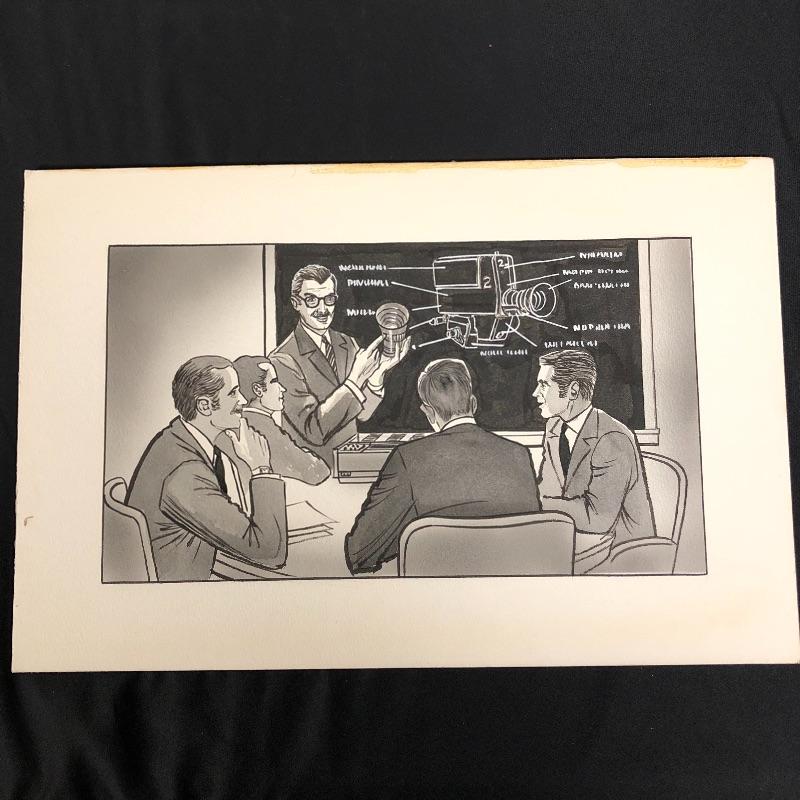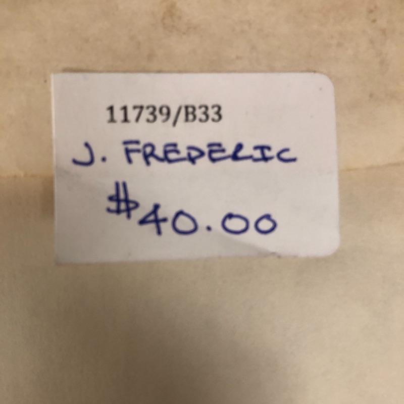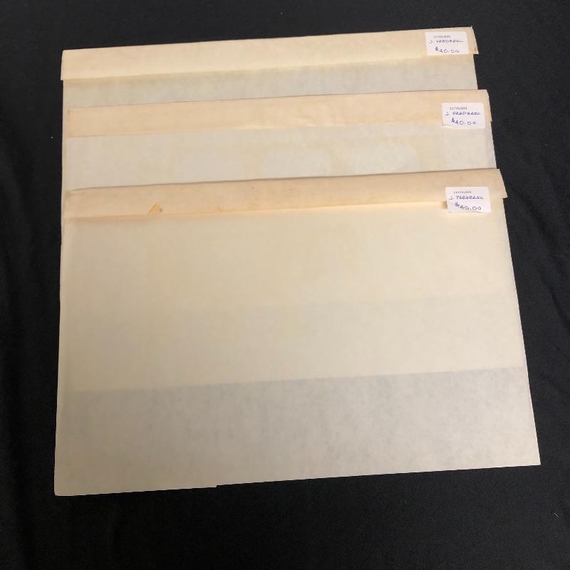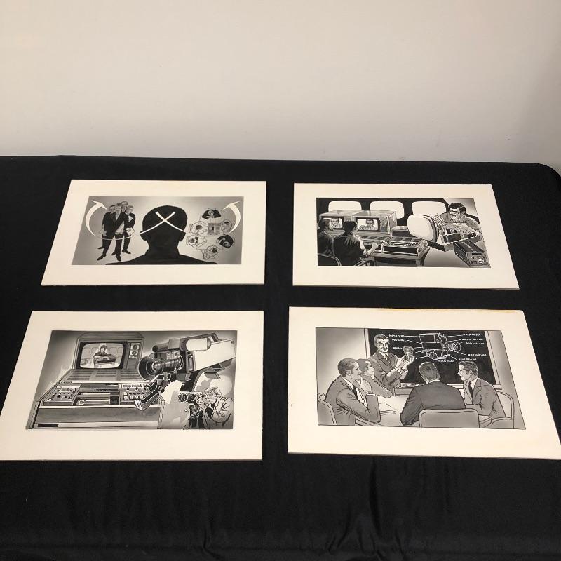 This lot includes four black and white images on paper on board. They all measure about 15” x 10”. They seem to be drawings using watercolor and pen/marker and have a sticker saying J. Frederic who is likely the artist. They are unsigned. They also come with thin paper coverings for protection.