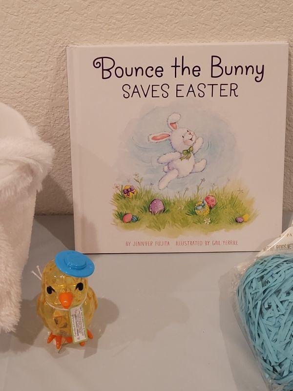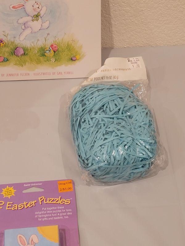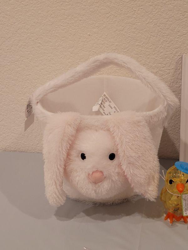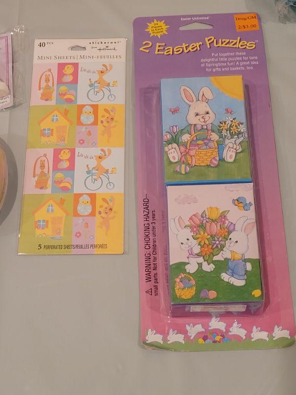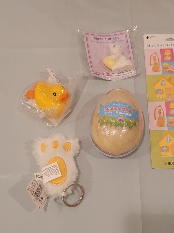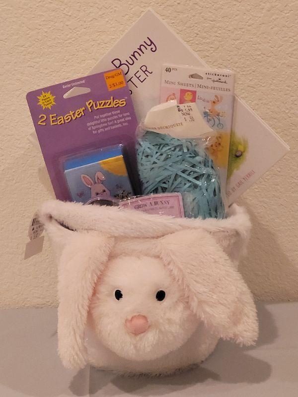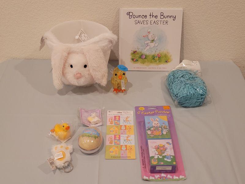 Lot 156: New Easter Bunny Basket with Puzzles, Stickers, Wind Up Toys, Bath Toys, Bunny Book and Faux Rabbits Foot Keychain