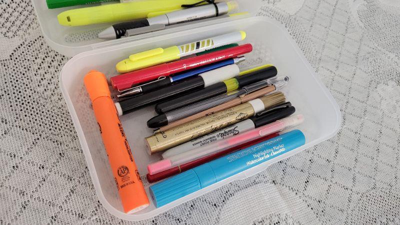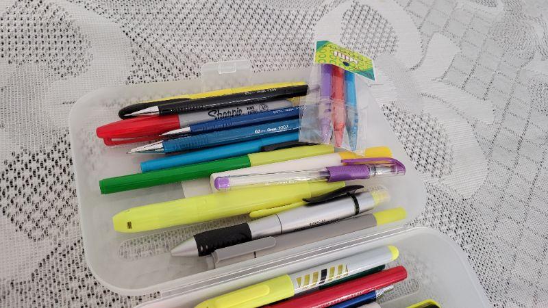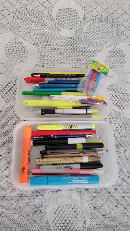 Lot 156: Plastic Tote of Pens and Highlighters UNTESTED