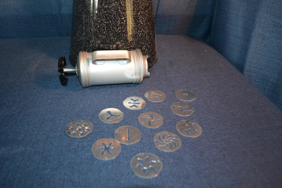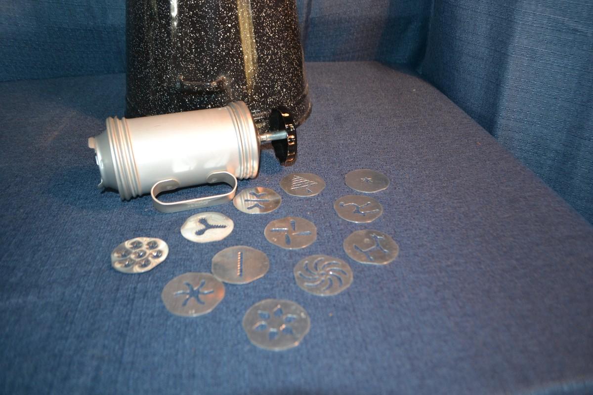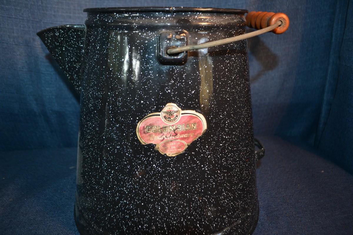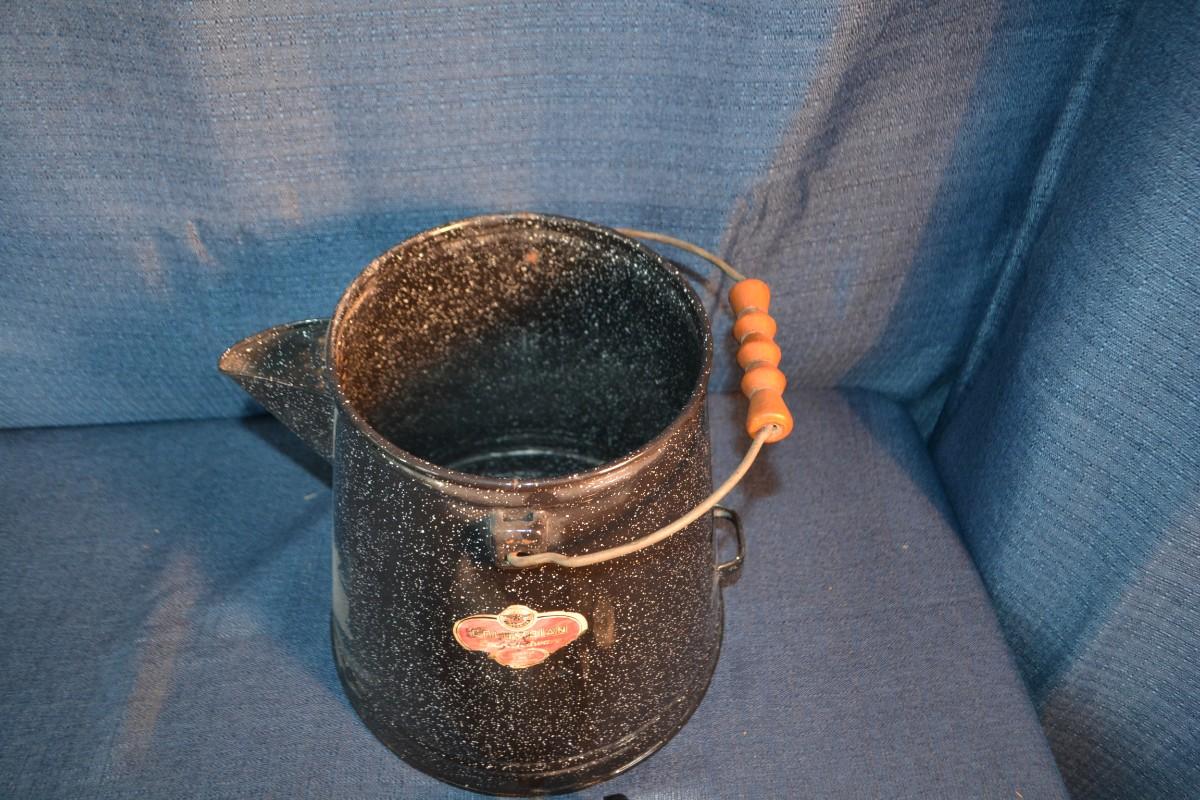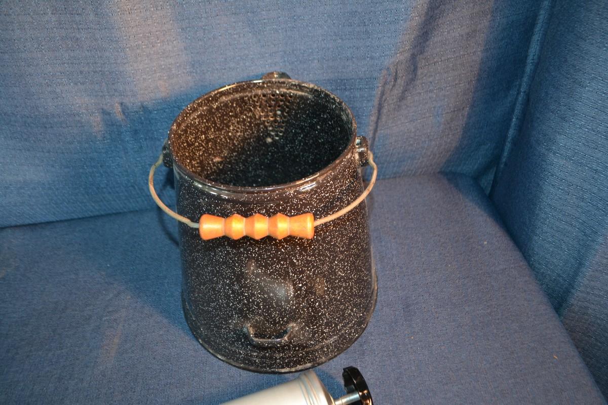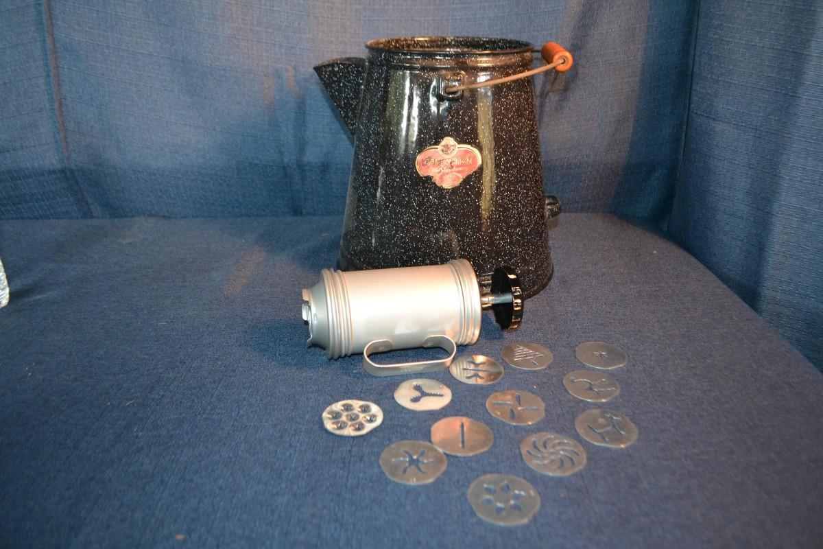 LOT 156 vintage enamelware coffee pot and cake decorating tool