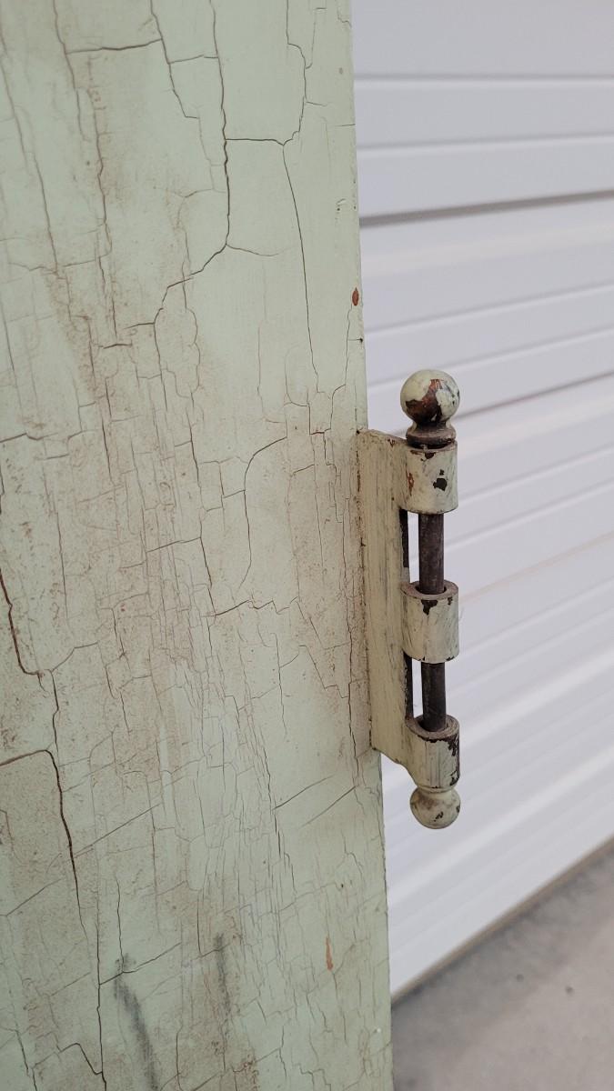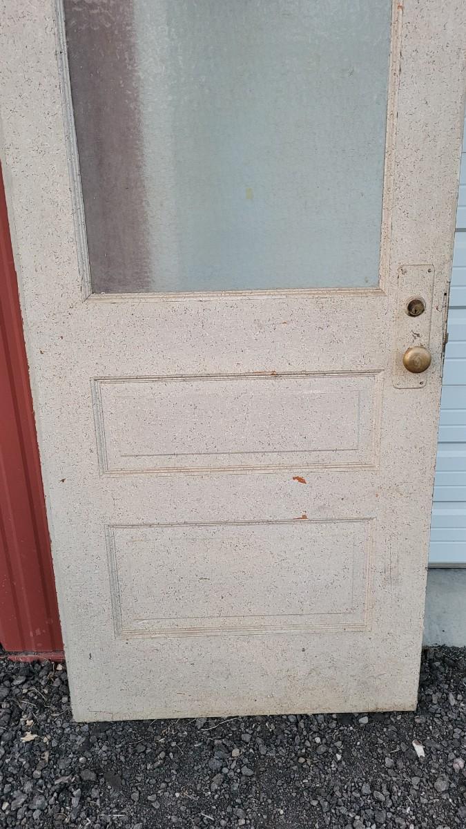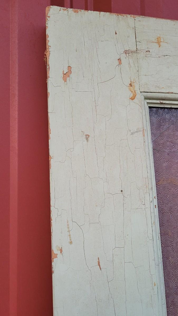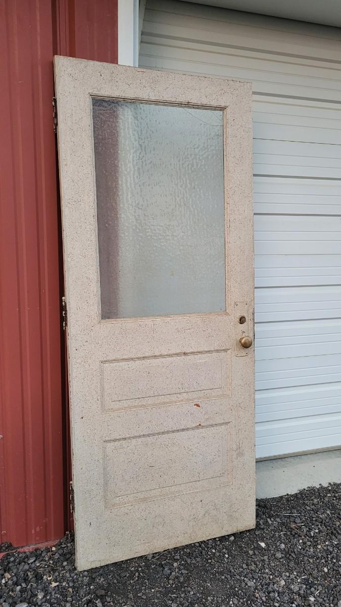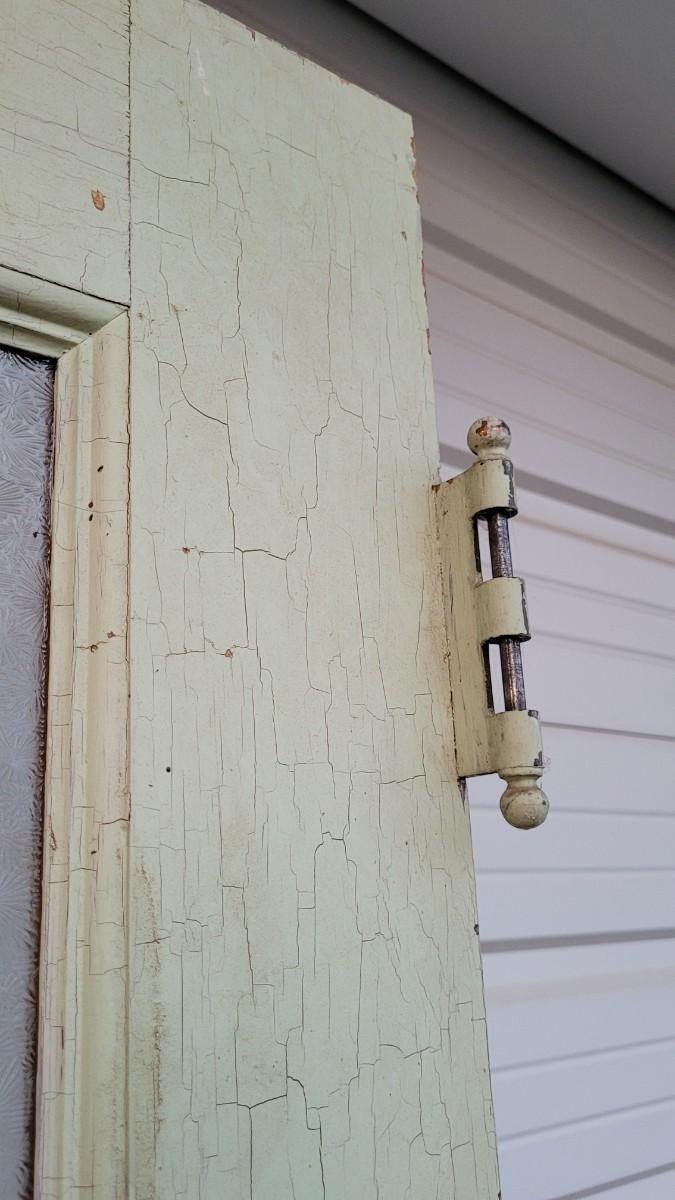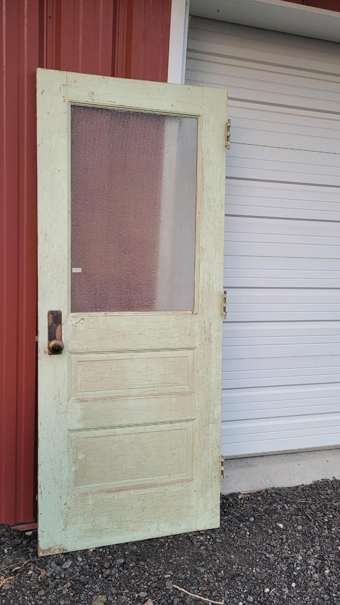Lot 156: Vintage Farmhouse ORIGINAL TWO SIDED Chippy Paint Door w/ Original Art Glass Insert and Hardware