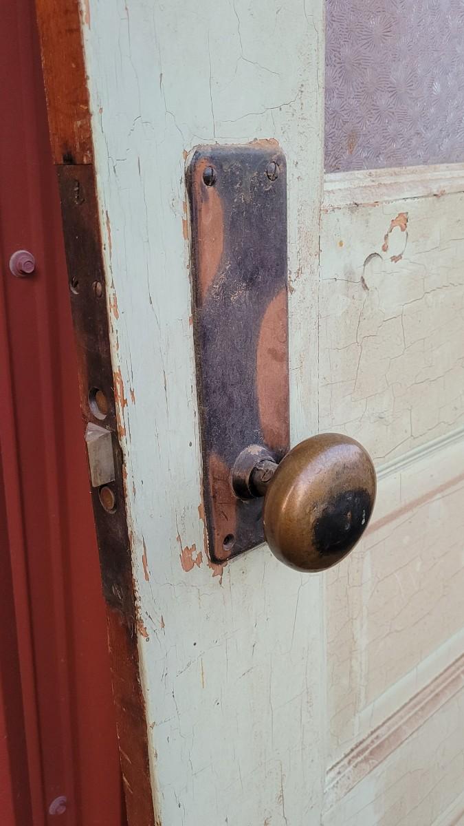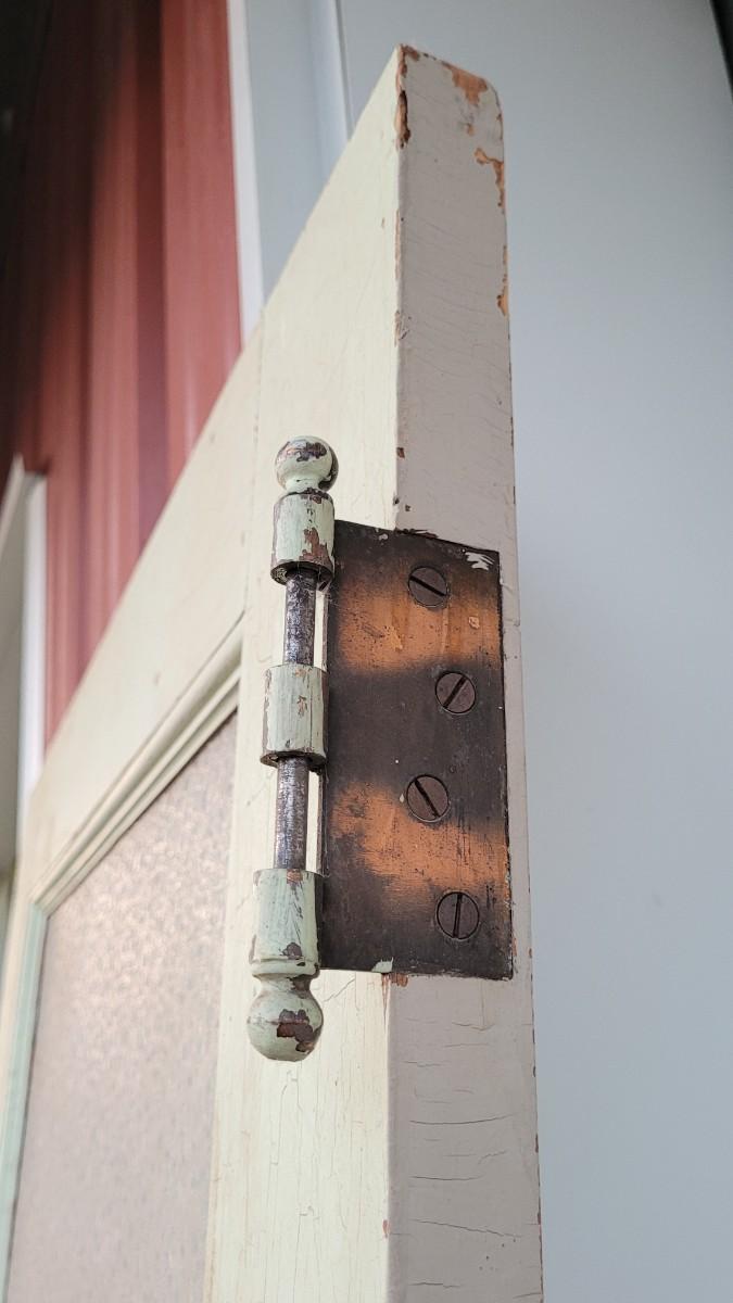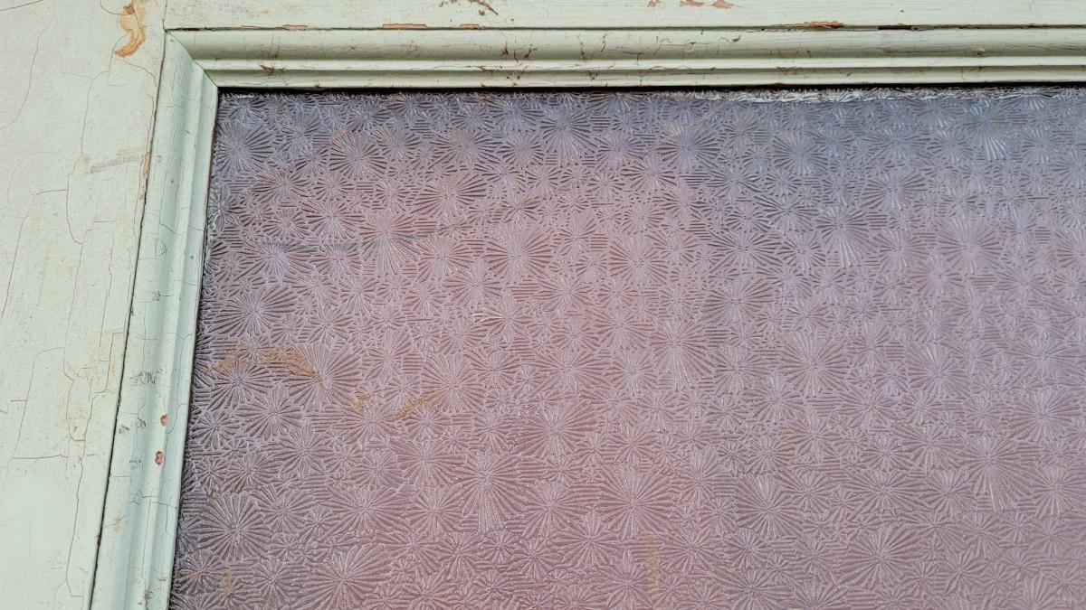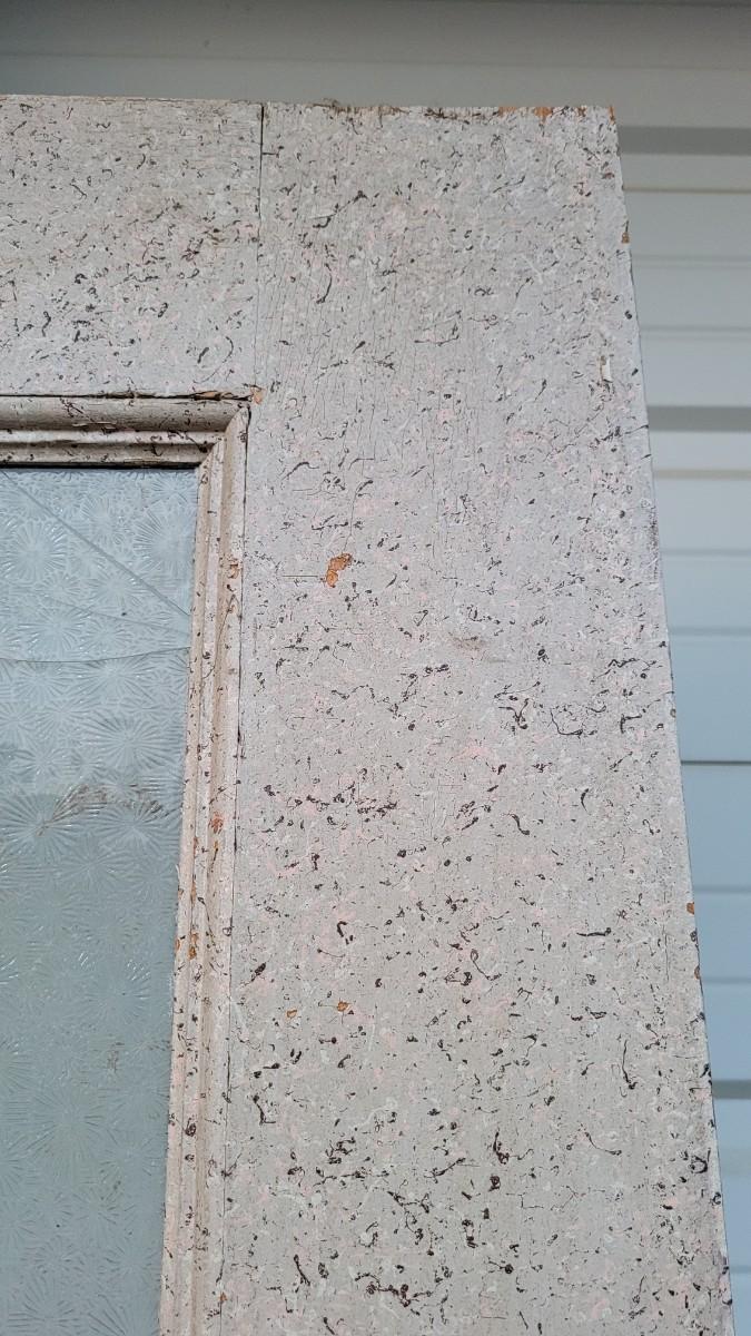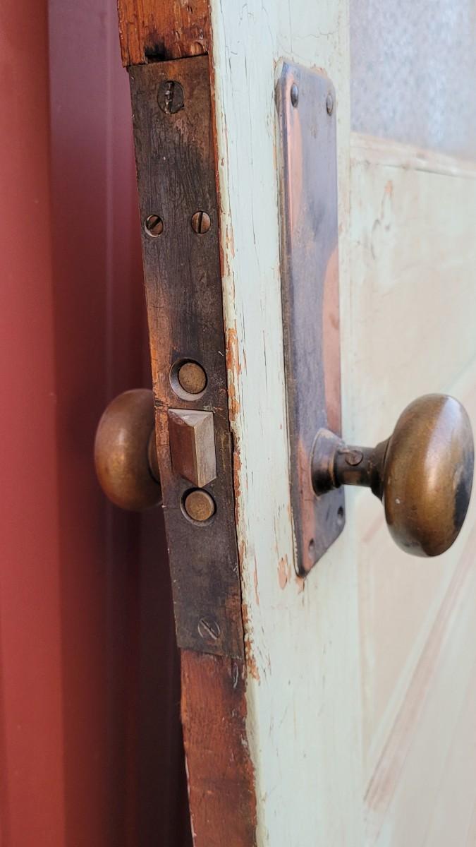 Lot 156: Vintage Farmhouse ORIGINAL TWO SIDED Chippy Paint Door w/ Original Art Glass Insert and Hardware