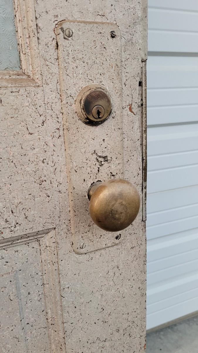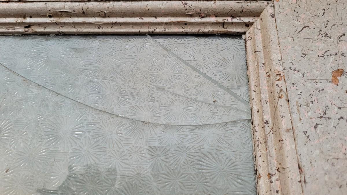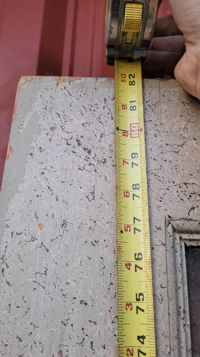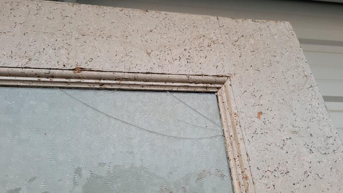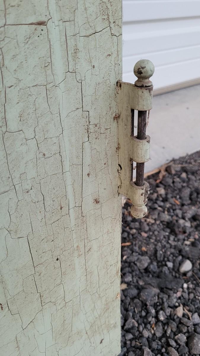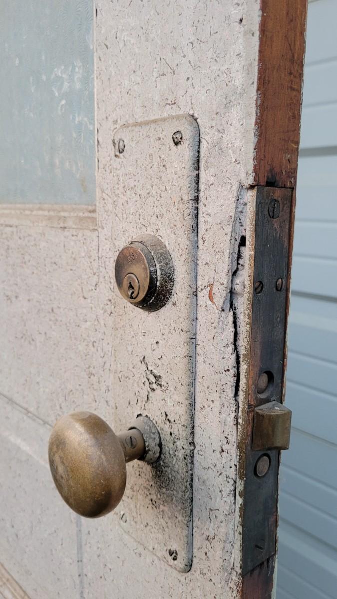 Lot 156: Vintage Farmhouse ORIGINAL TWO SIDED Chippy Paint Door w/ Original Art Glass Insert and Hardware
