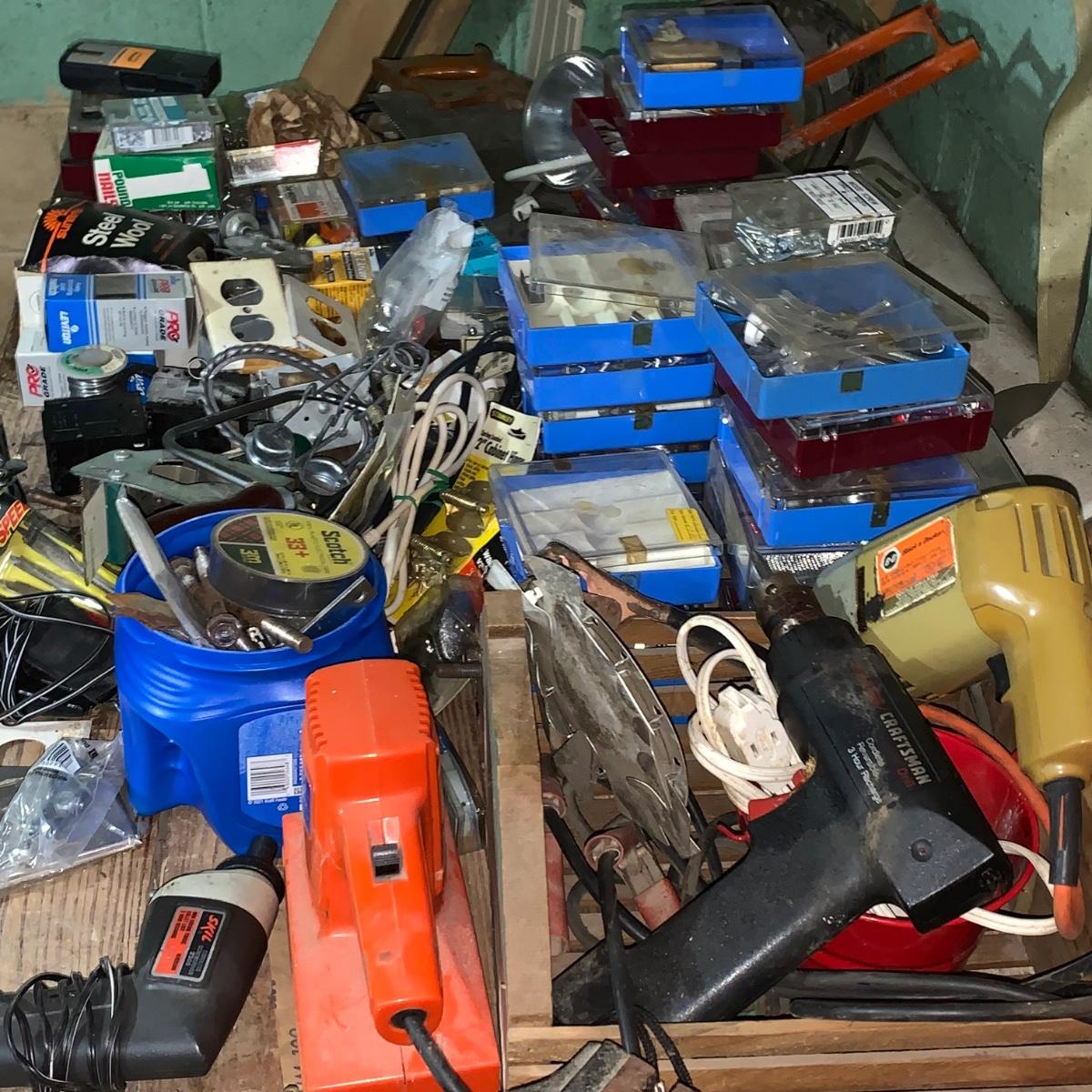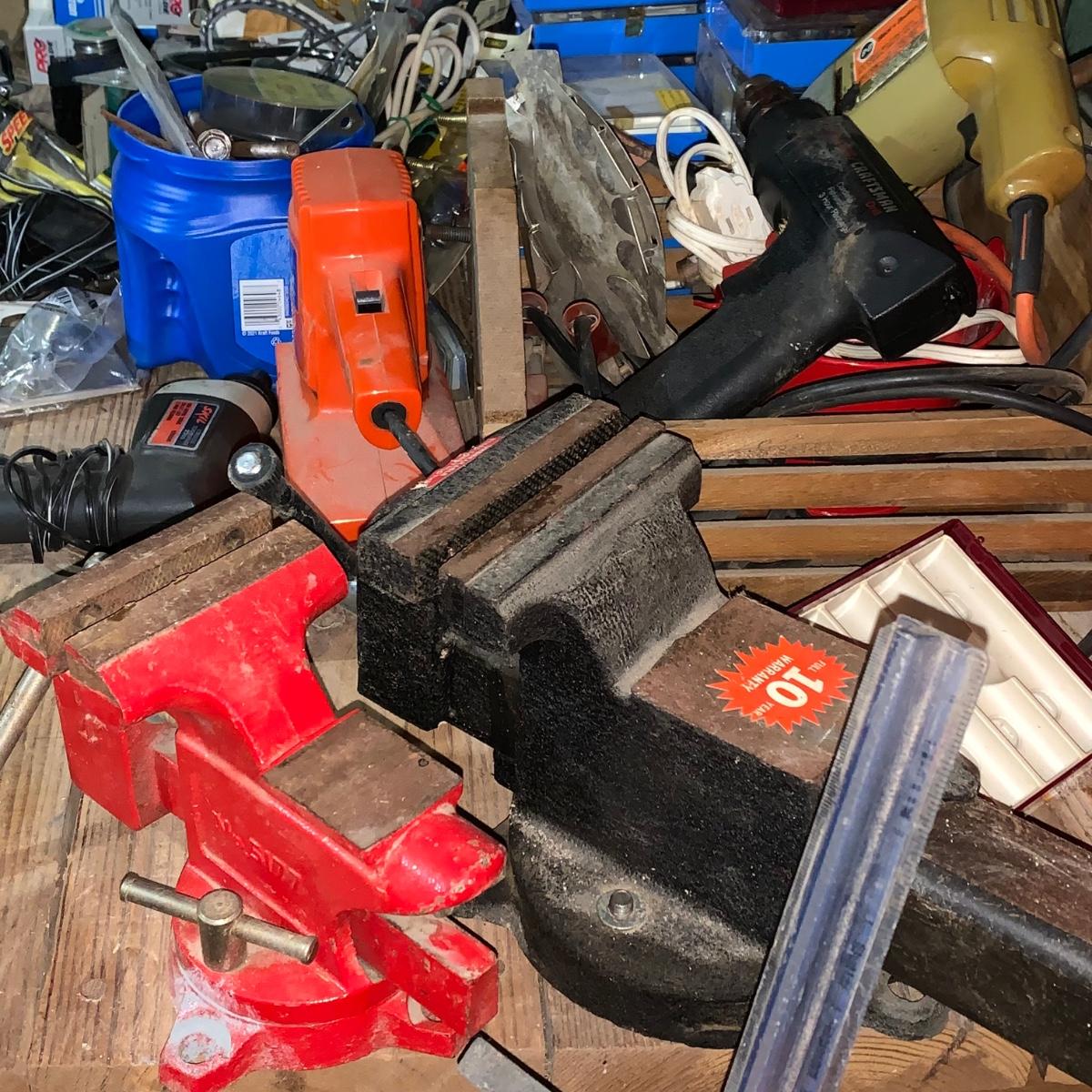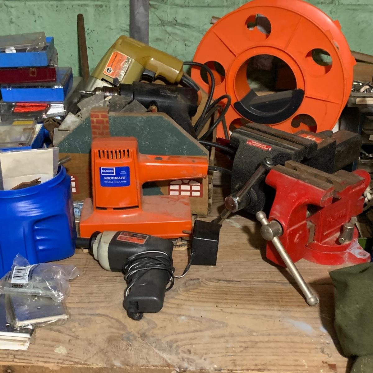Lot 156: Tool Bench Lot: Power Tools, Nuts & Bolts, Vices - Everything you see.