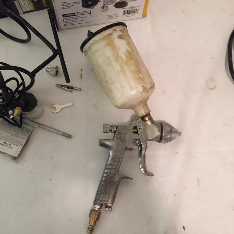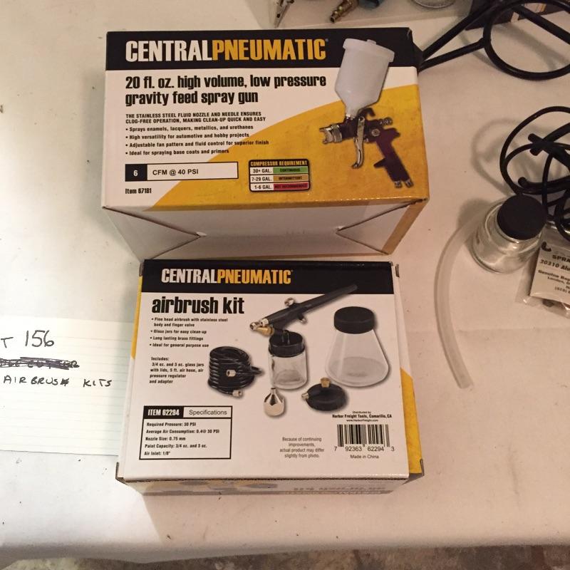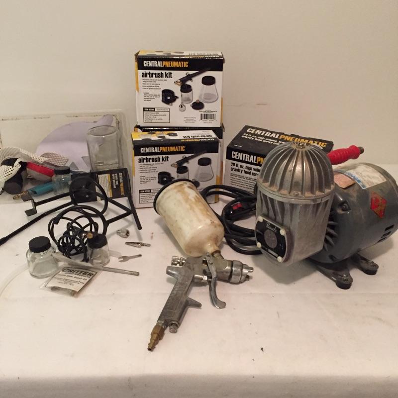 Campbell Hausfeld air Brush Sprayer , 1 CentralPneumatic 20 Fl.oz. high volume, low pressure gravity feed spray gun, 3 CentralPneumatic airbrush Kits and a Paaseh compressor.