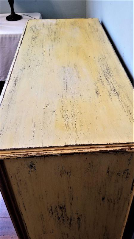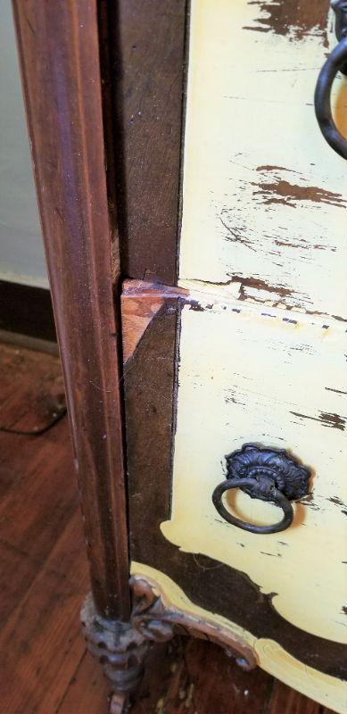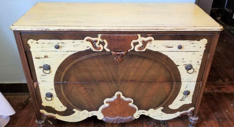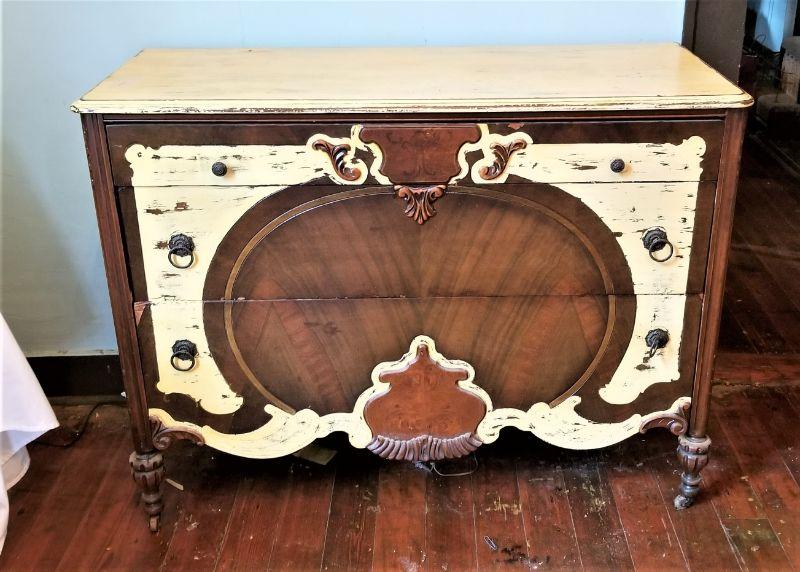 This antique dresser has been painted but has all the original hardware, castors, etc. A solid piece of furniture. Small piece of veneer missing (see photo). 48" across, 19" deep, 36" tall. OAK. Dates from around 1920 or so.