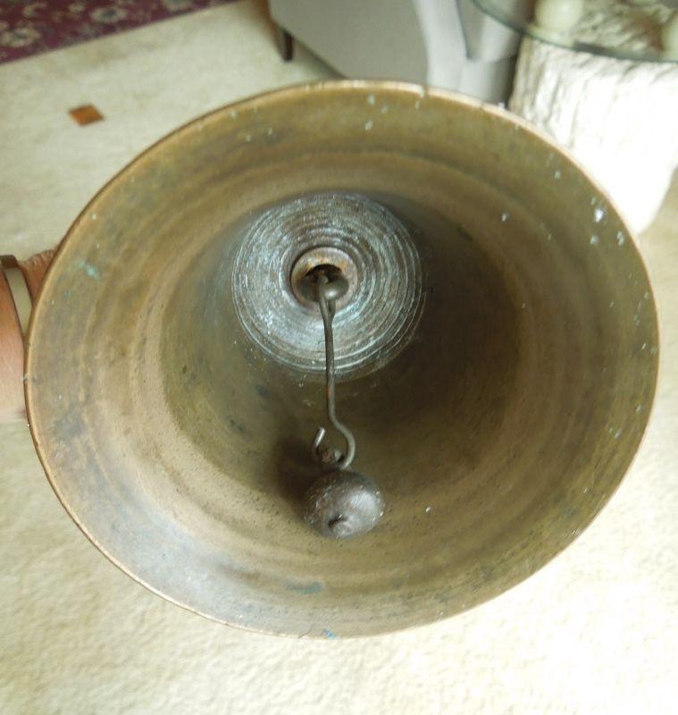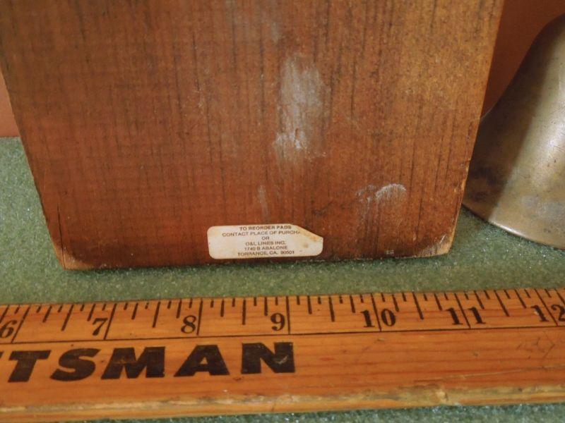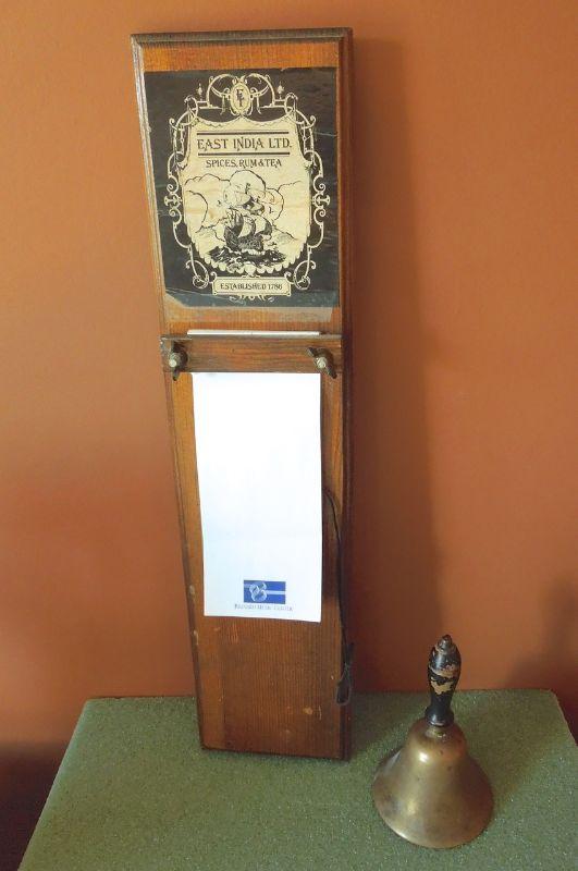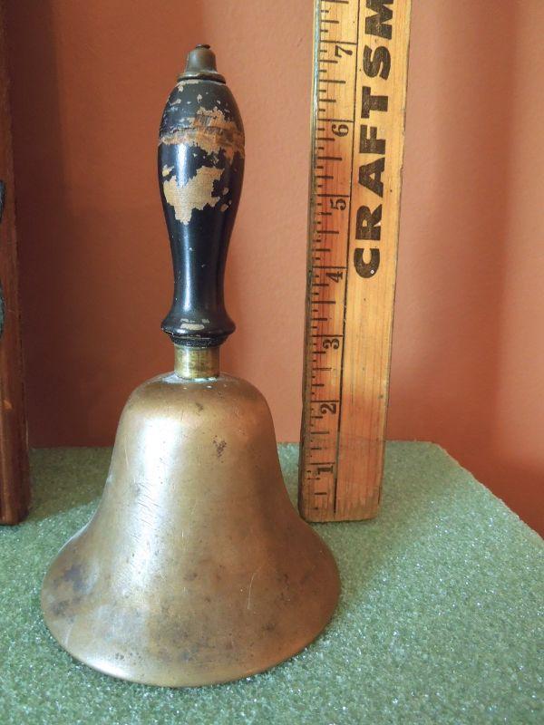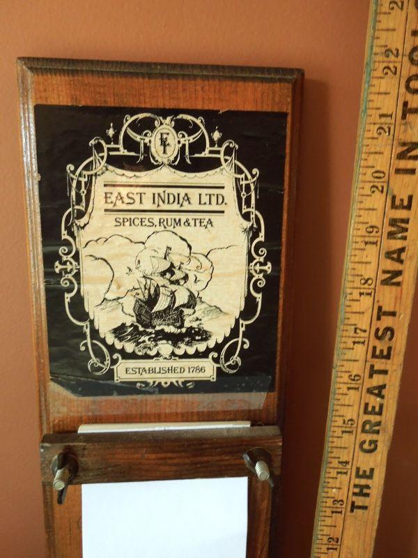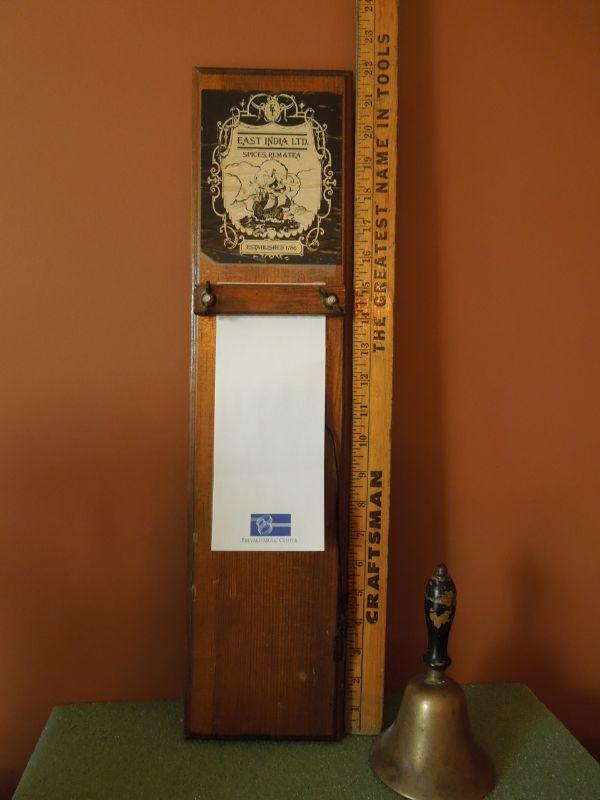 Worn black paint on brass 7" school bell. Original clabber. No dents.Nice patina. Reproduction 22" wood wall mounted grocery list pad holder with decoupaged decal of East India Spice and Tea Co,
