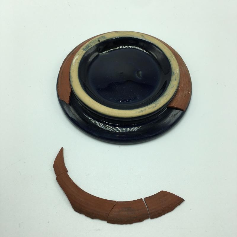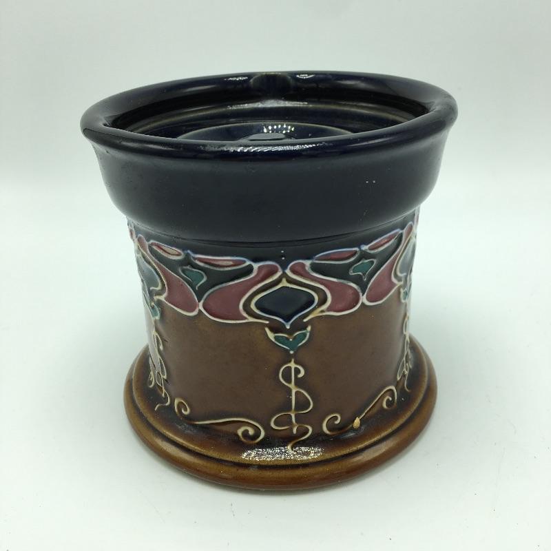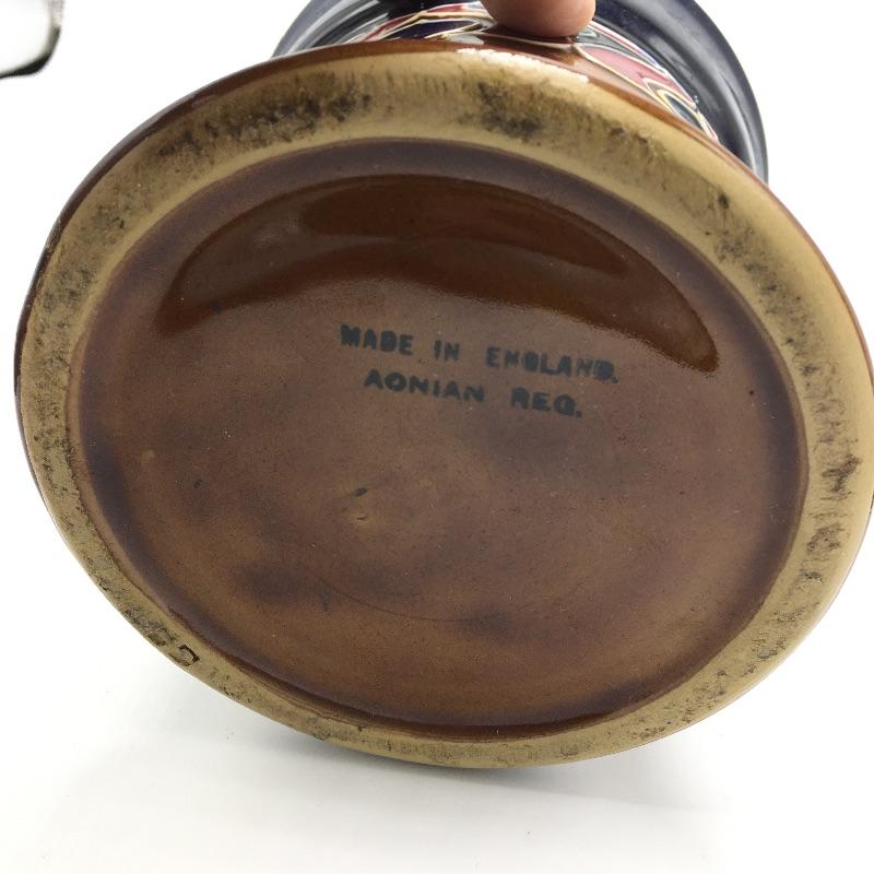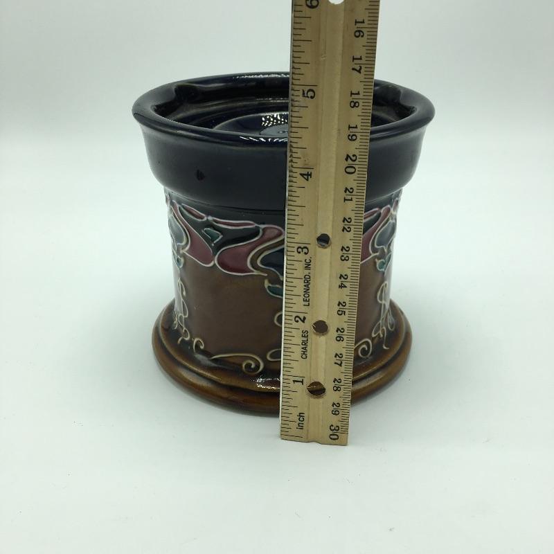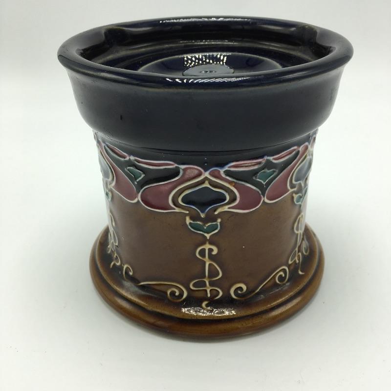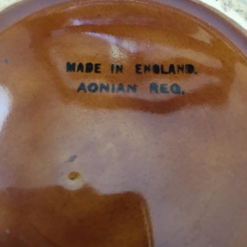 Aonian humidor made in England. Humidor marked 'Aonian' - understood to be made by Bourne Denby 1930s era. Humidor is missing fastener and has a piece of a rubber seal broken on underside of lid. Humidor measures 4.75”D x 4.5” tall.