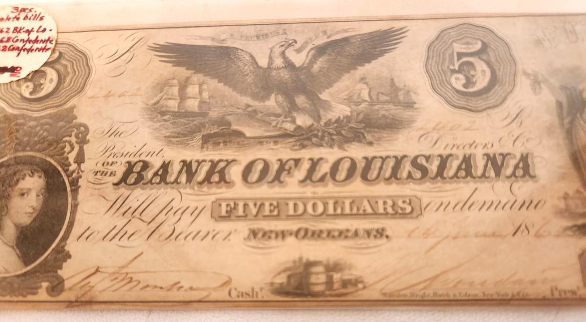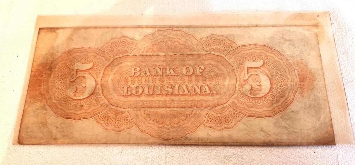 Authentic Civil War era Bank of Louisiana (New Orleans) $5.00 note - issued 14 June 1862. Antique condition.