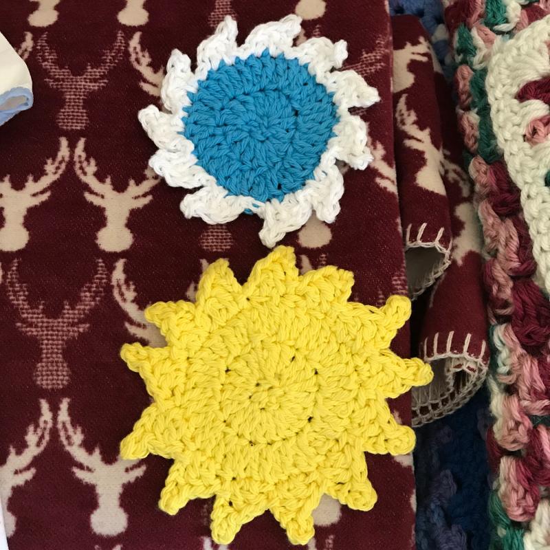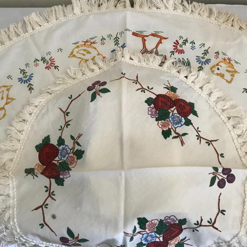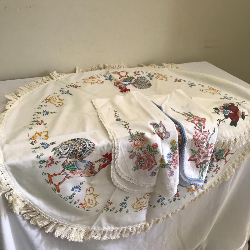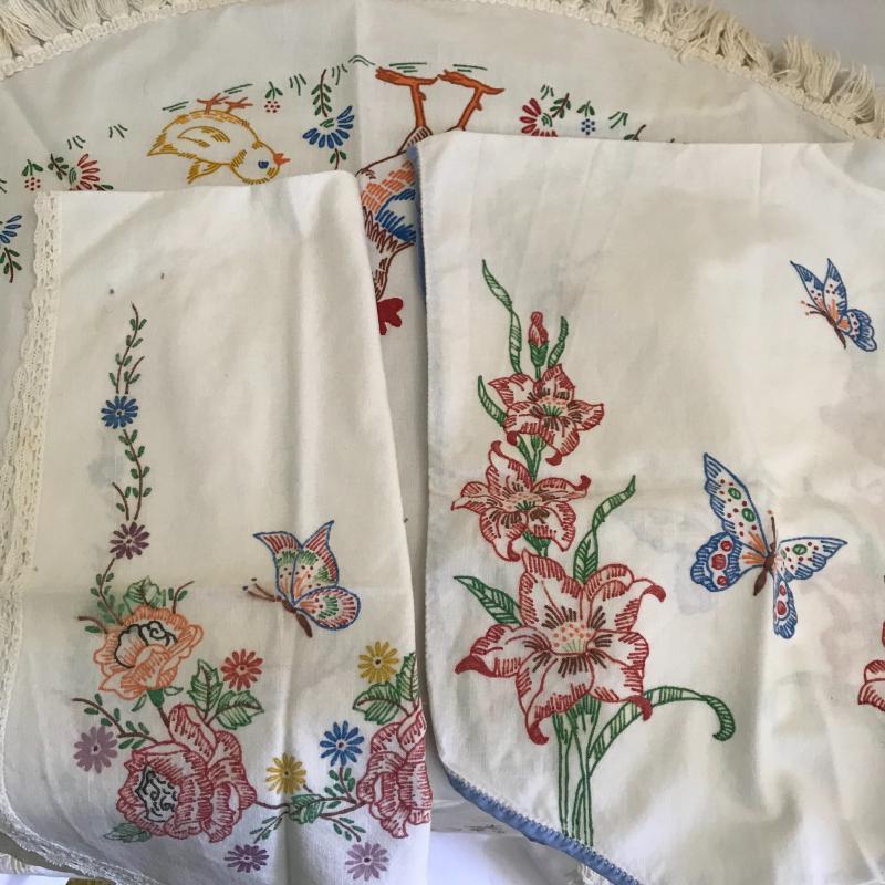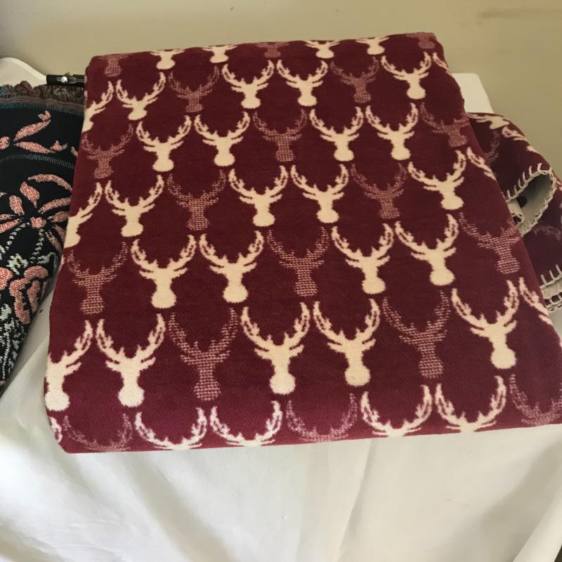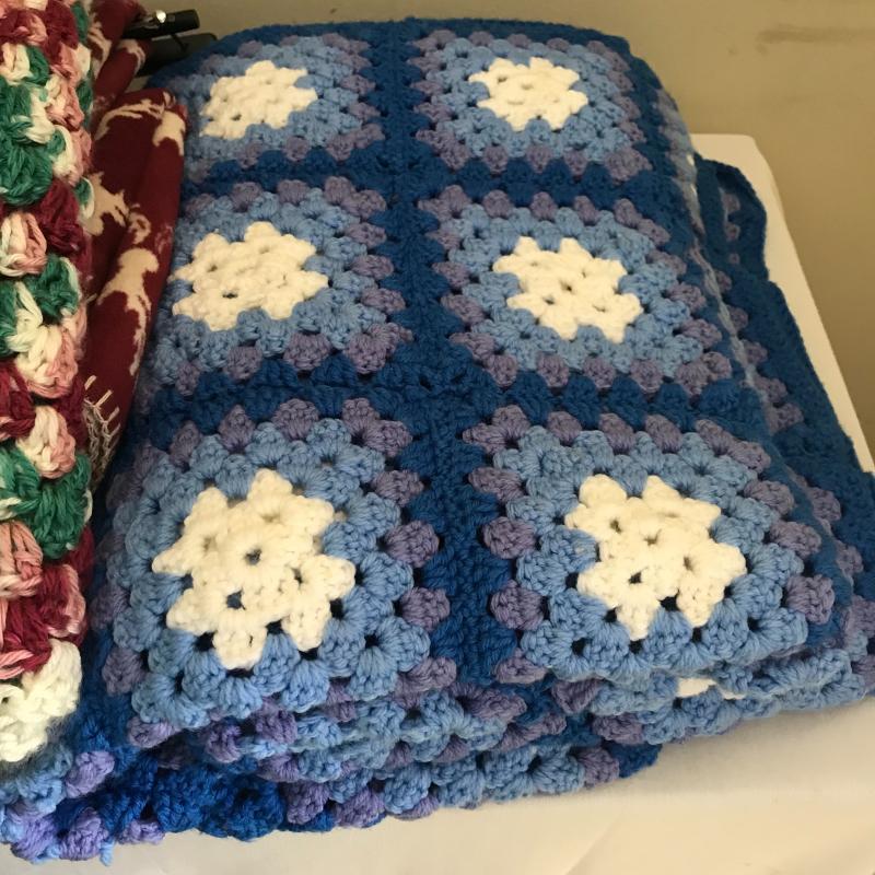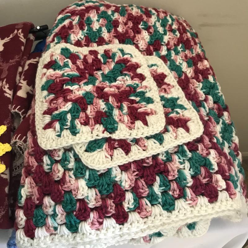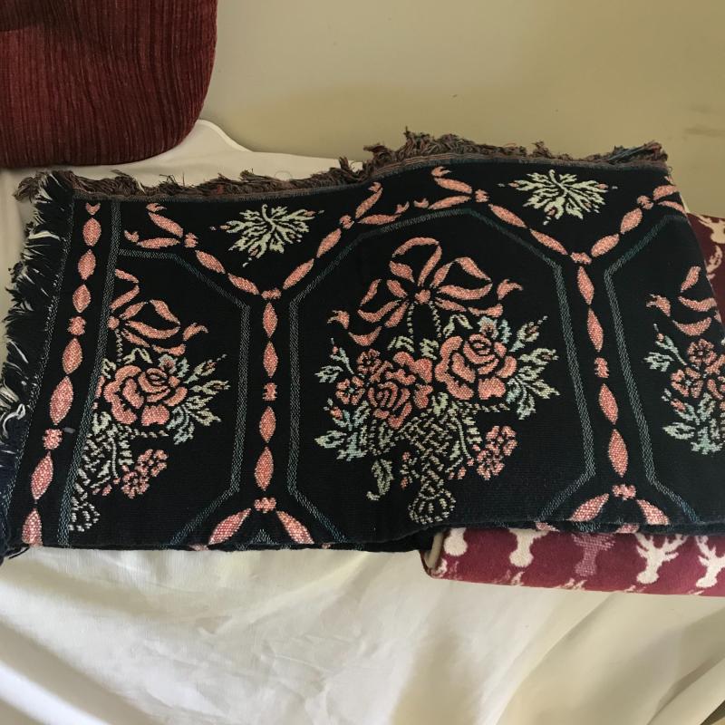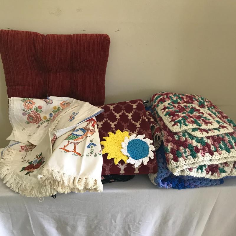Lot includes two colorful Afghans, two throw blankets, one still with shopping tags, a seat cushion still with plastic wrapping, two trivets along with two tea towels and two table covers, large one has some spots, see photos. Local pick up only.