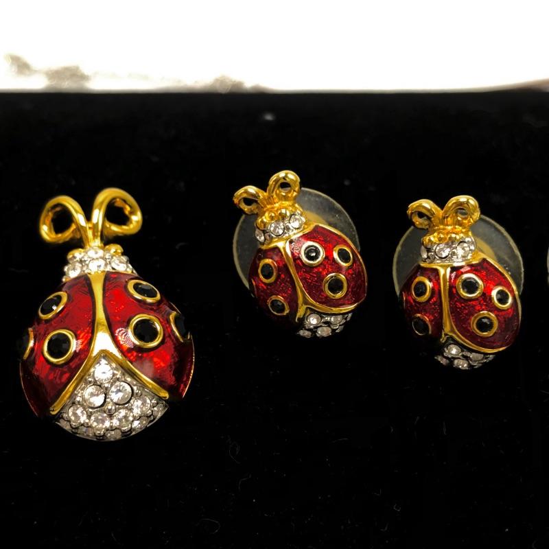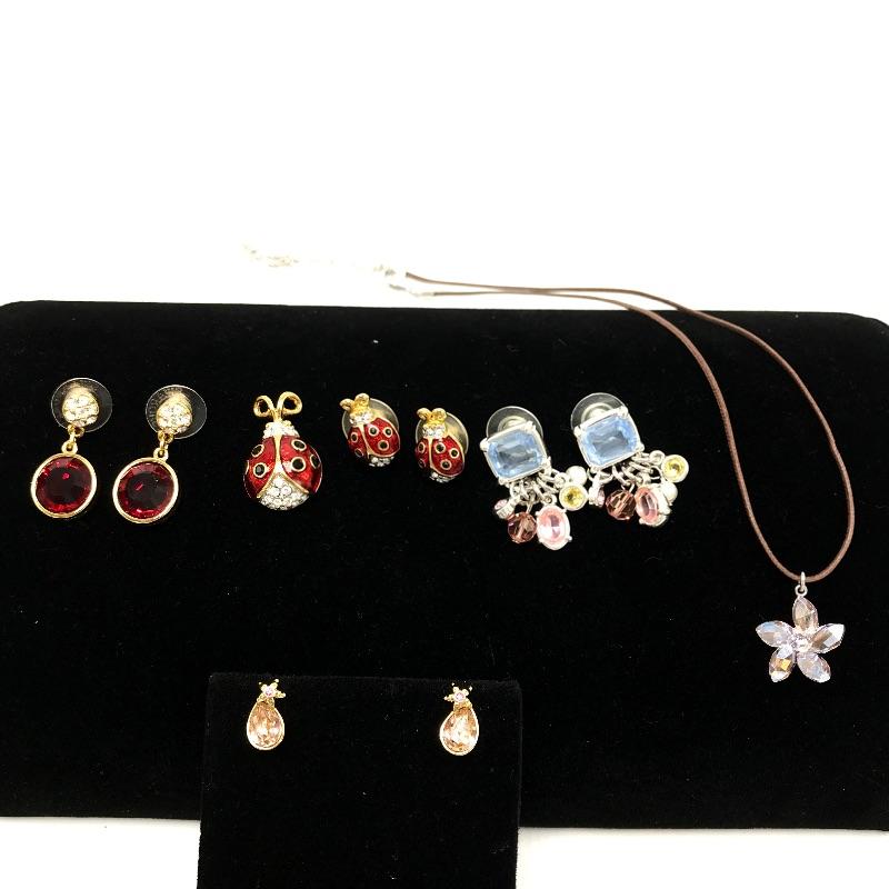 Crystal clarity of Swarovski! Lot includes matching Ladybug pendants and earrings, three other pairs of earrings for pierced ears and one floral pendant on a linen cord necklace. All pieces have the signature Swarovski swan mark. See photos.