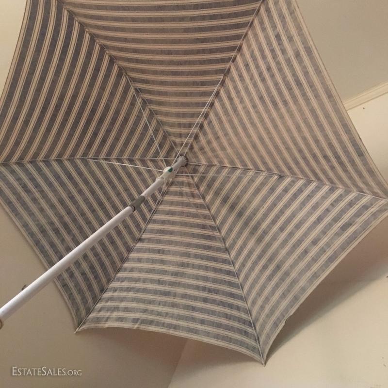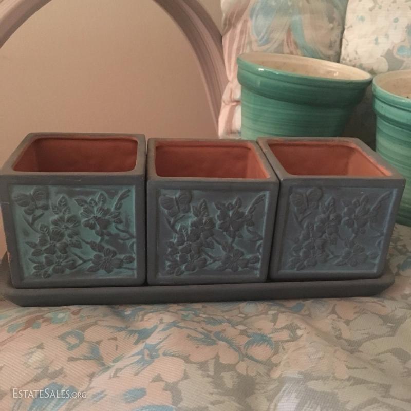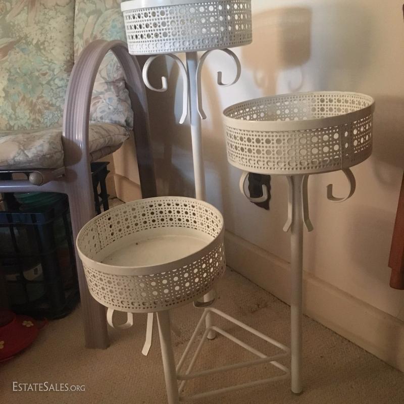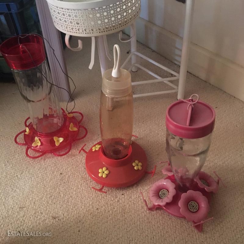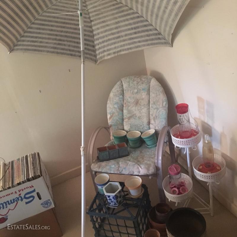 Single aluminum patio chair with cushion. Beach umbrella. Metal 3 plant stand. Ceramic planters. Humming Bird feeders.