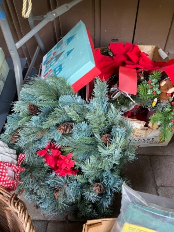 Lot 156. Huge assortment of Christmas décor, two trees, baskets, crafting supplies, folding boxes, cards, ribbon, ornaments; some Thanksgiving--$55