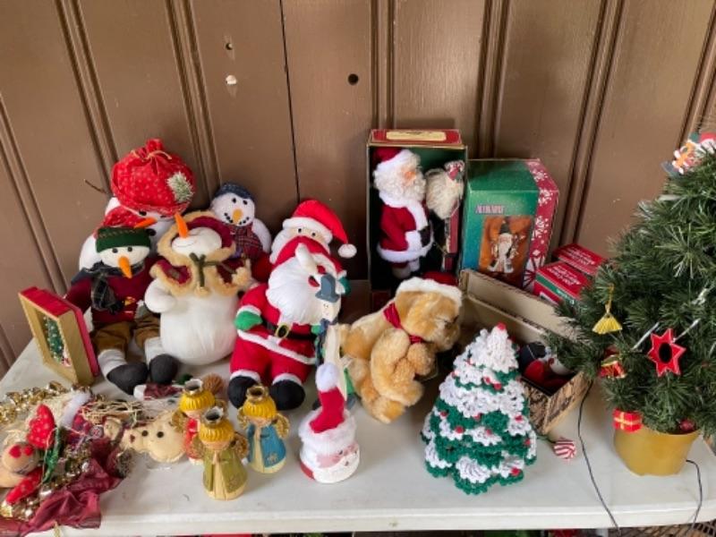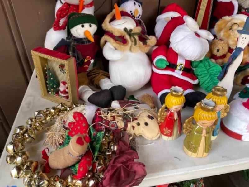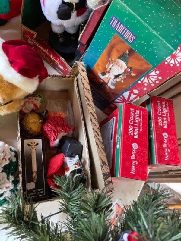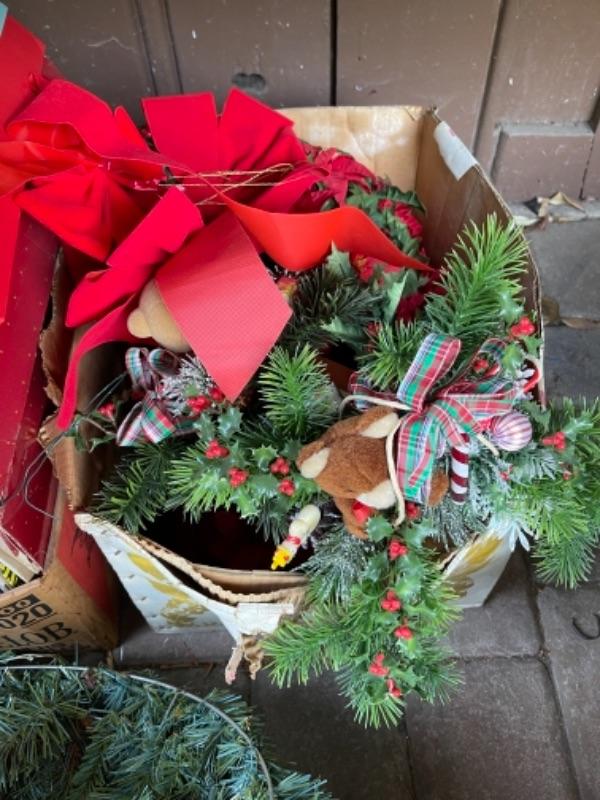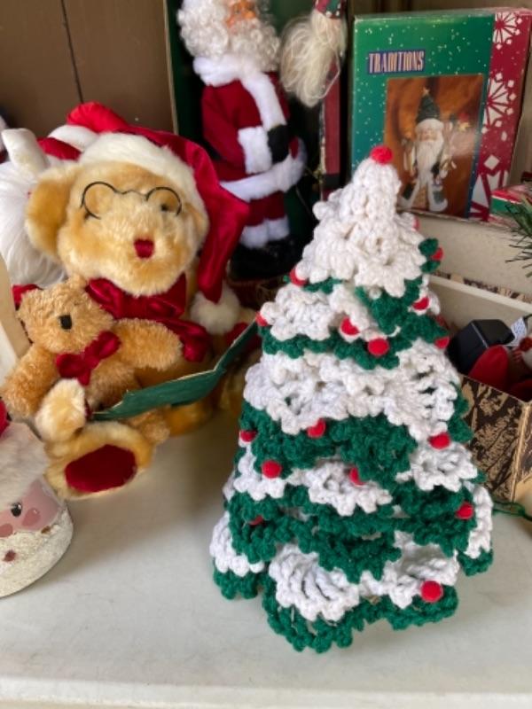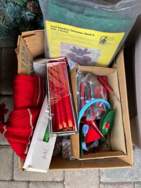 Lot 156. Huge assortment of Christmas décor, two trees, baskets, crafting supplies, folding boxes, cards, ribbon, ornaments; some Thanksgiving--$30