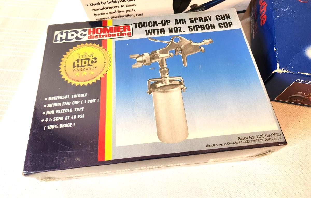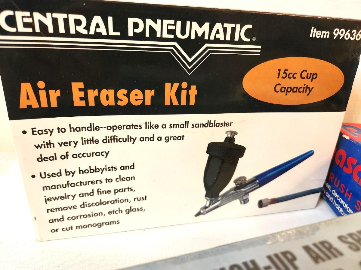 Everything an Airbrush artist could need! You get all you see here - Rouch up Air Spray gun - new in box, an Air Erase kit, and a Single Action Airbrush set.