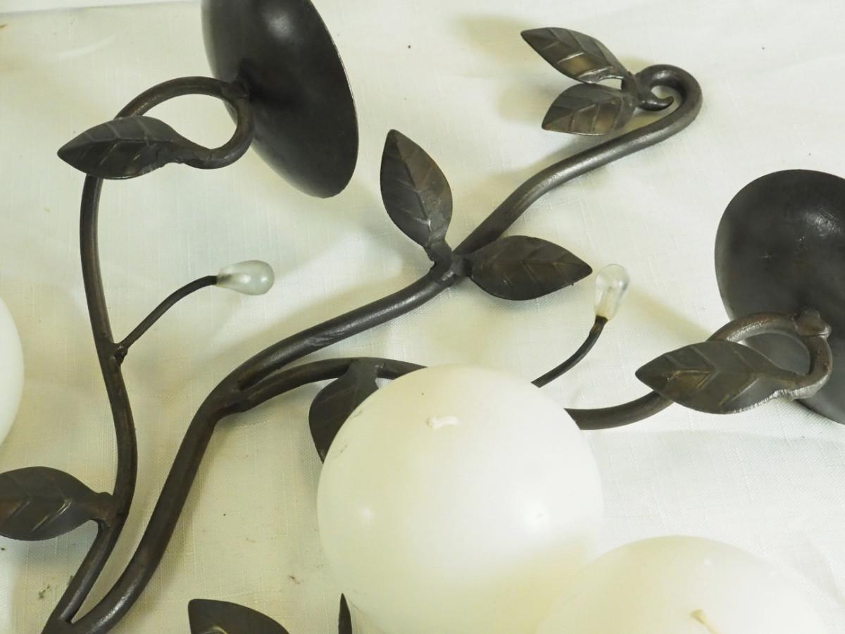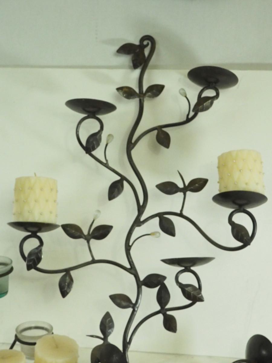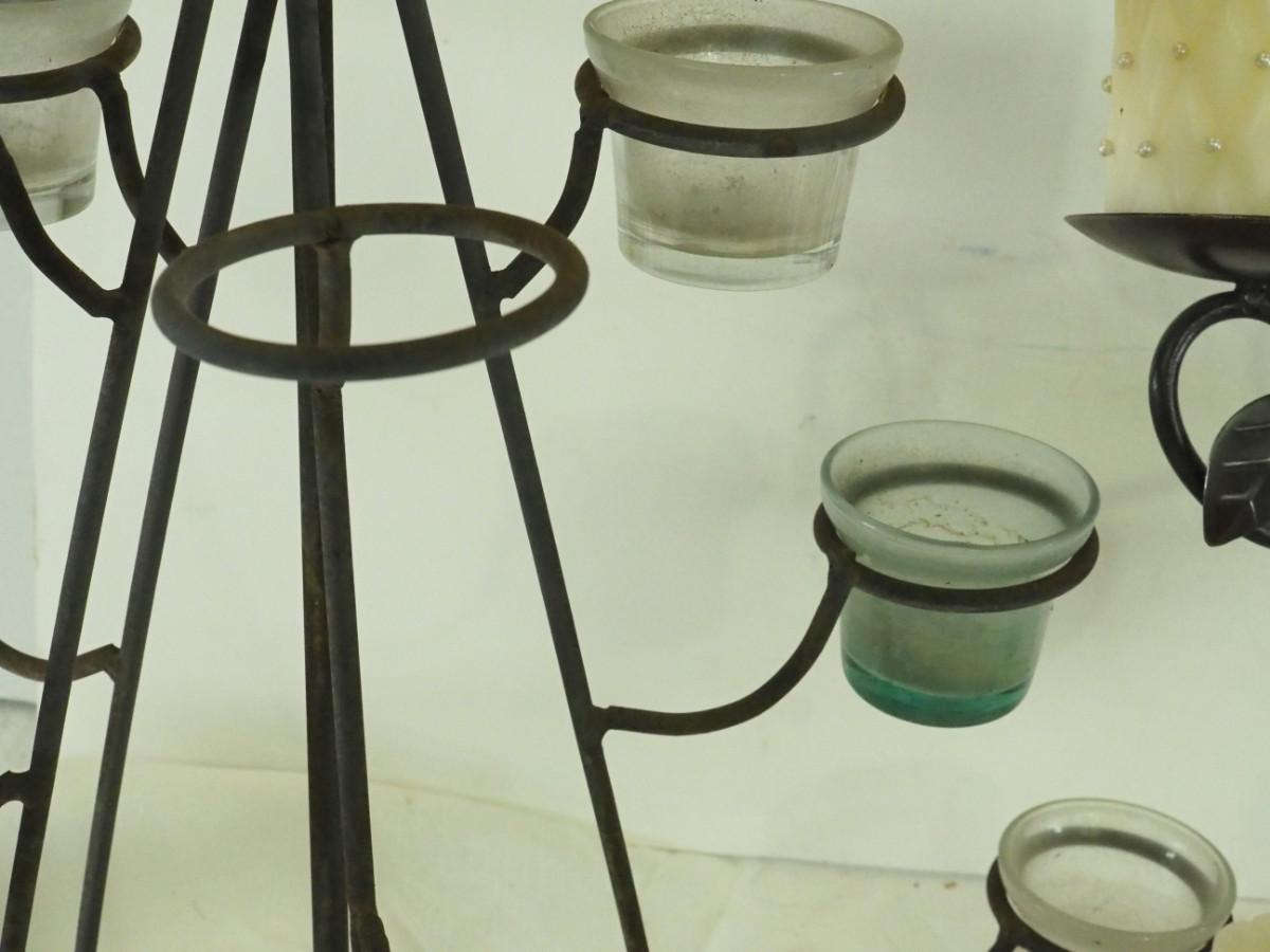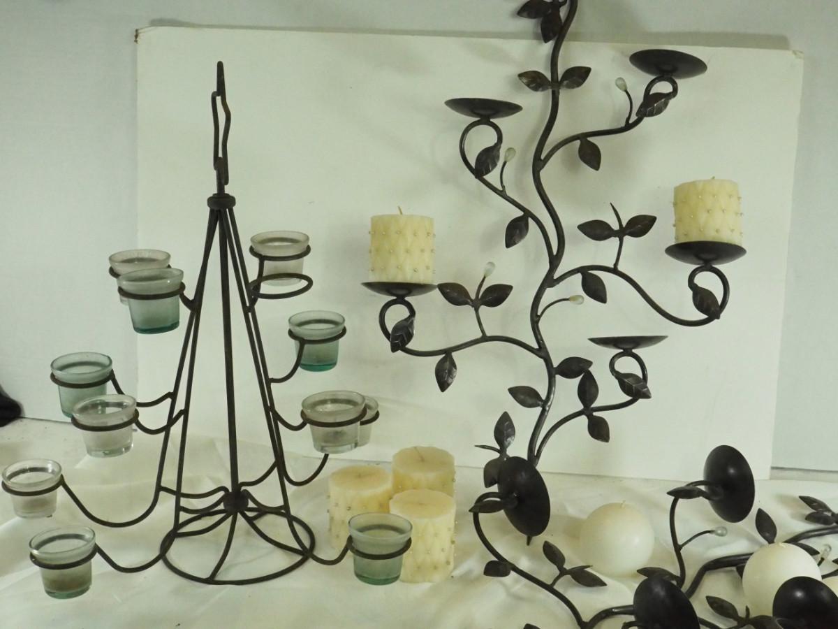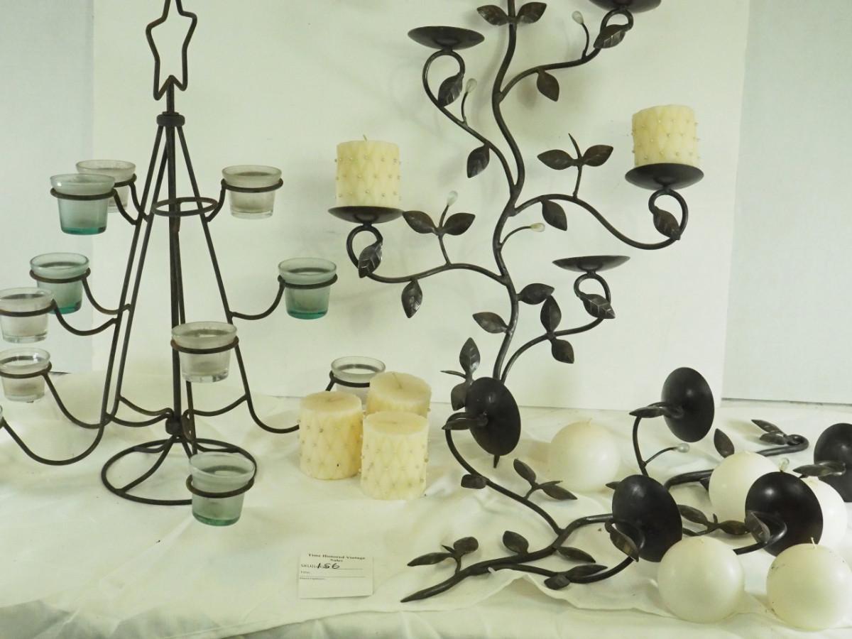 Lot 156- Metal vintage candle racks, White pear and round candles for hanging leaf racks. Star rack missing 1 glass cup.