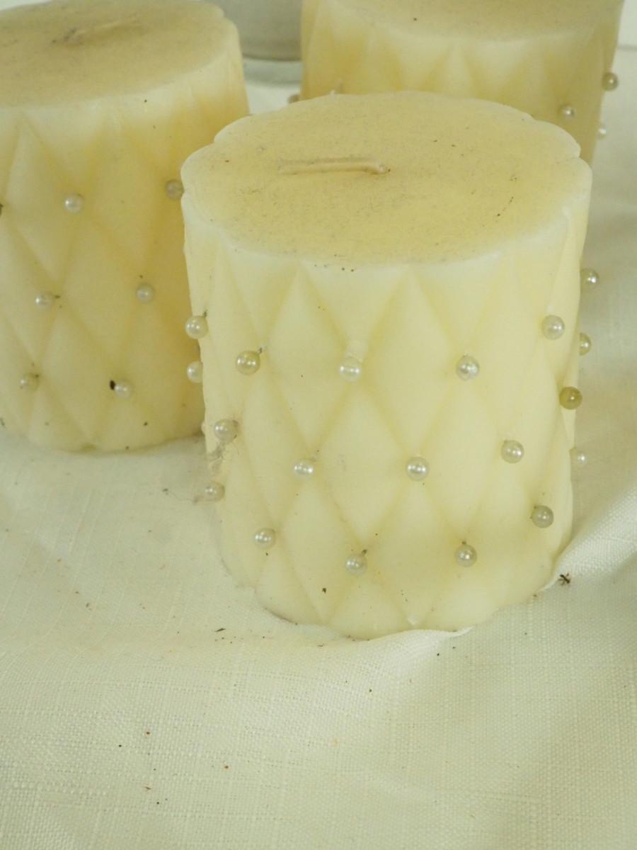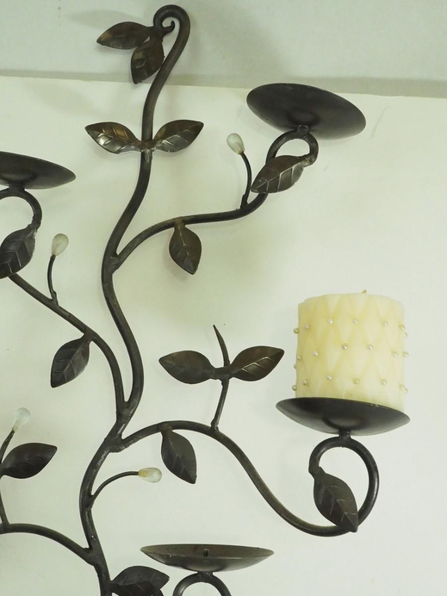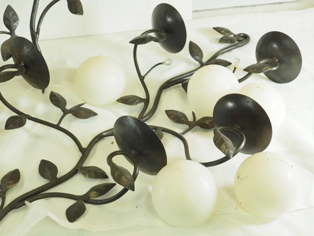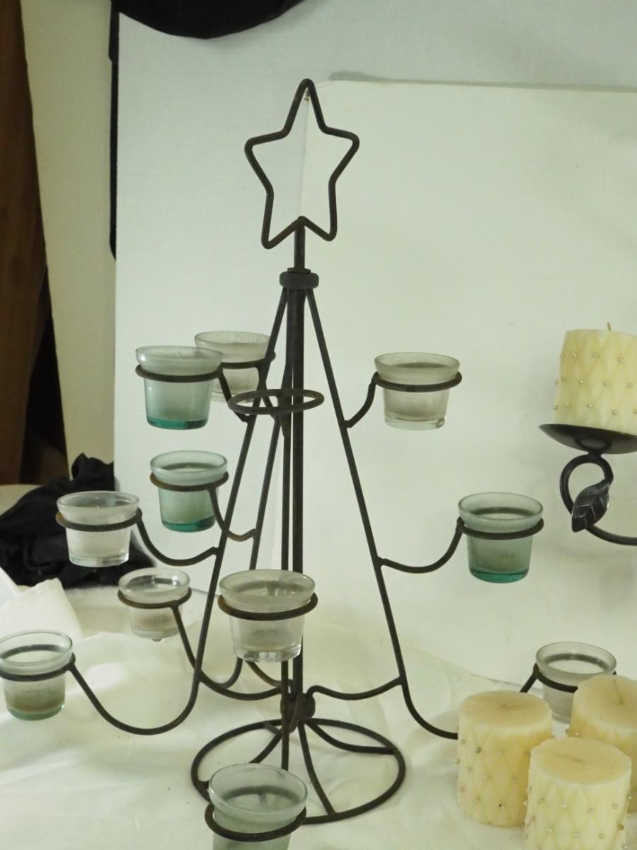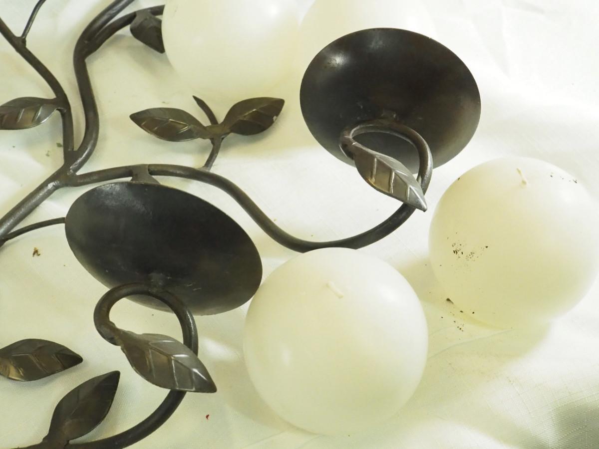 Lot 156- Metal vintage candle racks, White pear and round candles for hanging leaf racks. Star rack missing 1 glass cup.