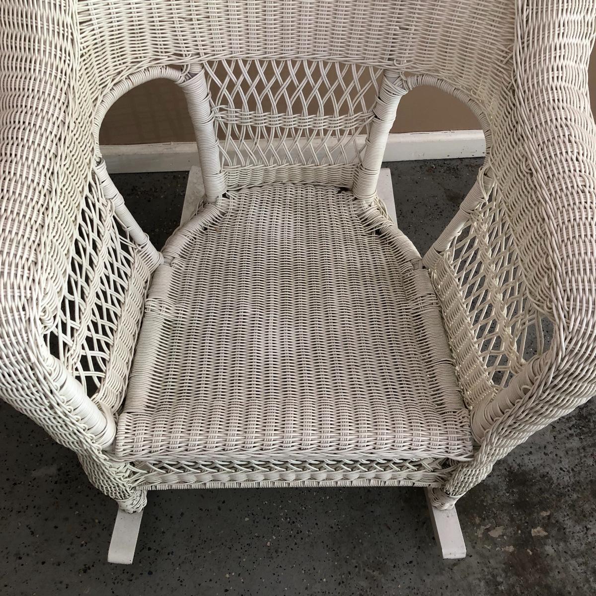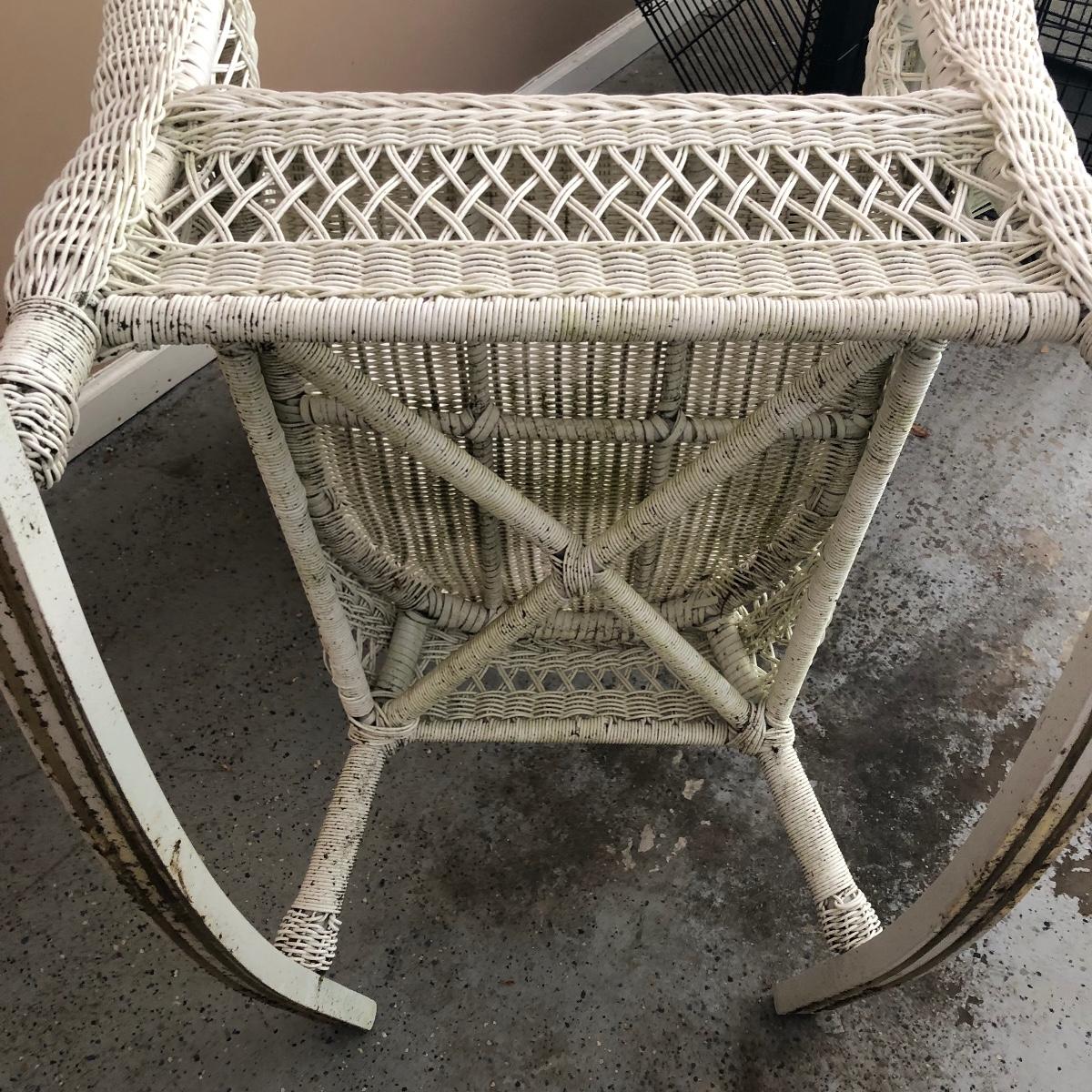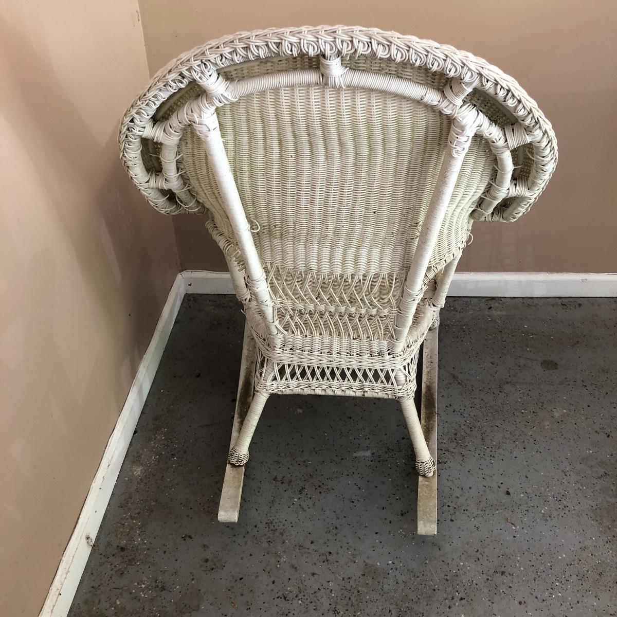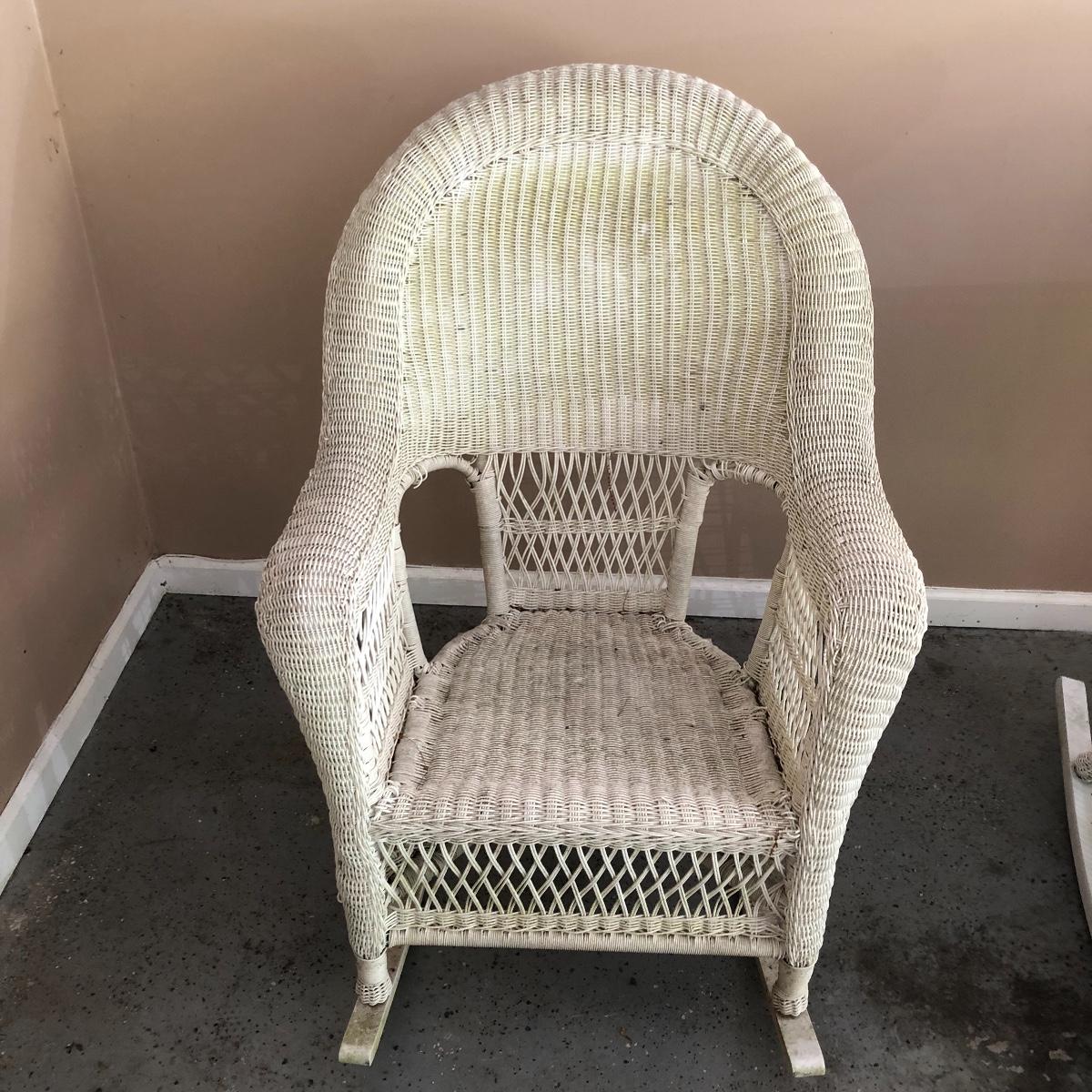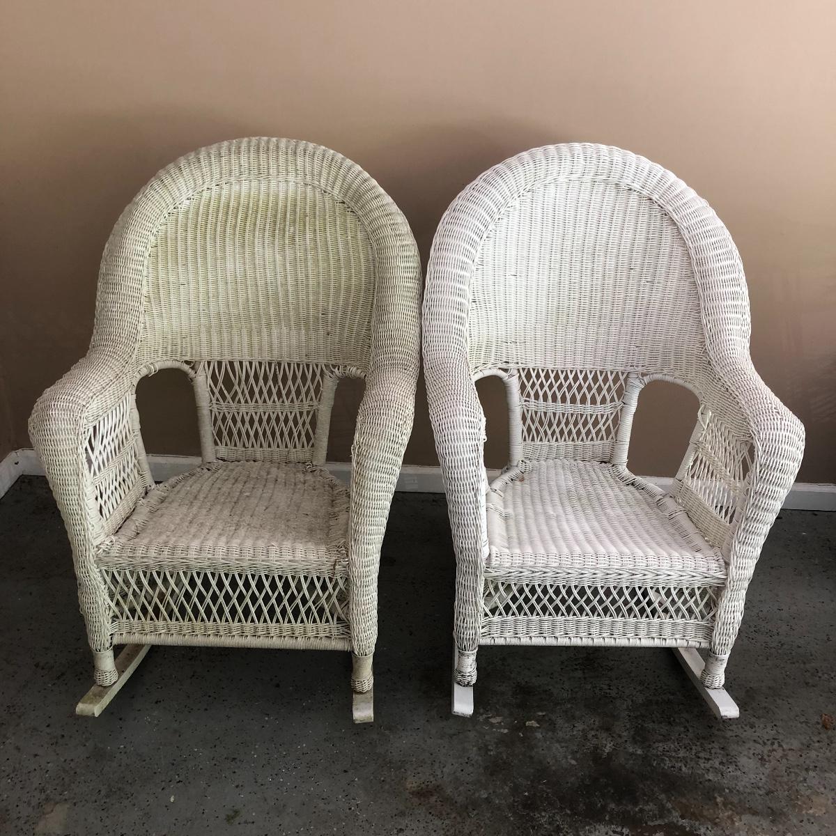 Sit back and rock away your worries with this dynamic duo. Lot includes two white wicker rockers. One is very white and has some dirt on the bottom. The second rocker has what appears to be mildew and has a green tinge to it. We think it will clean up with a good wash, but we cannot guarantee it. Chairs measure 24” x 34” x 43” with a 16.5” seat height.
