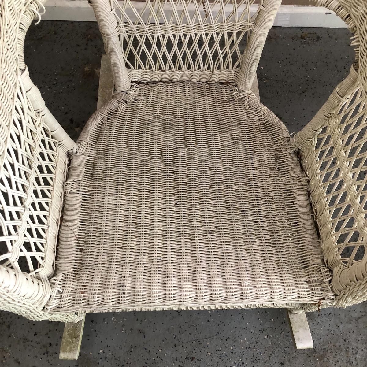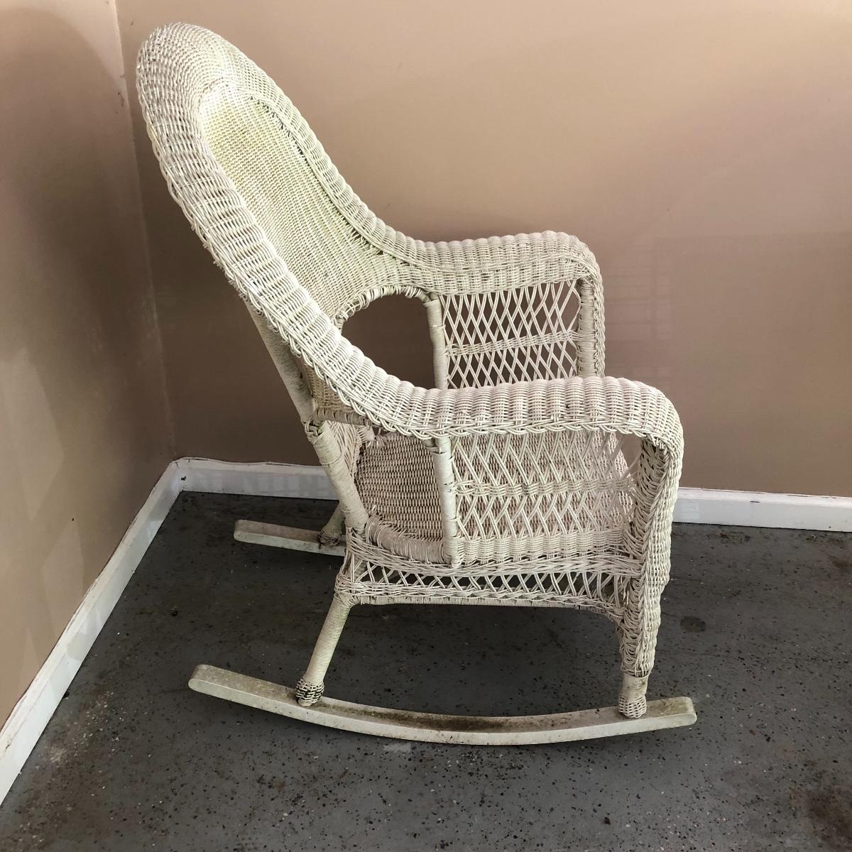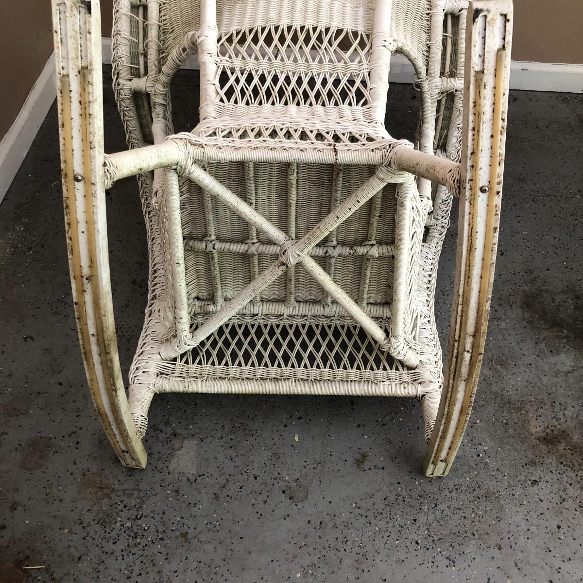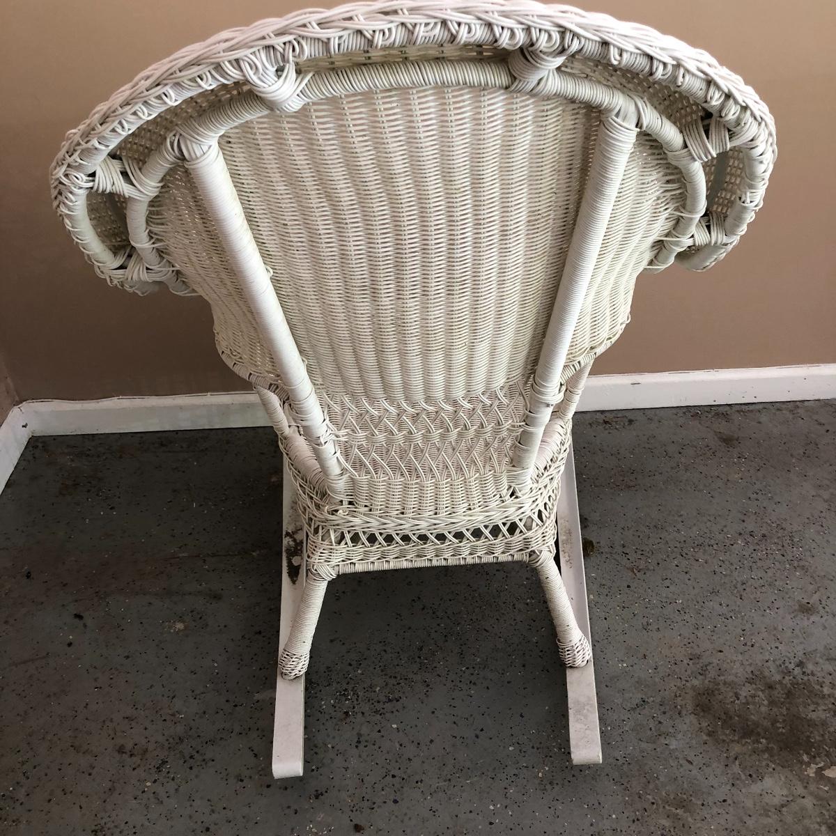 Sit back and rock away your worries with this dynamic duo. Lot includes two white wicker rockers. One is very white and has some dirt on the bottom. The second rocker has what appears to be mildew and has a green tinge to it. We think it will clean up with a good wash, but we cannot guarantee it. Chairs measure 24” x 34” x 43” with a 16.5” seat height.