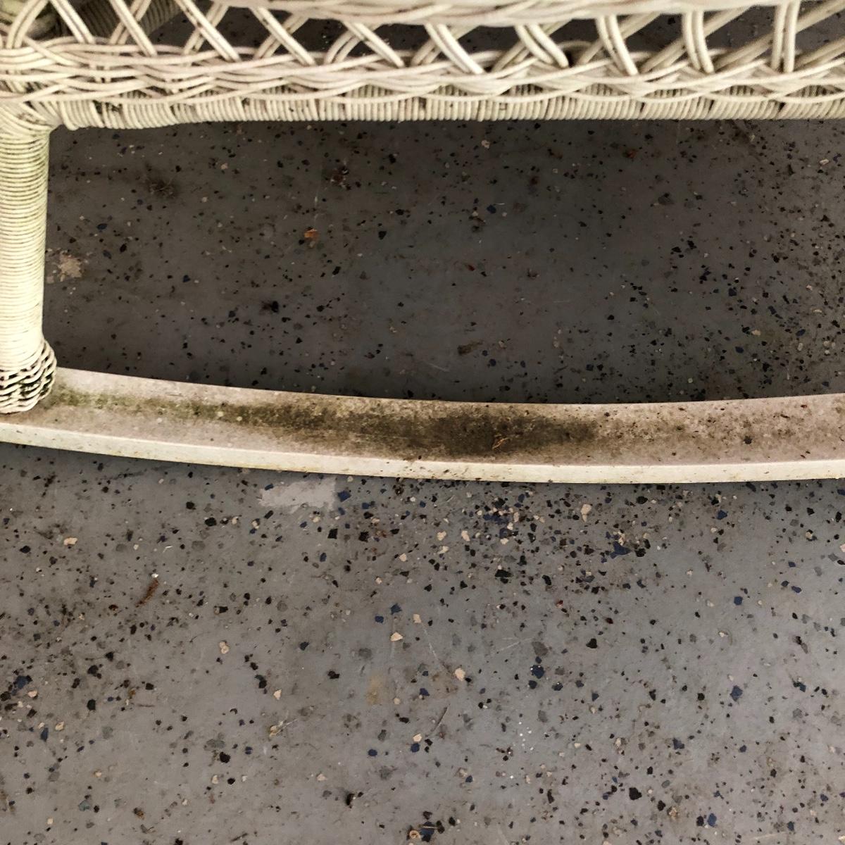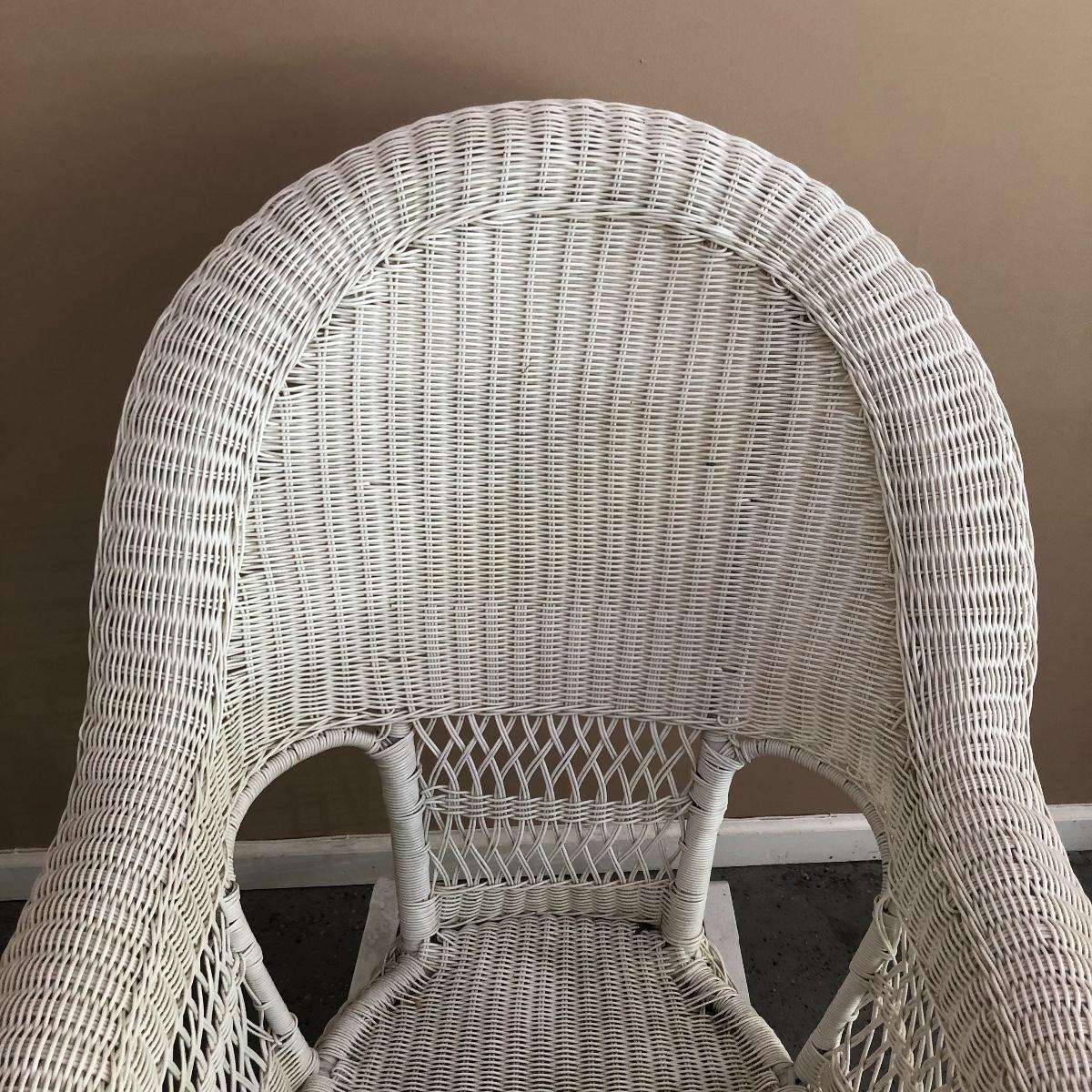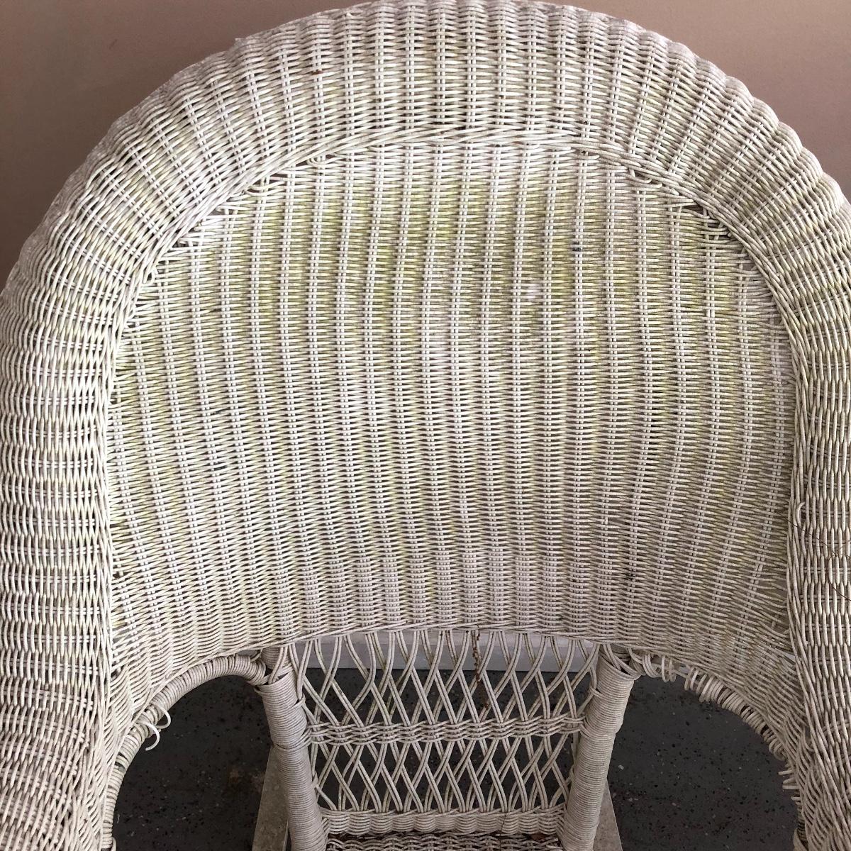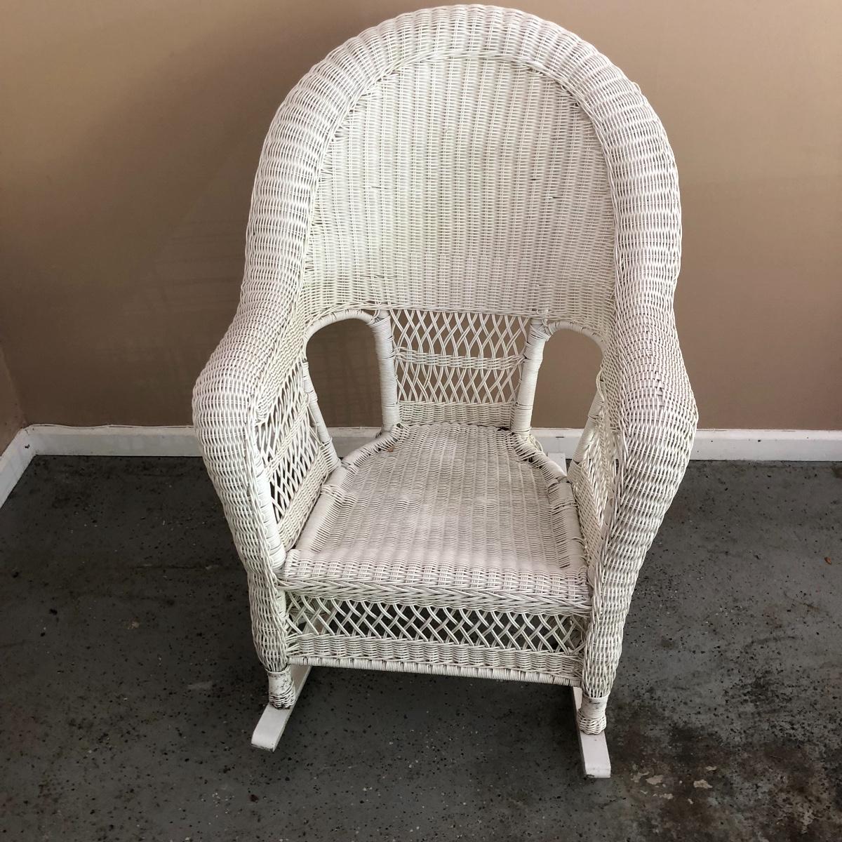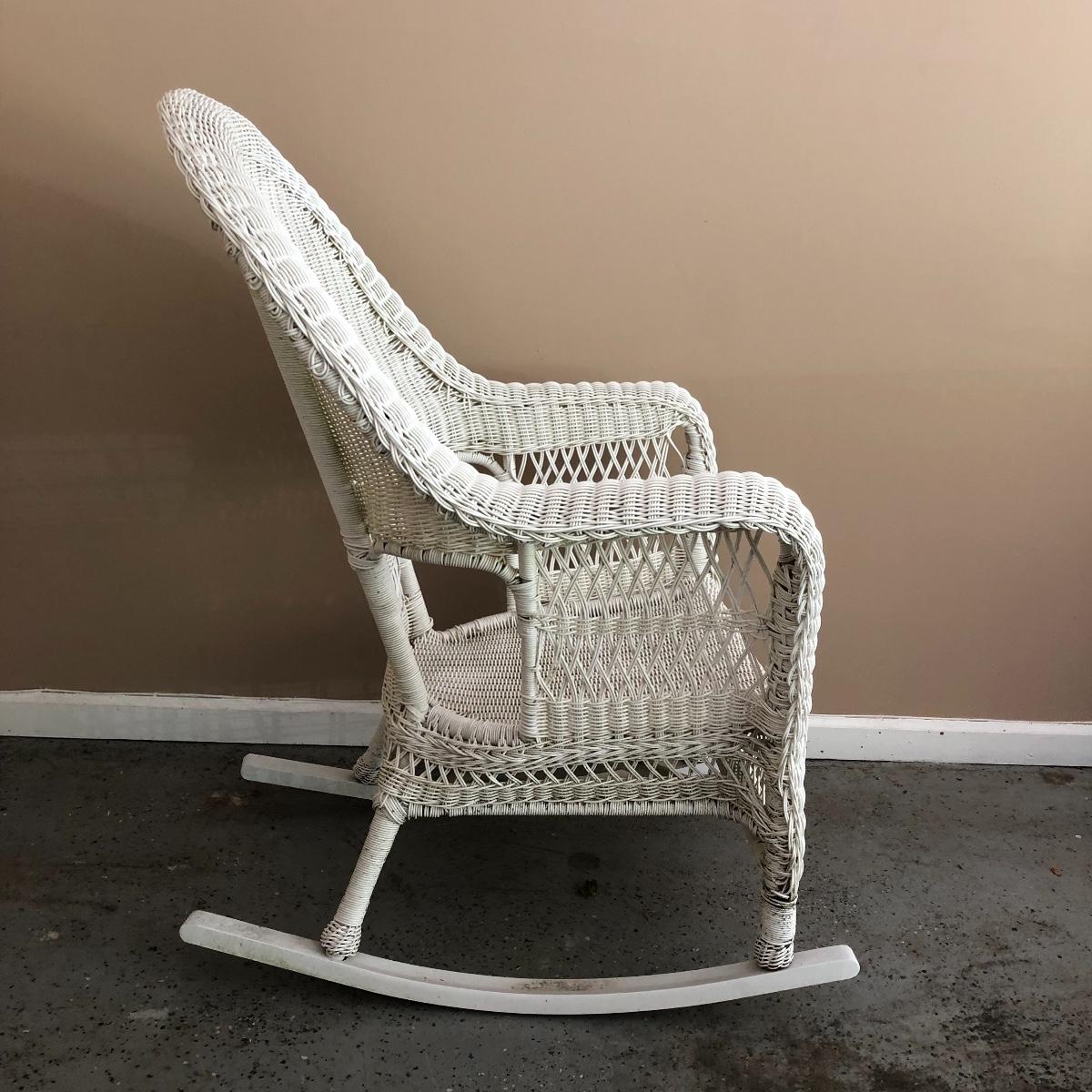 Sit back and rock away your worries with this dynamic duo. Lot includes two white wicker rockers. One is very white and has some dirt on the bottom. The second rocker has what appears to be mildew and has a green tinge to it. We think it will clean up with a good wash, but we cannot guarantee it. Chairs measure 24” x 34” x 43” with a 16.5” seat height.
