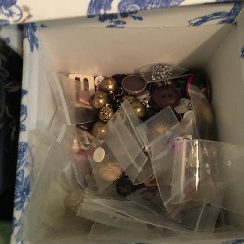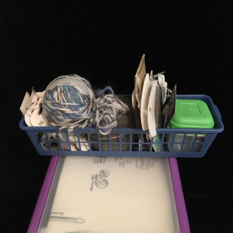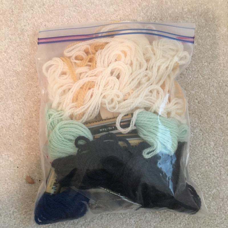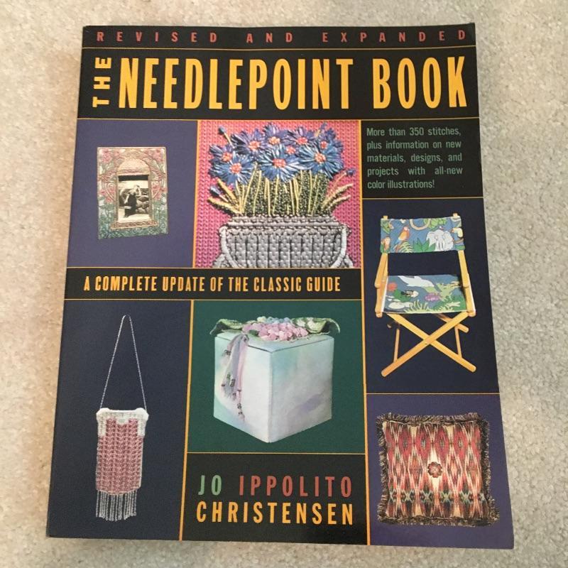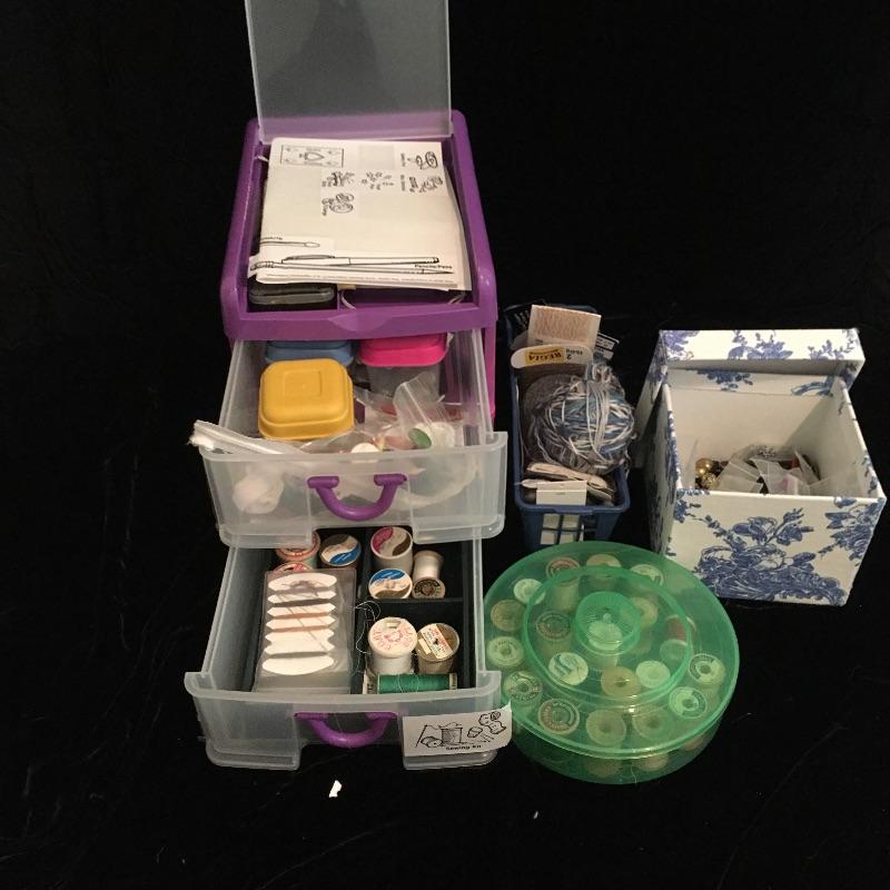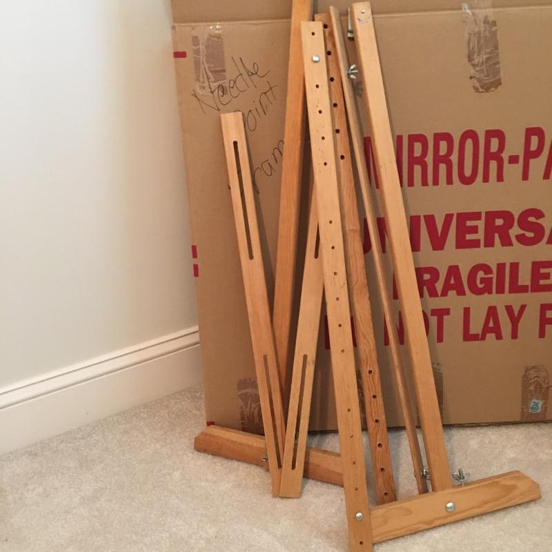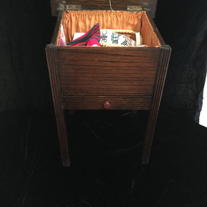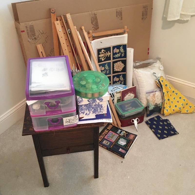 Sewing and needlepoint lot includes vintage wooden sewing box with contents. There are also pillows, pair of needlepoint frames, box with buttons and more, book, yarn and more. Sewing box top is split, it looks like an easy fix with some glue and clamps.