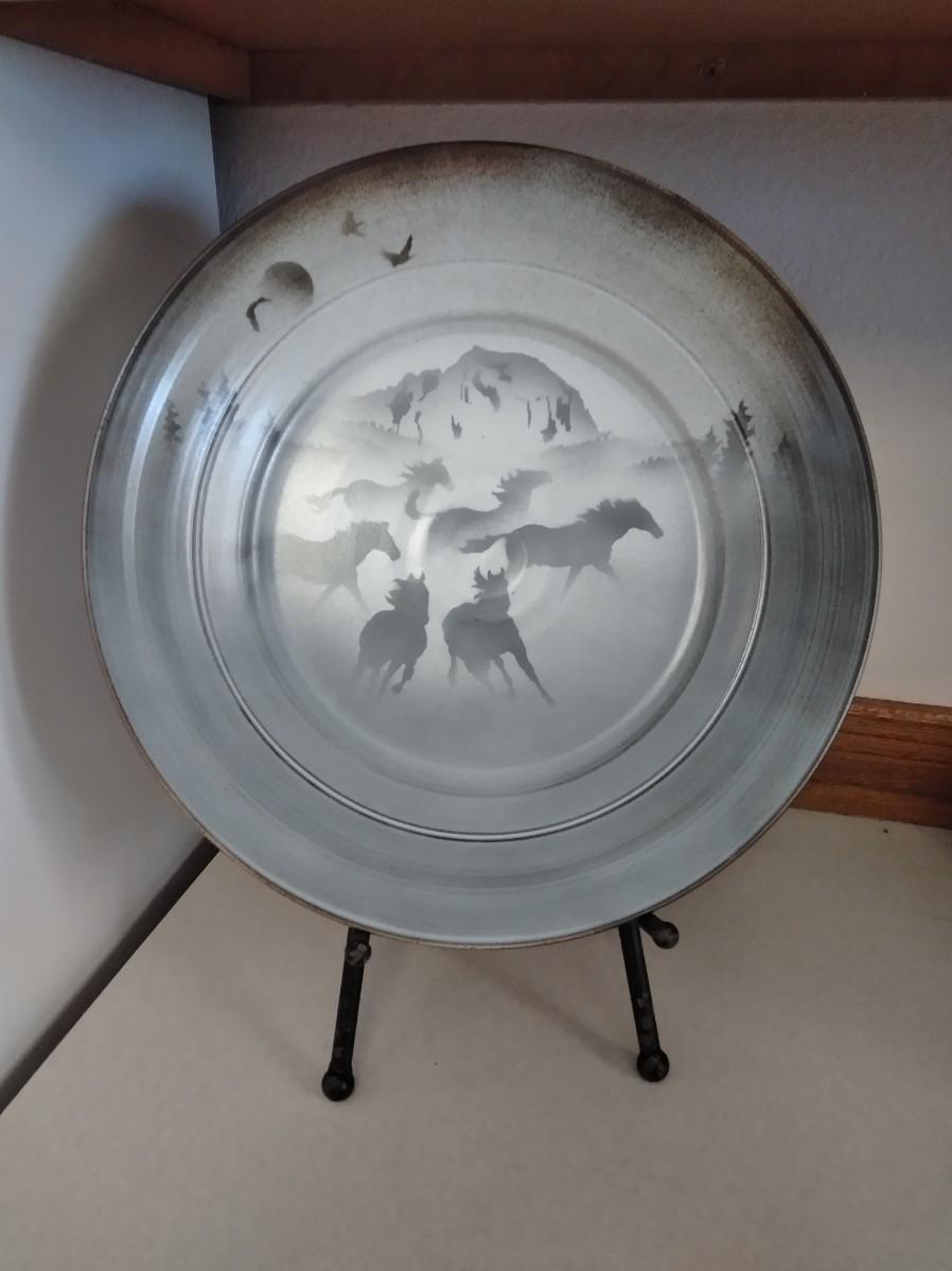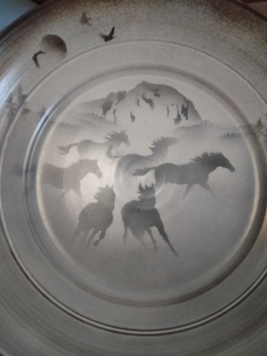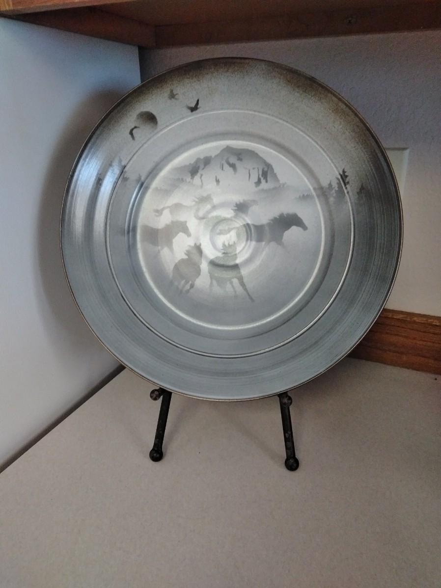 SIGNED POTTERY HORSE PLATTER WITH STAND