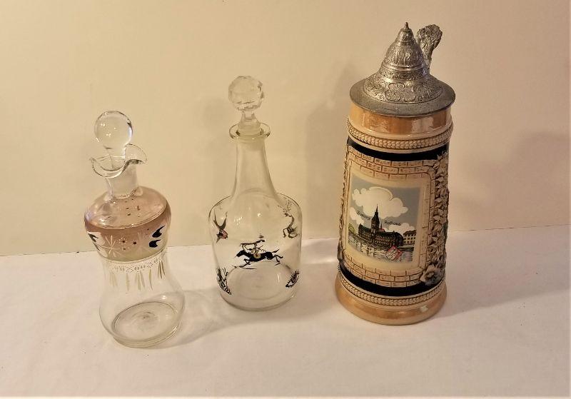 Lot #156  Two vintage small decanters and nice German Stein