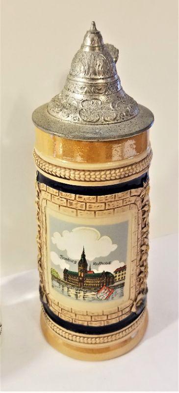 Three piece lot - two vintage small decanters along with a nice lidded stein. Stein marked West Germany and depicts the Rathhaus in Hamburg. It stands 11" tall. Both little decanters are about 9" tall.