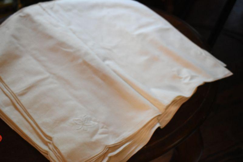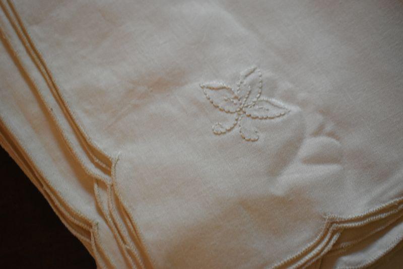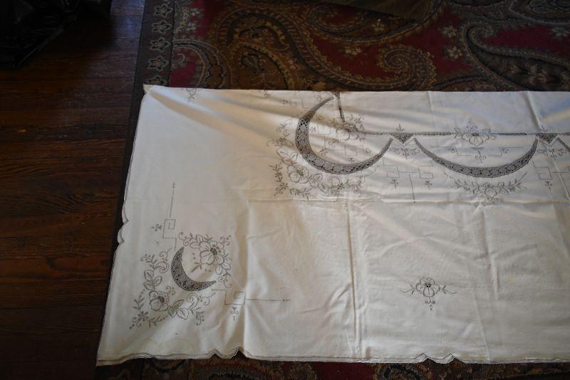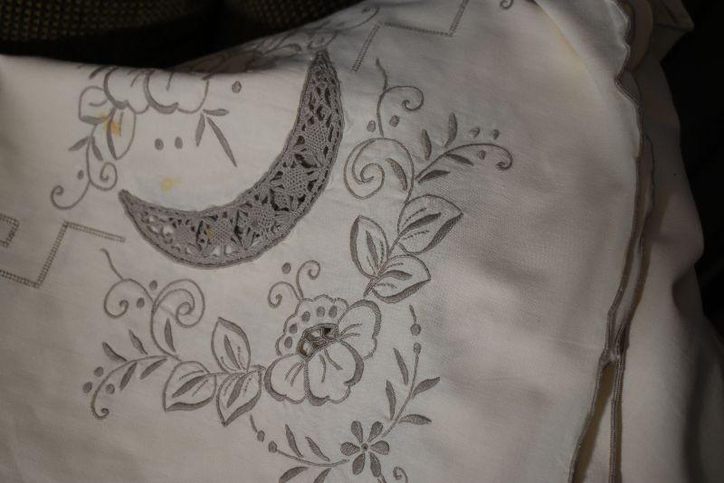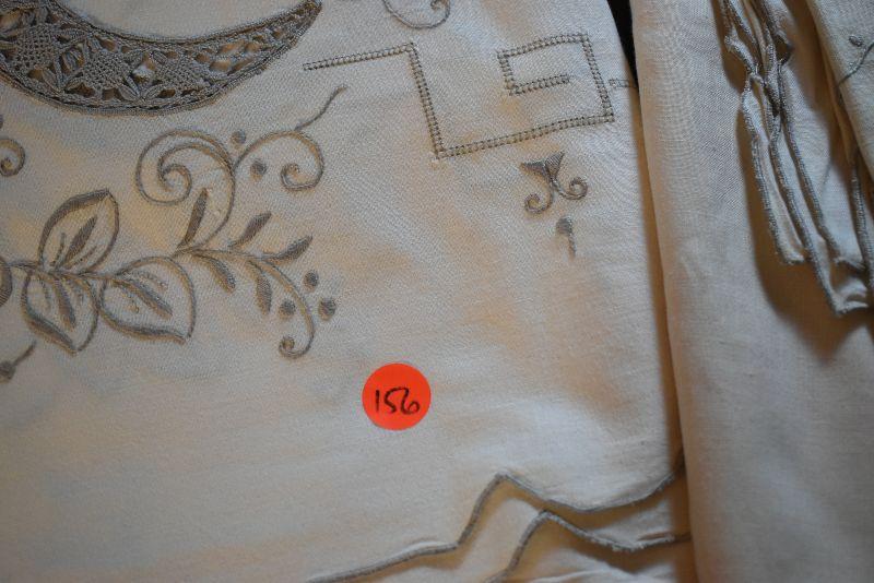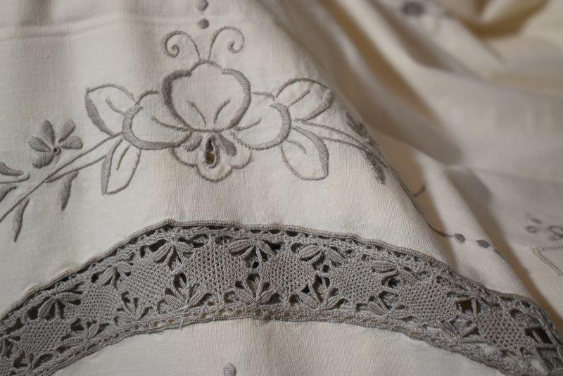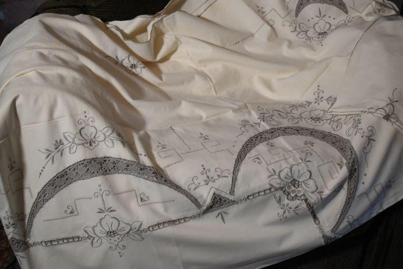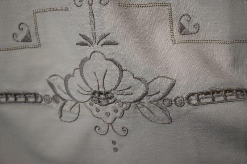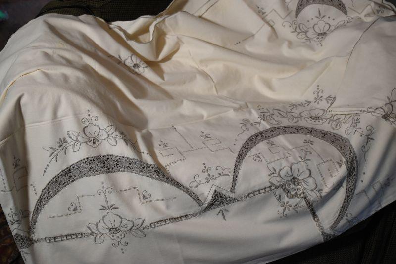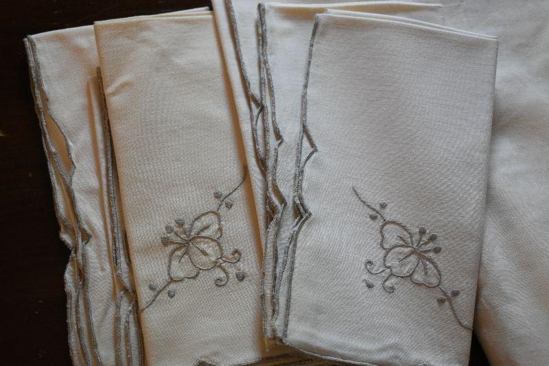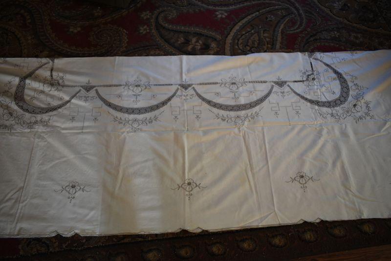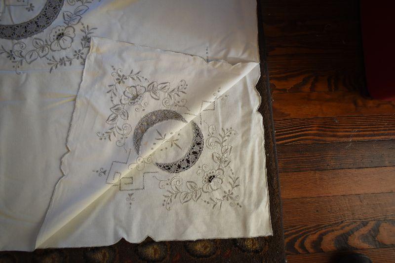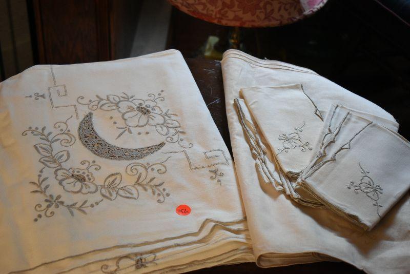 Table cloth and napkins with cutwork and gray embroidery. Also, a set of 12 of new linen napkins. Table cloth is 93x62.