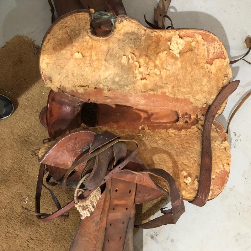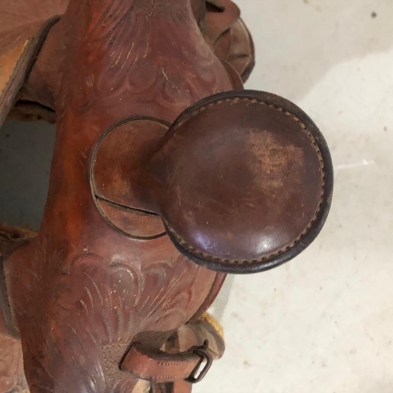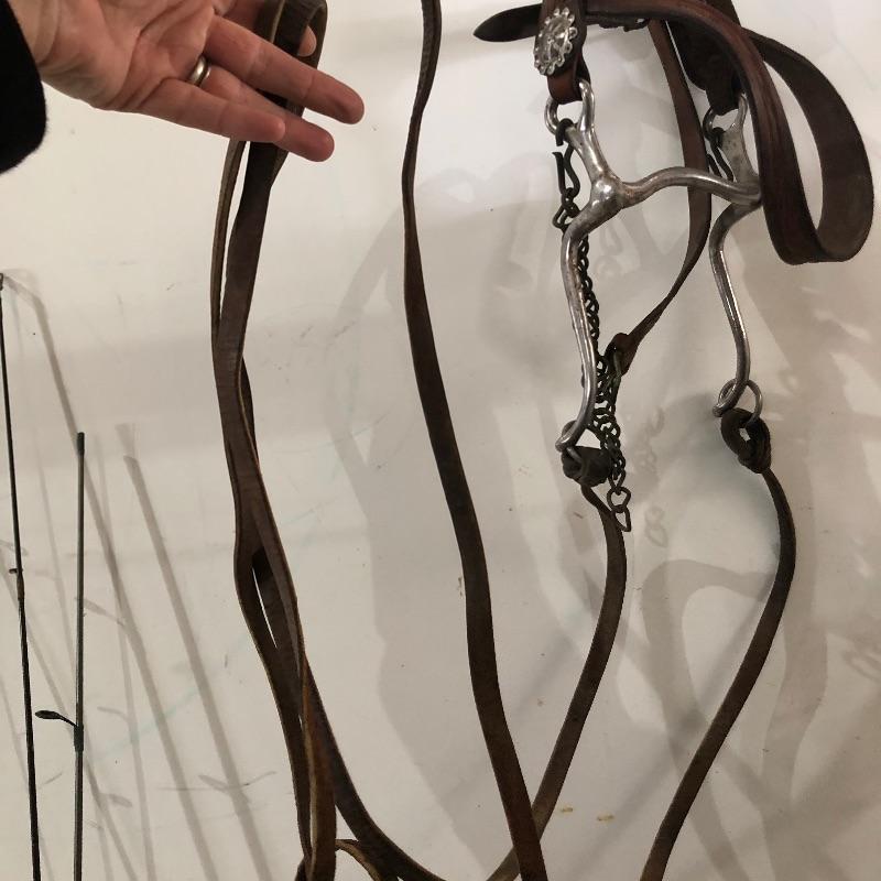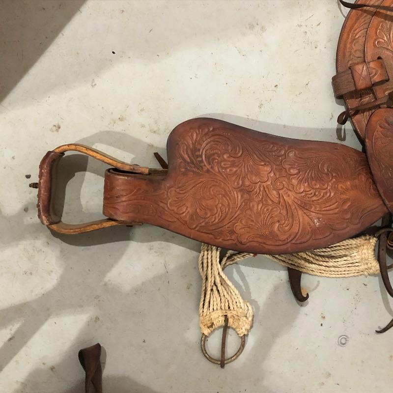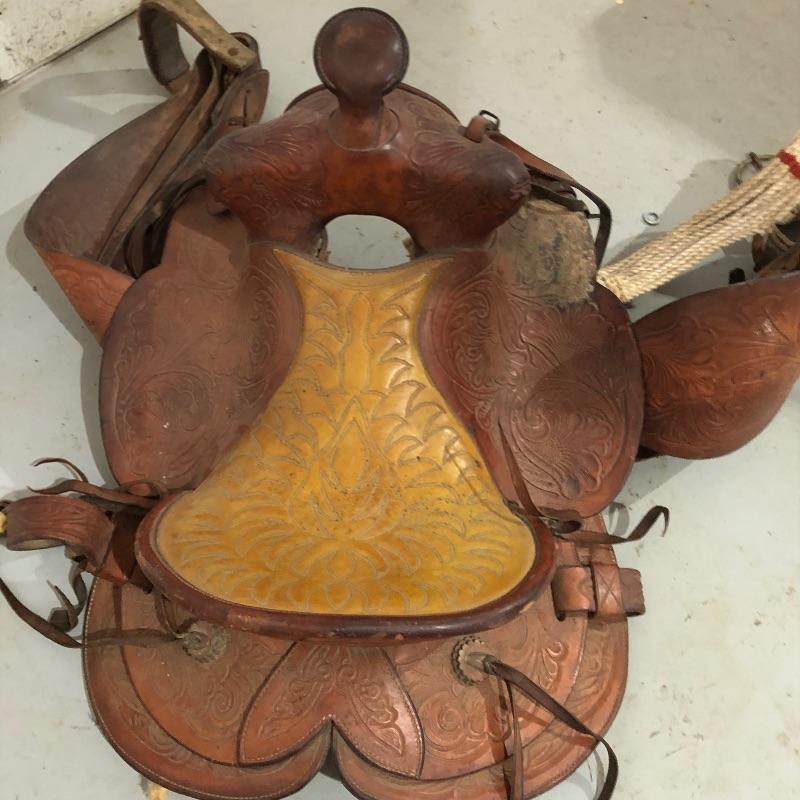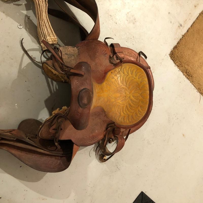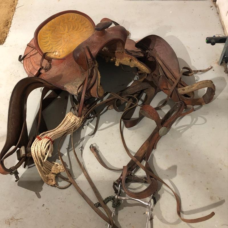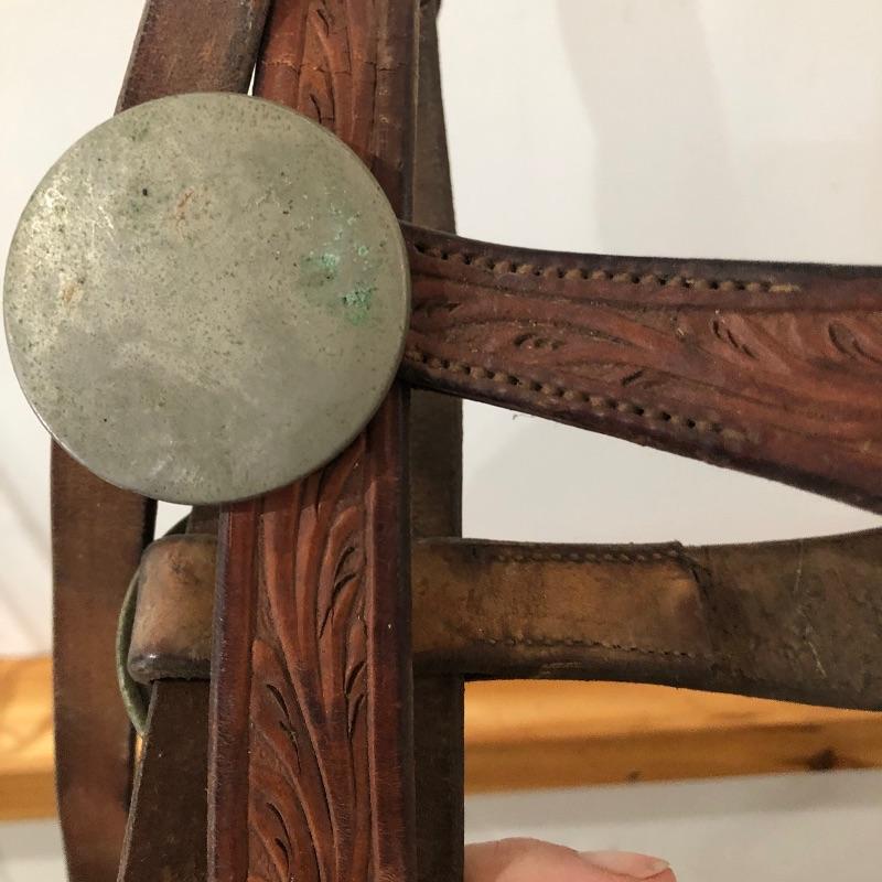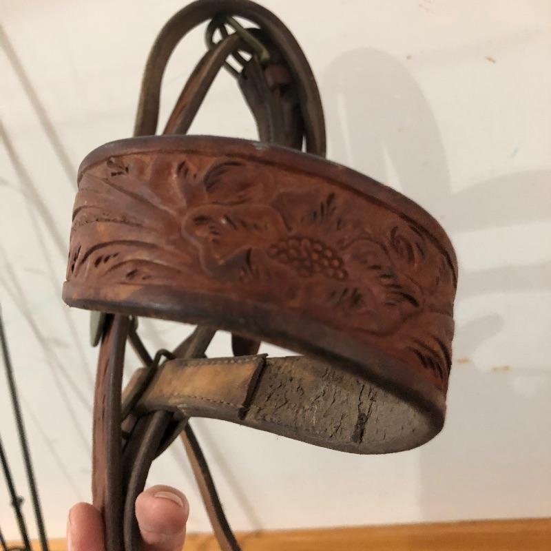 This leather western saddle has some handsome tool work and comes with a cinch and more. It could do with a good clean and oiling. Images show the thin padding that is missing in places on the underside. We have paired this with a leather western-bit bridle with raw hide reins.