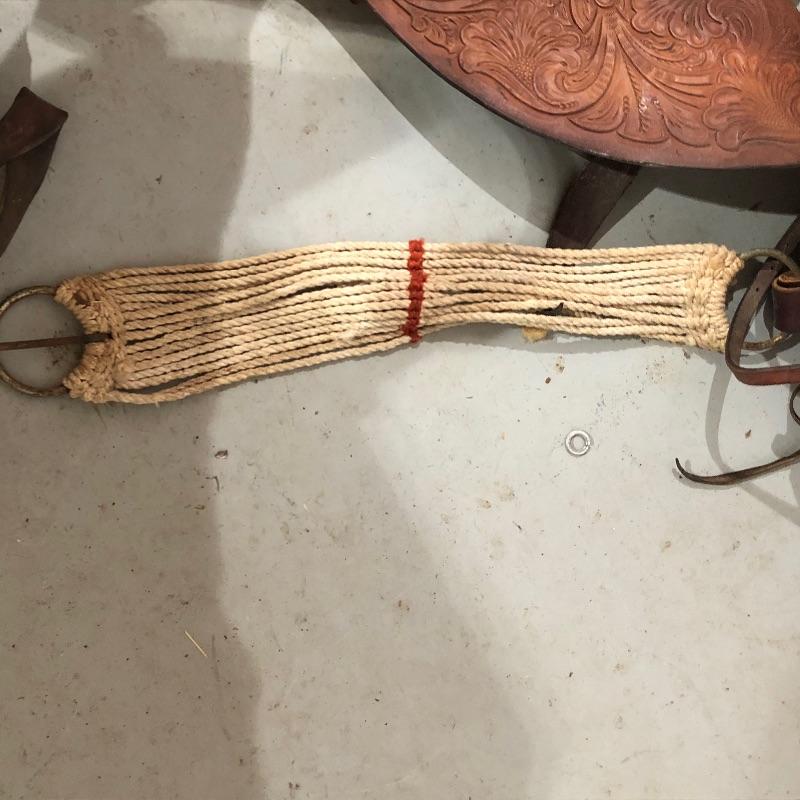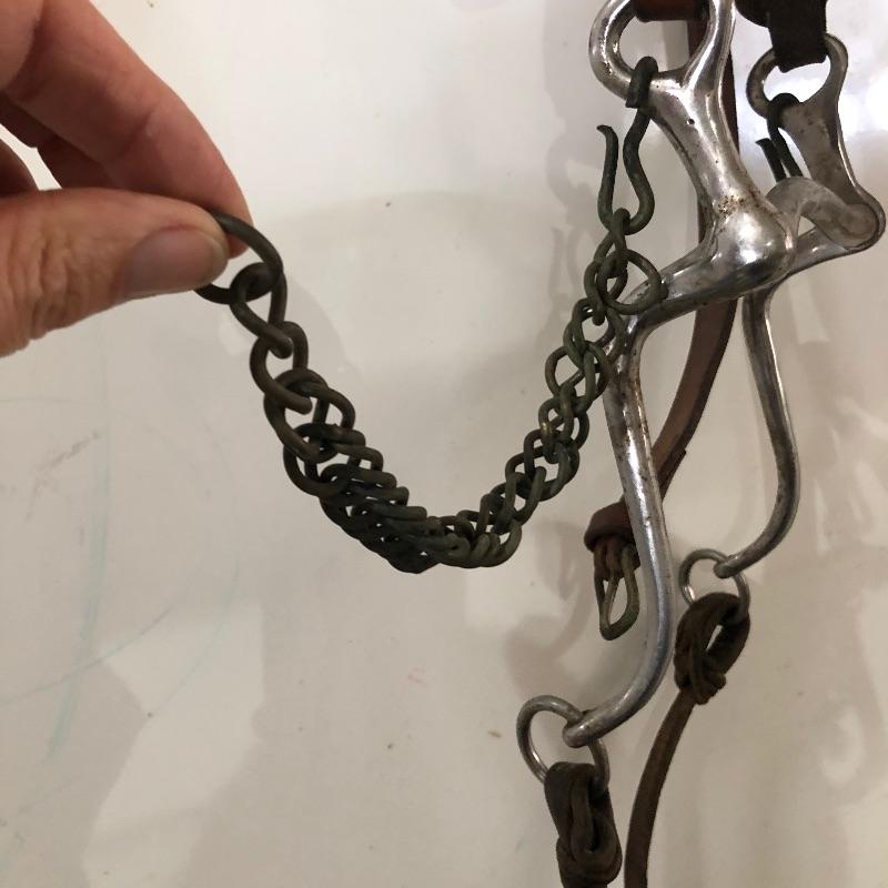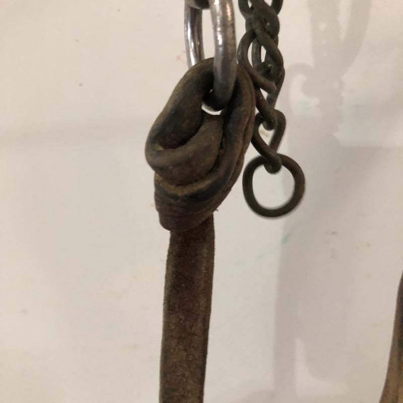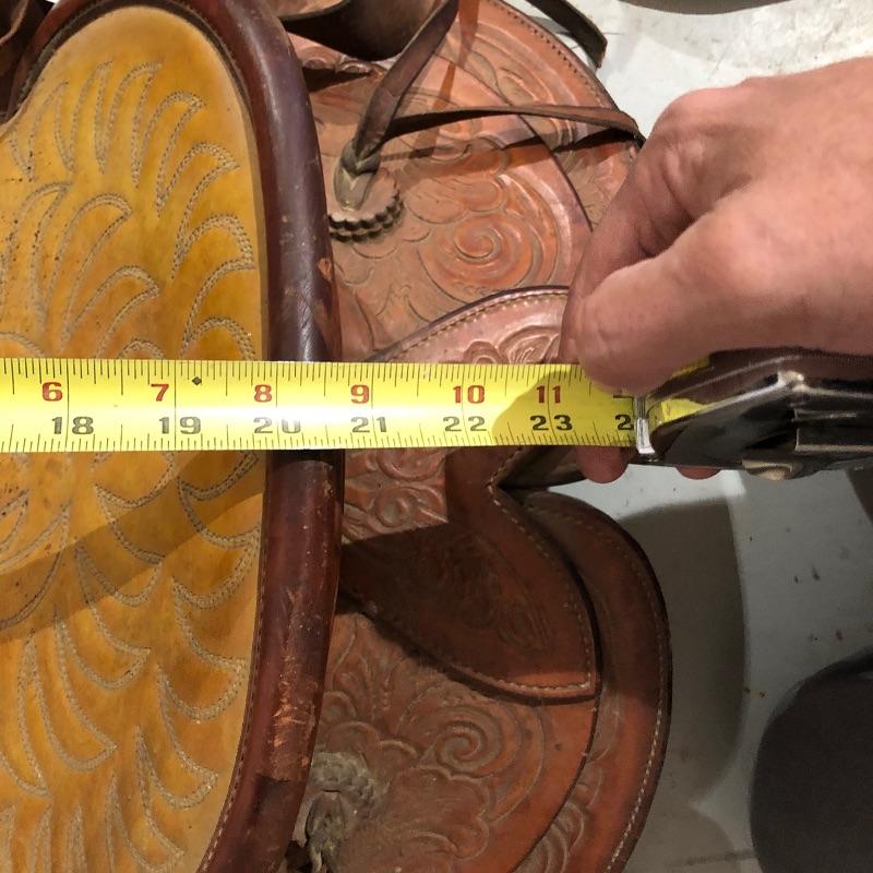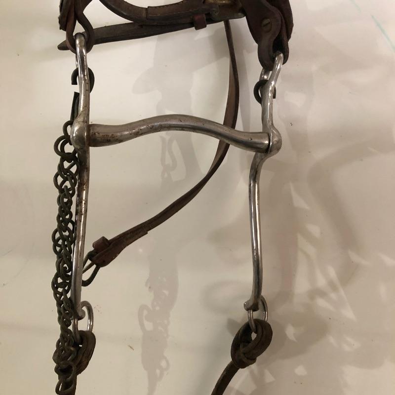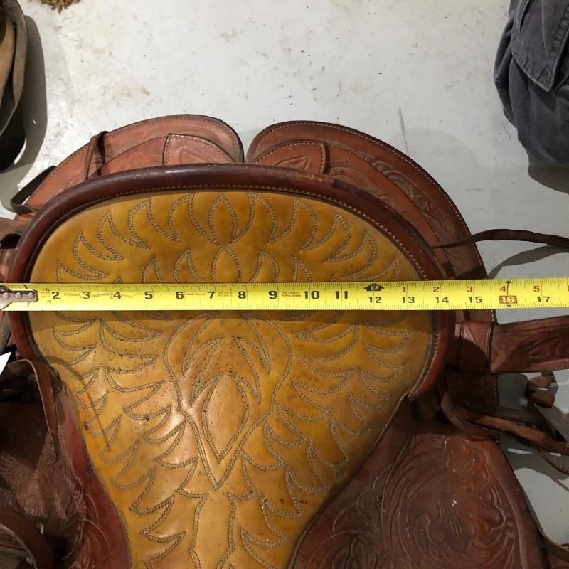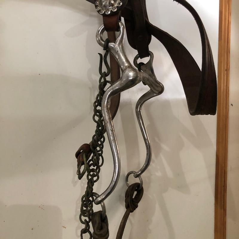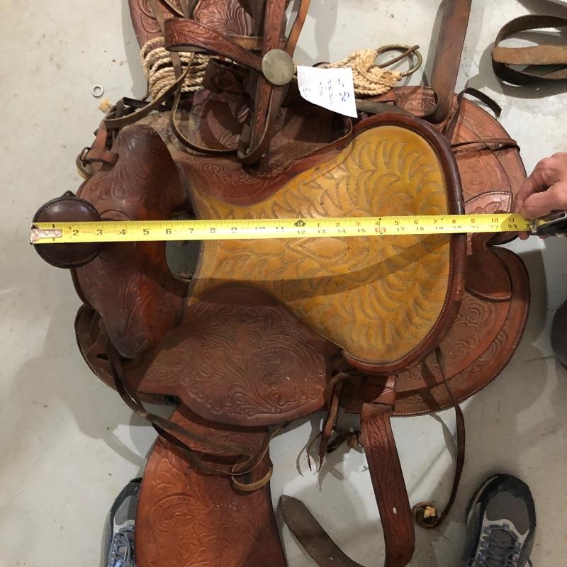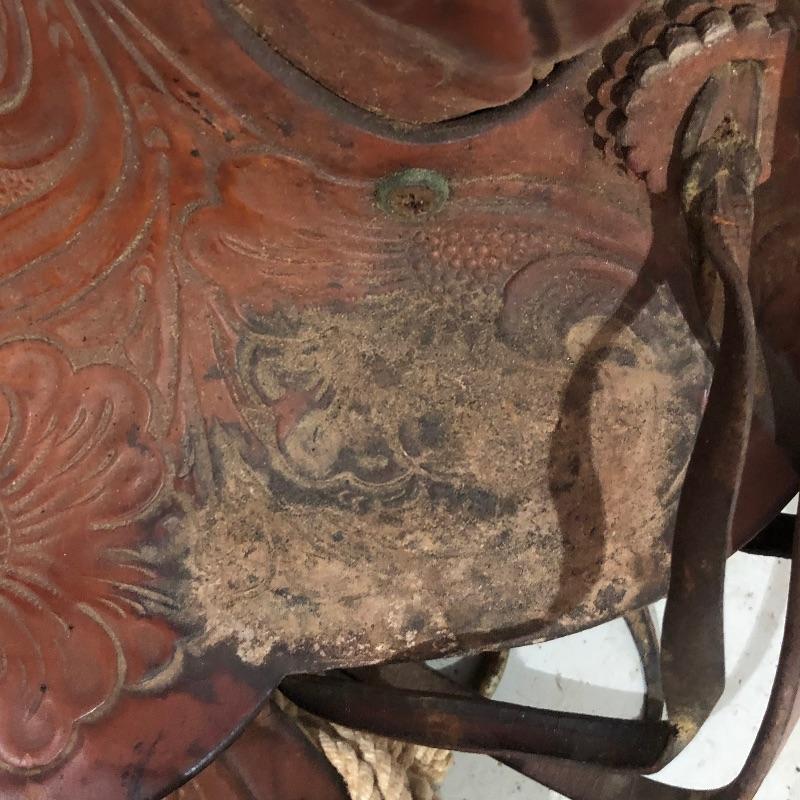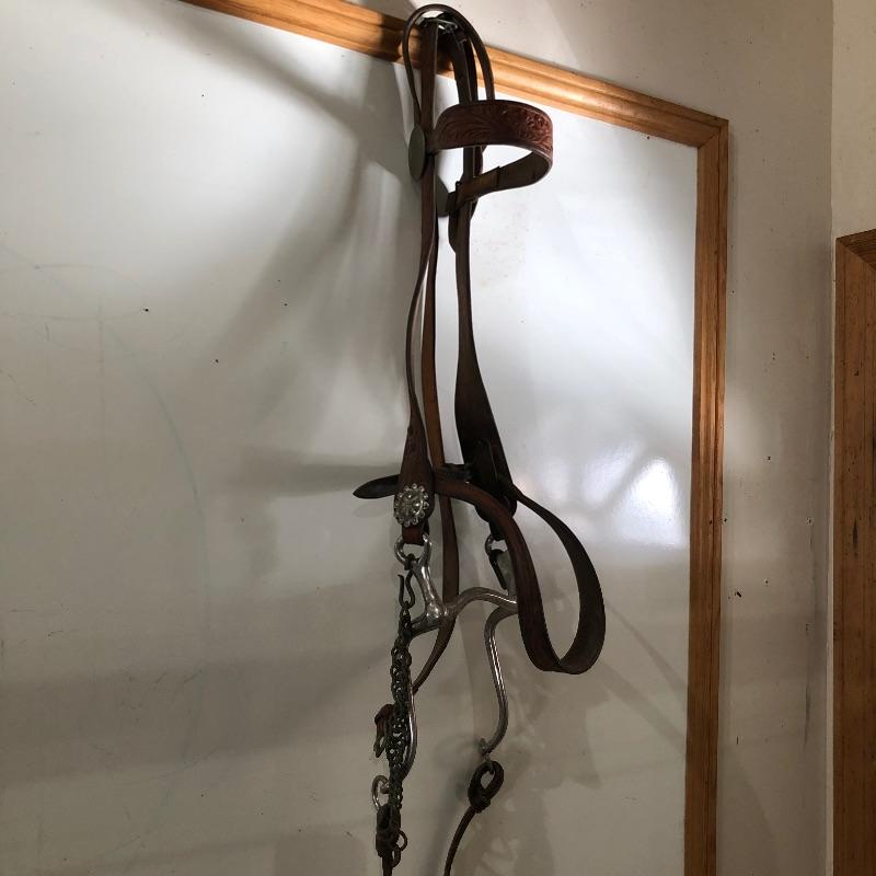 This leather western saddle has some handsome tool work and comes with a cinch and more. It could do with a good clean and oiling. Images show the thin padding that is missing in places on the underside. We have paired this with a leather western-bit bridle with raw hide reins.