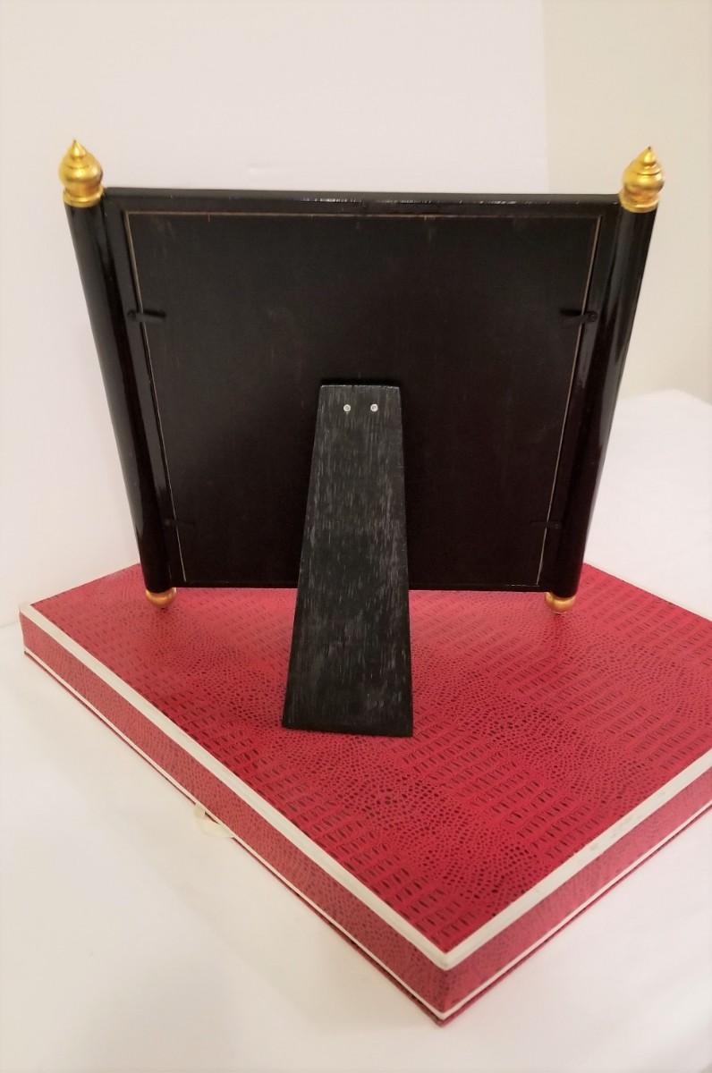 This photo frame is really a beauty - comes in original box. Photo opening is about 9.25" x 10.25". Total is 12" across and 14.5" tall. Moorish Design - wooden lacquer