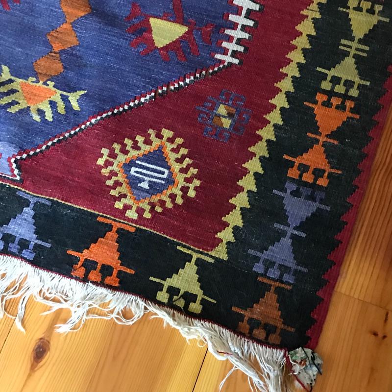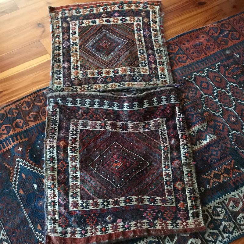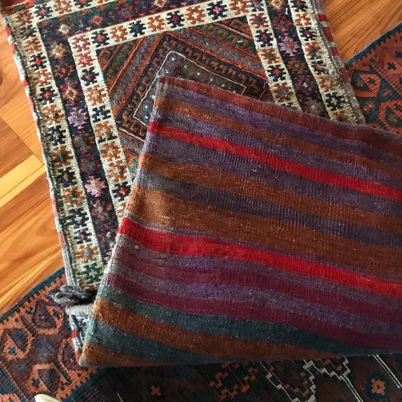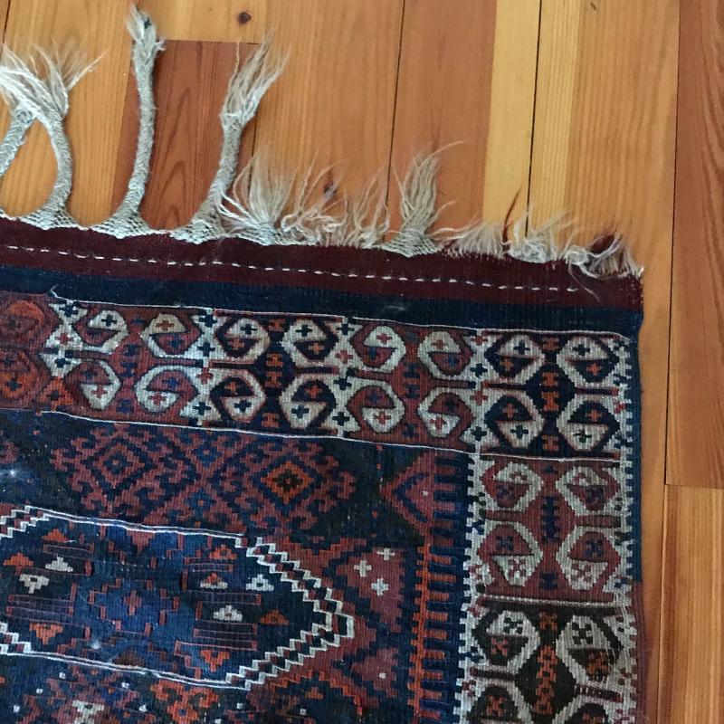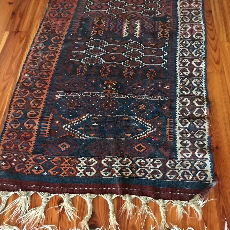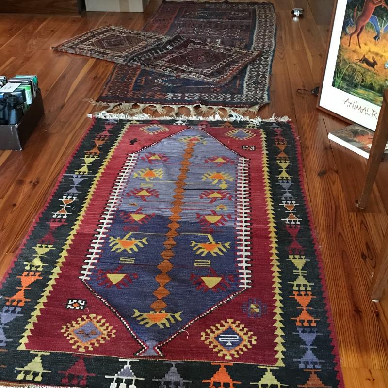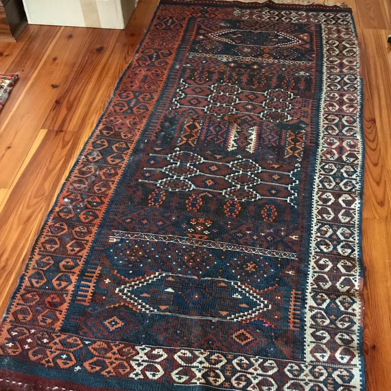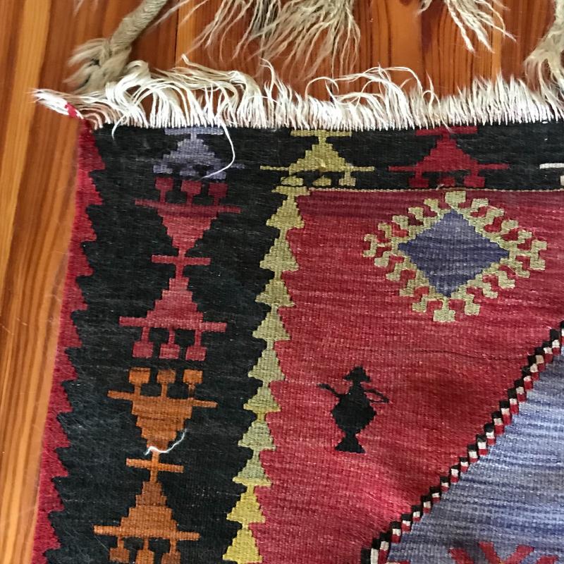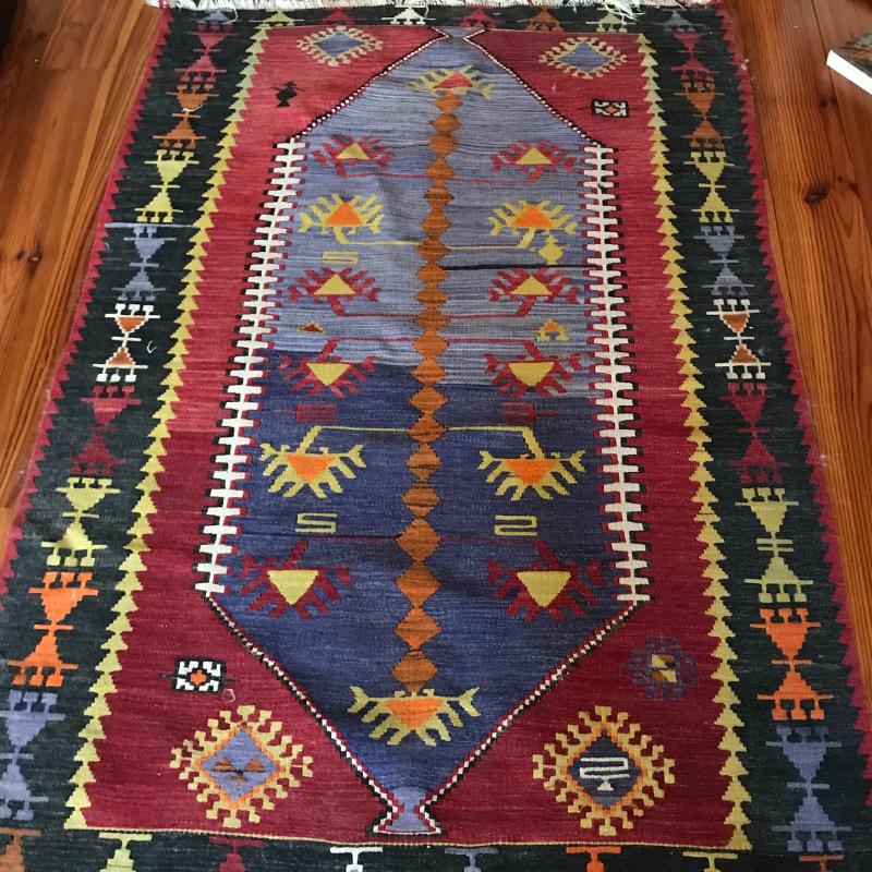 This lot contains two wool rugs in decent shape with some wear. The larger one is approx. 78” x 36”. Smaller one is approx. 50” x 39”. Measurements do not include fringe. Art piece could be a pillow cover. Approx. 47” x 22”. Comes from a house that had cats. Shipping available or local pickup in Asheville, NC.