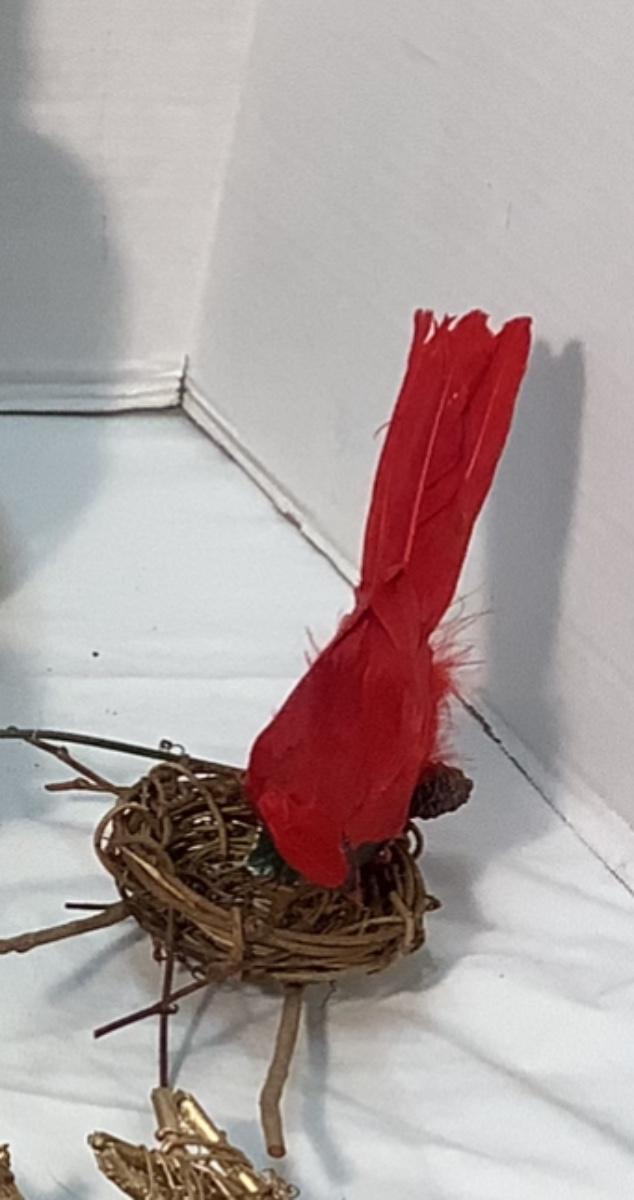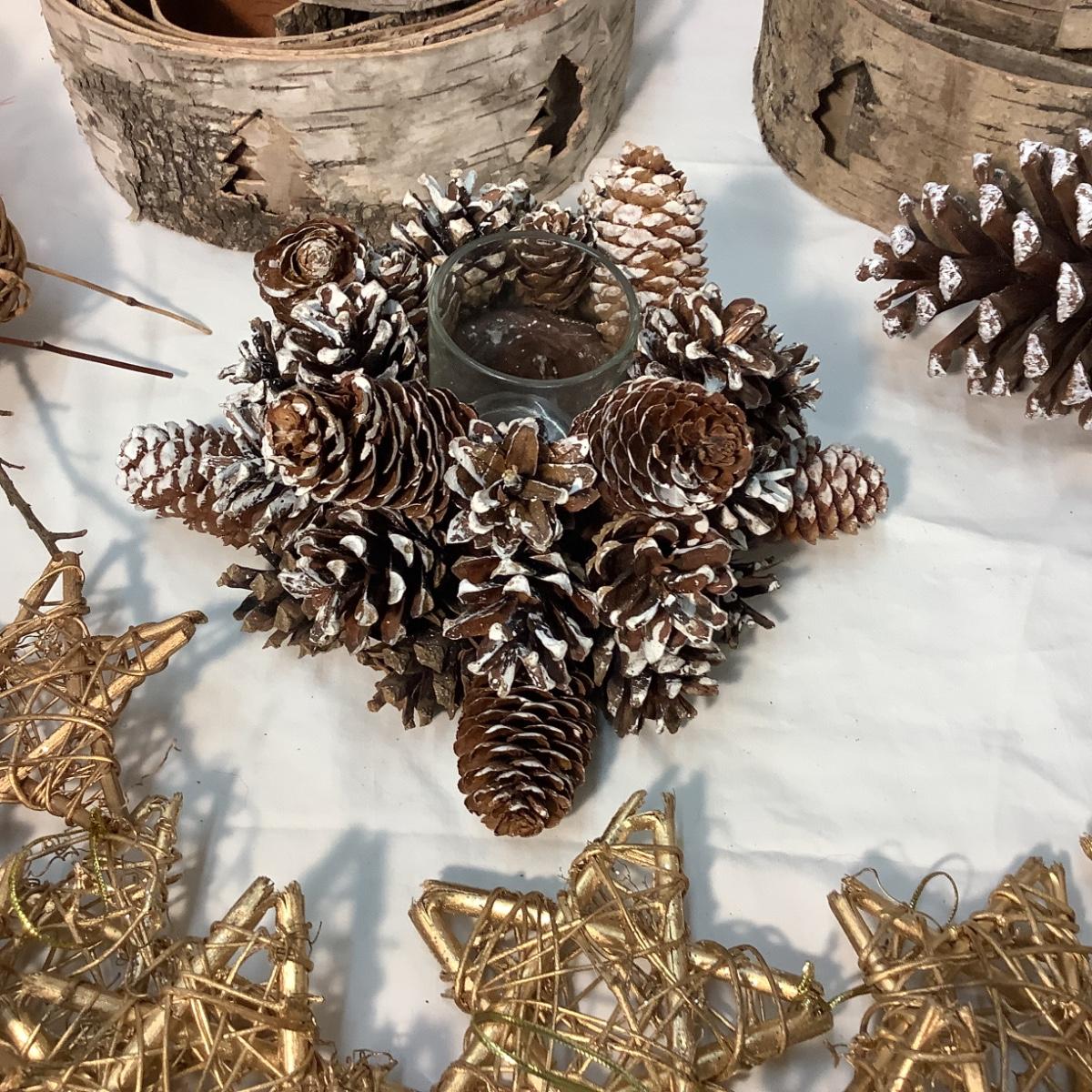 Lot 1564 Lot of Christmas Decor, Bark Garland / Twig Gold Stars / Cardinal with Nest / Pinecone Candle Holder