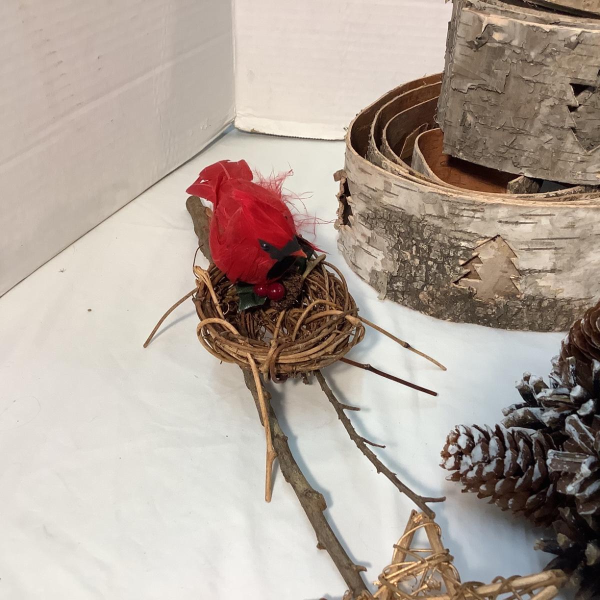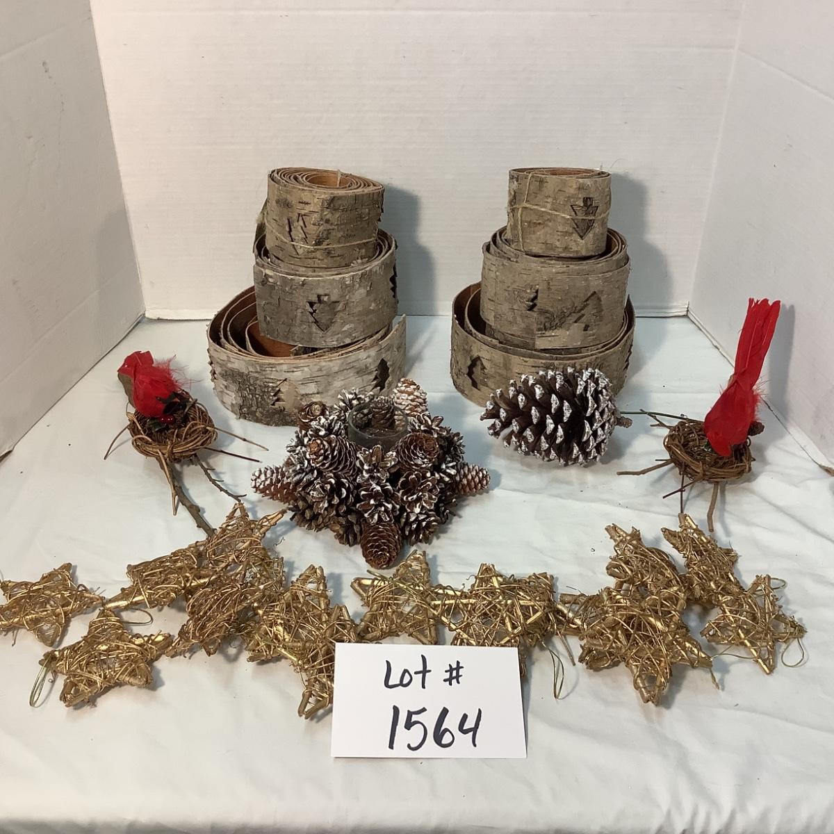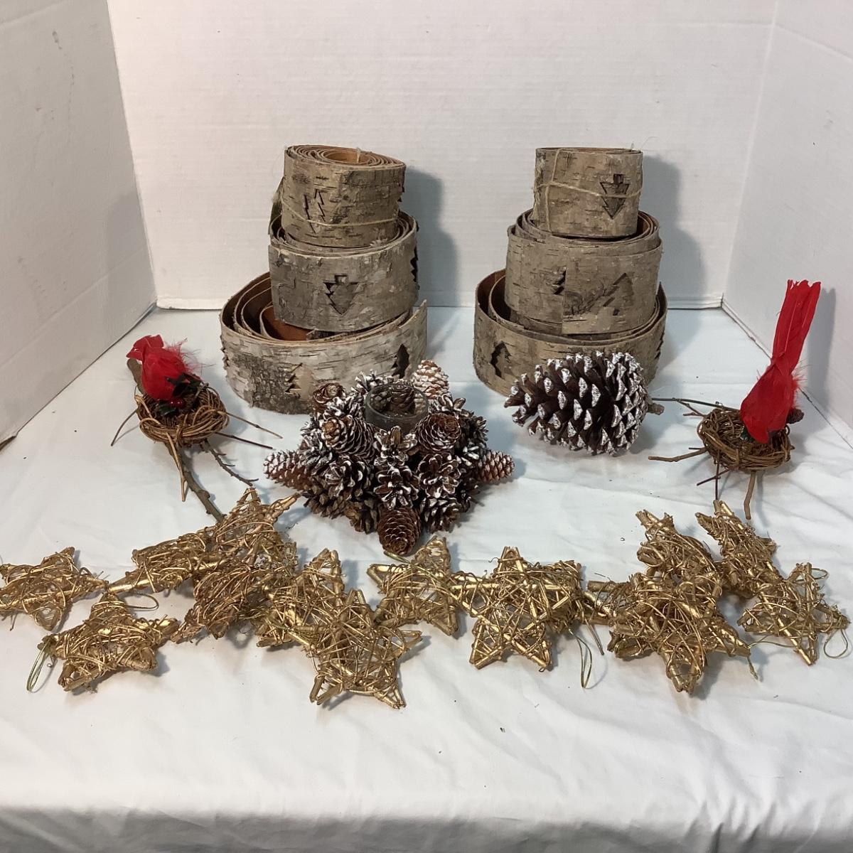 Lot 1564  Lot of Christmas Decor, Bark Garland / Twig Gold Stars / Cardinal with Nest / Pinecone Candle Holder