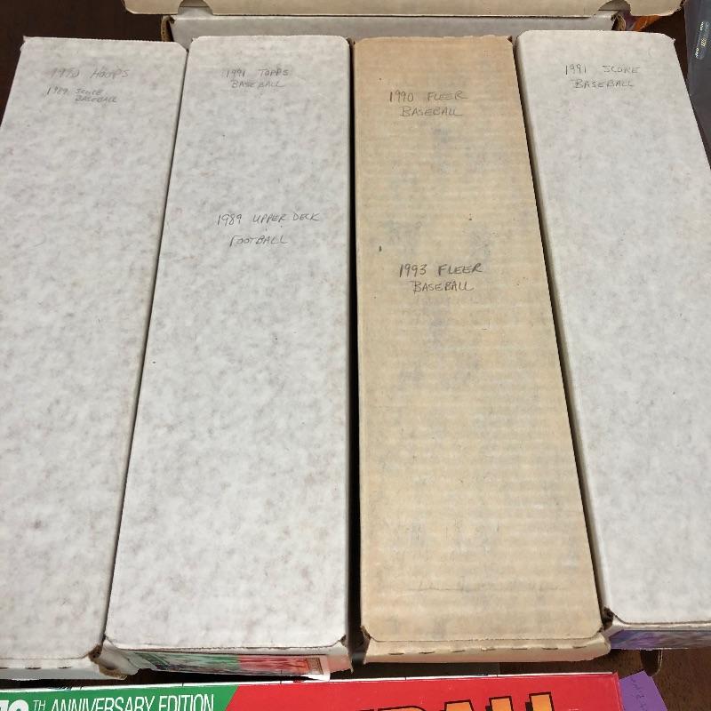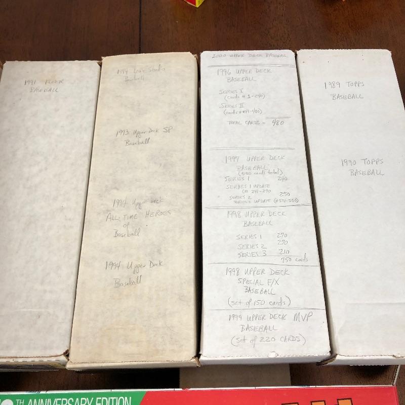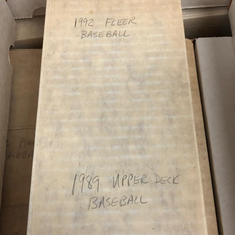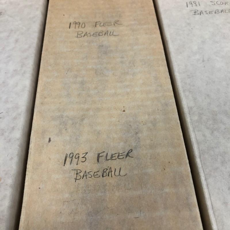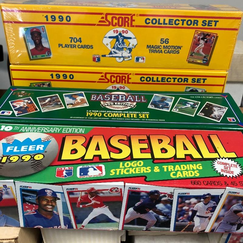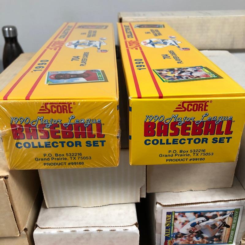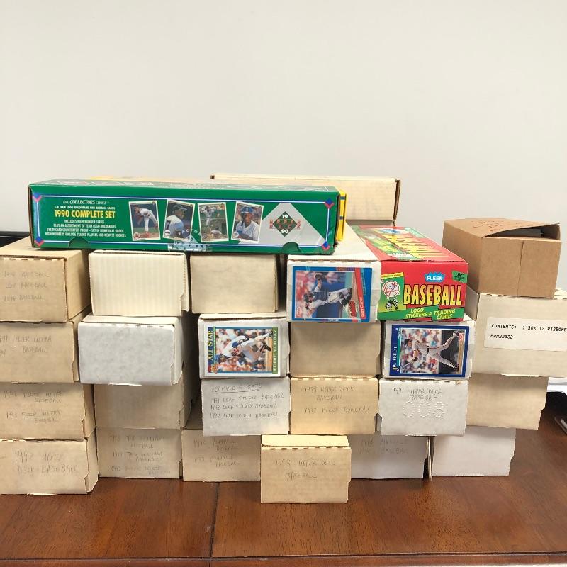 32 Boxes of Baseball Collector cards including several 1990 boxed sets like the unopened 1990 Score Set with 740 player cards and 56 magic motion trivia cards! Please note each of the white boxes has been labeled by the late owner, and while every effort has been made to verify the contents we are unable to guarantee 100% accuracy. This lot will be shipped by UPS due to it's size. Please call for a quote 828-252-6930