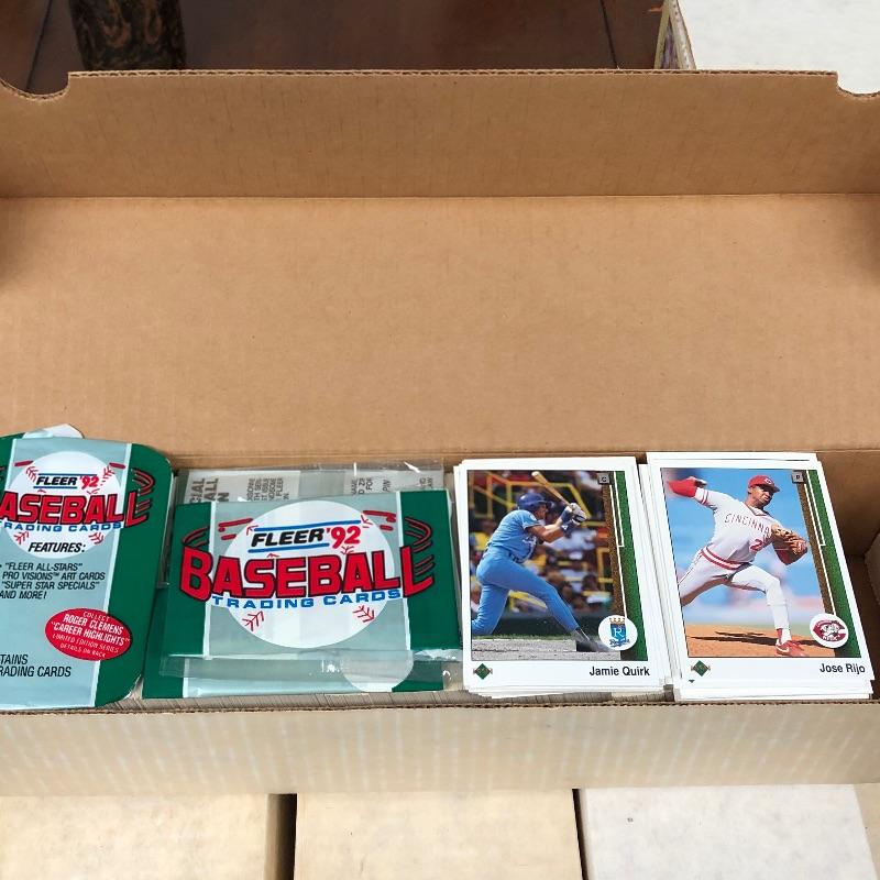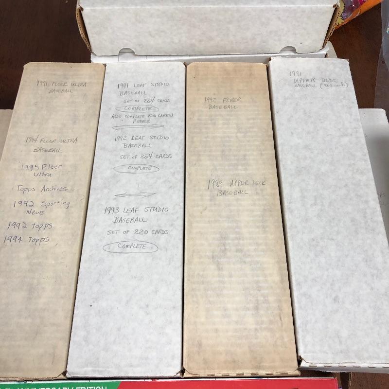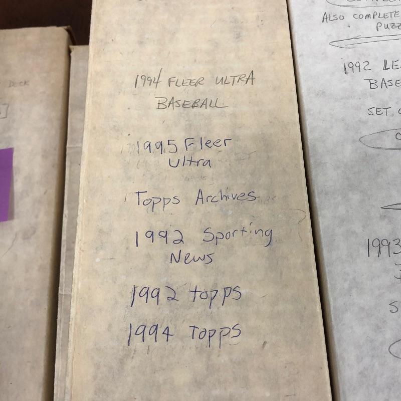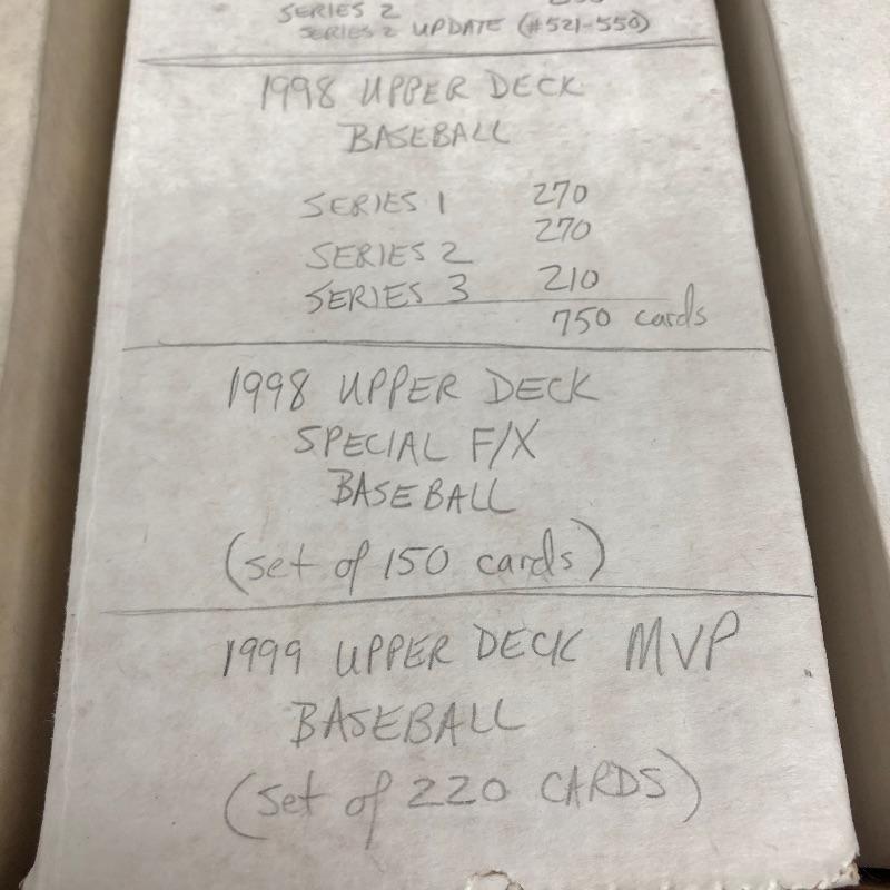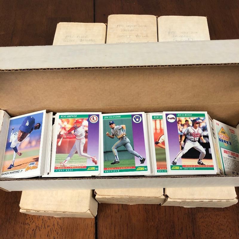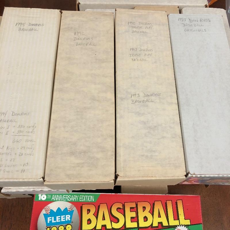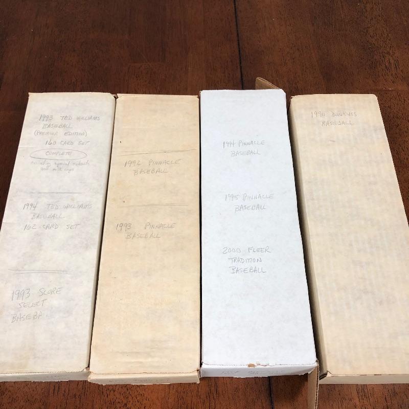 32 Boxes of Baseball Collector cards including several 1990 boxed sets like the unopened 1990 Score Set with 740 player cards and 56 magic motion trivia cards! Please note each of the white boxes has been labeled by the late owner, and while every effort has been made to verify the contents we are unable to guarantee 100% accuracy. This lot will be shipped by UPS due to it's size. Please call for a quote 828-252-6930