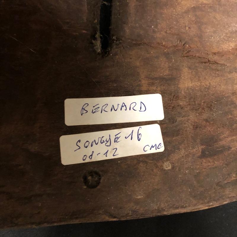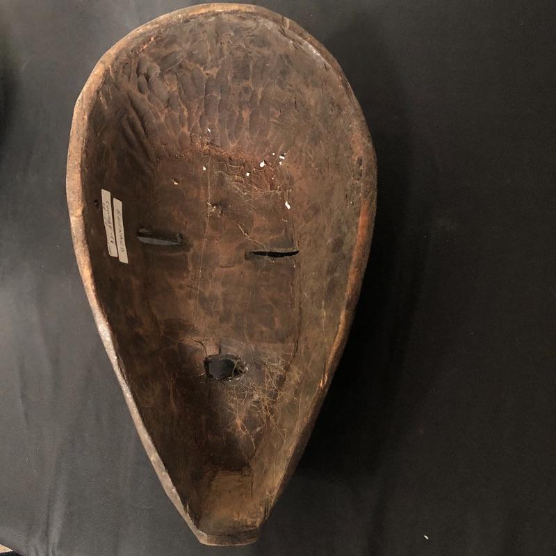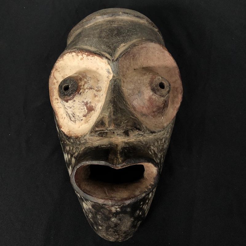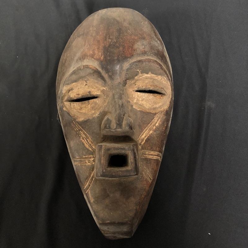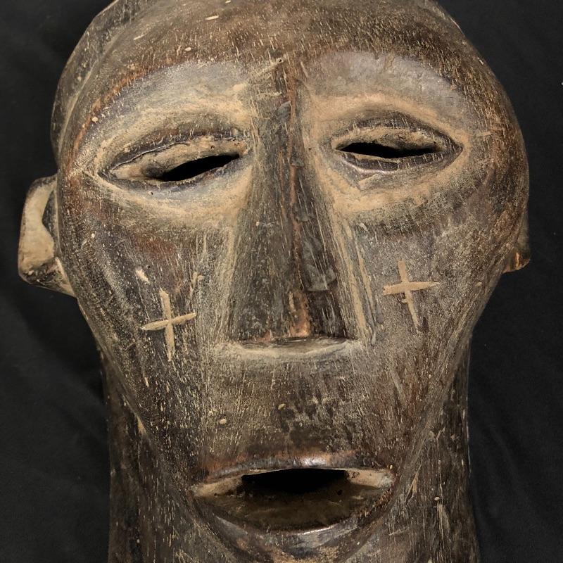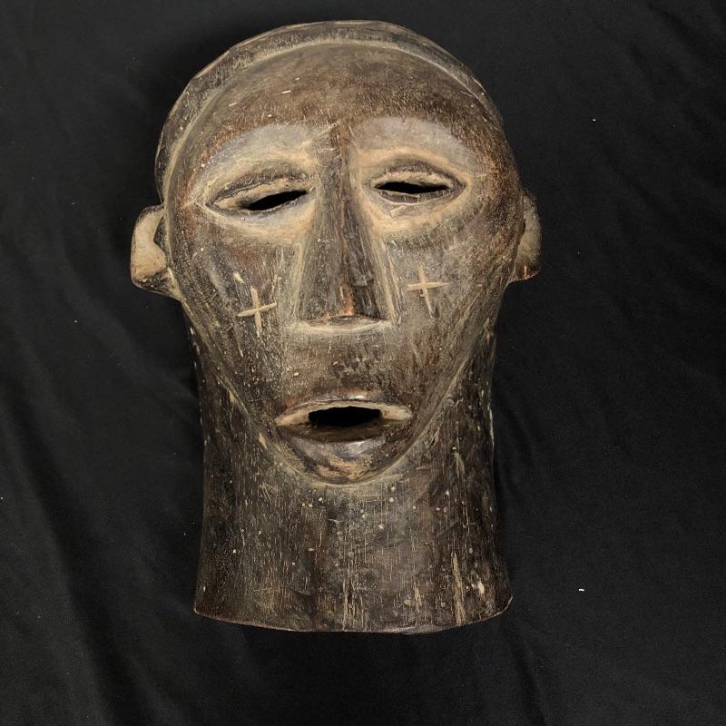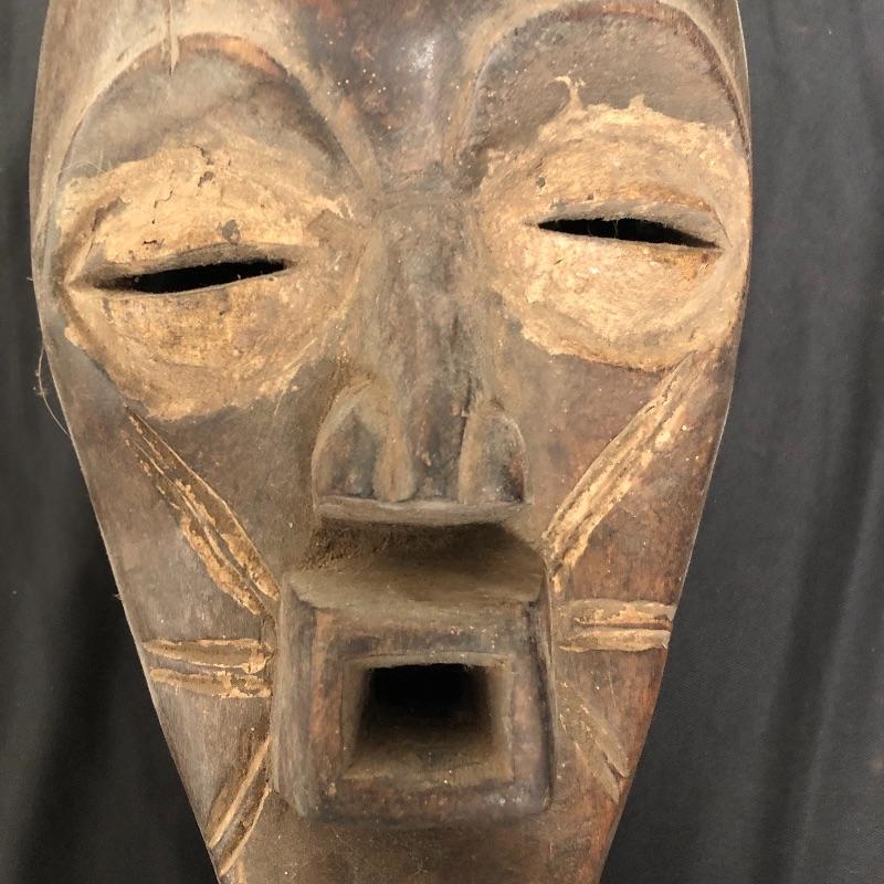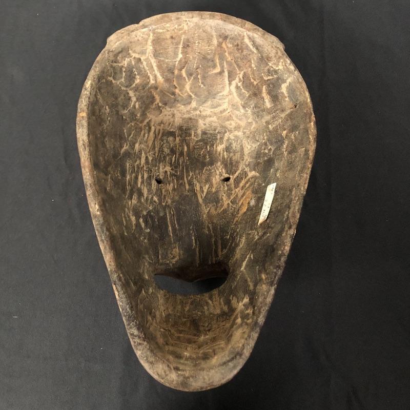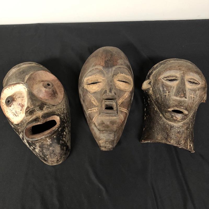 This lot contains three unique masks that are made out of wood. There’s a mask with a flat face (7” x 11.5”) and slit eyes, a second mask with a large mouth, and a third mask with large eyes pointing in different directions.