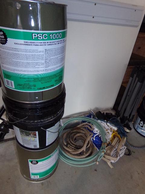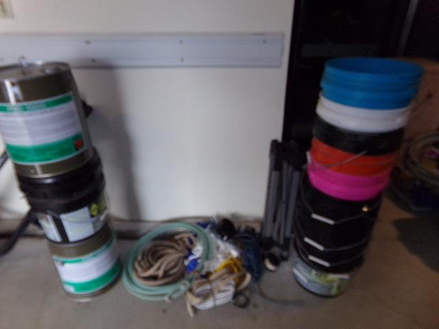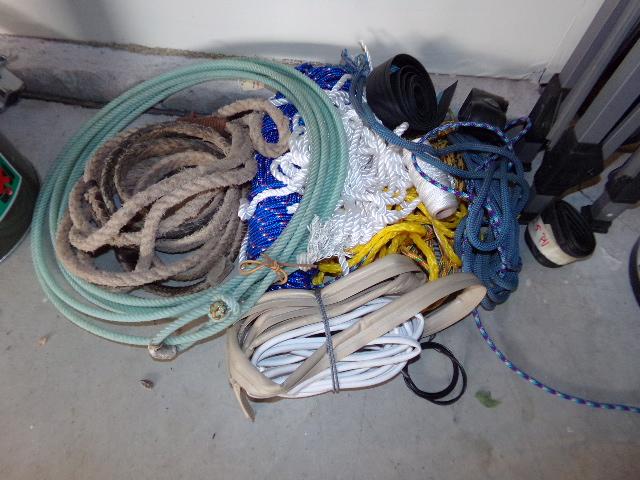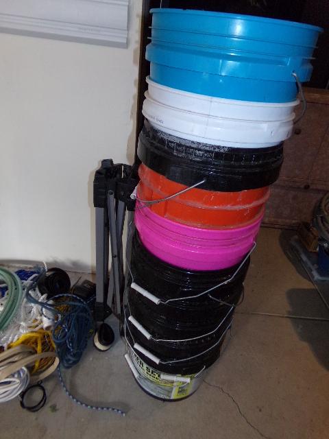 LOTS OF PLASTIC BUCKETS AND LOTS OF DIFFERENT ROPES. GRAY STAND DOES NOT BELONG IN THIS LOT