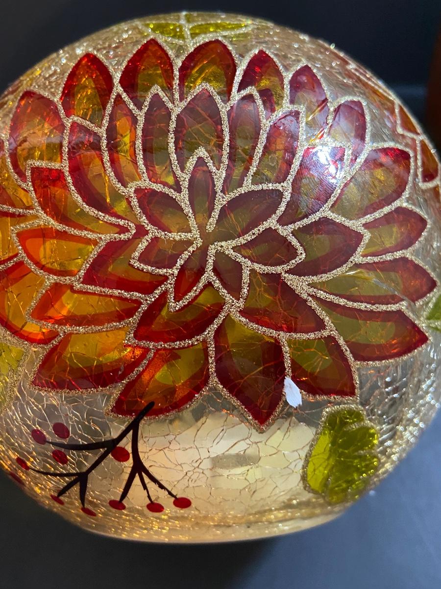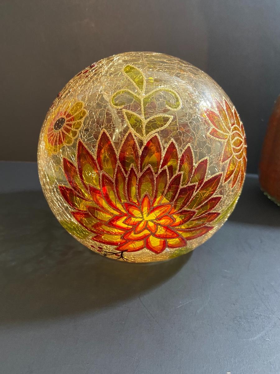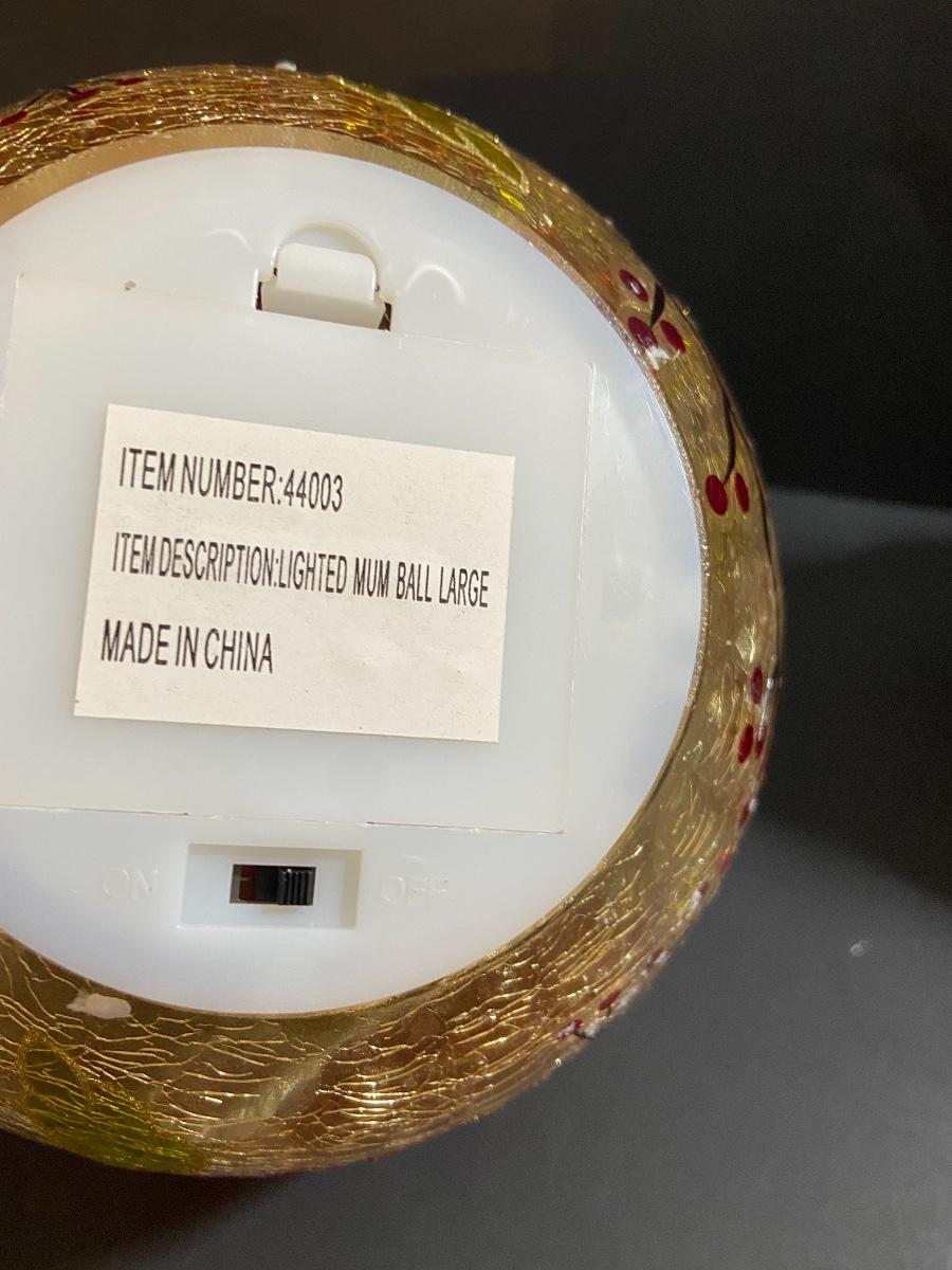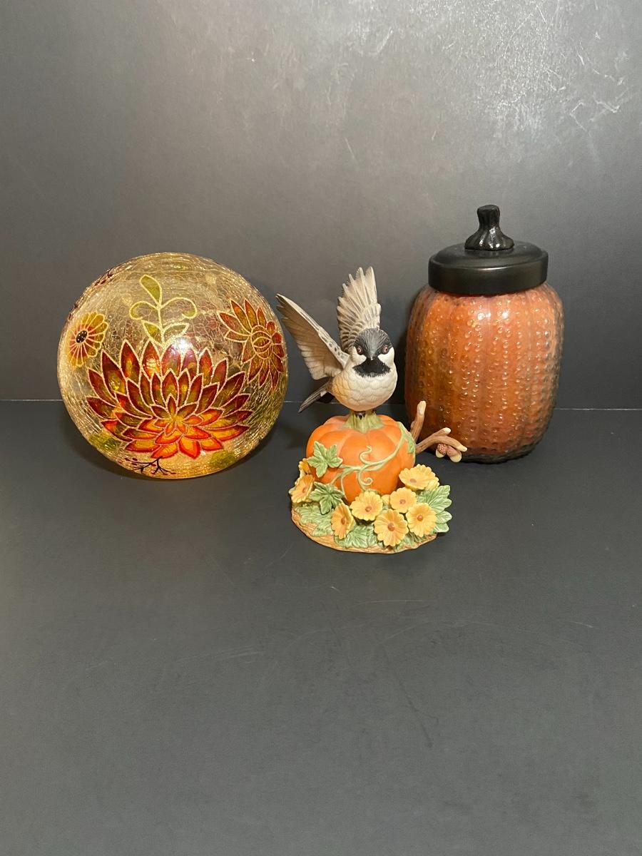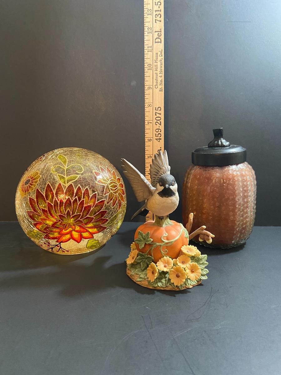 Lighted mum ball (needs batteries, untested) and decorative pumpkin candle. Please see all pictures as they are the best representation of the items. The pictures show condition, measurements if taken, and what is included in the lot. Due to the large amount that we photograph and the time frame, we are not always able to take measurements. All items unless noted, are pre-owned and have been used. If you purchased furniture, you must bring help. We do not allow one person to carry large furniture out on their own. Bring help, tools and a truck for the safety of our client’s homes, and your personal safety. Company policy. Thank you.