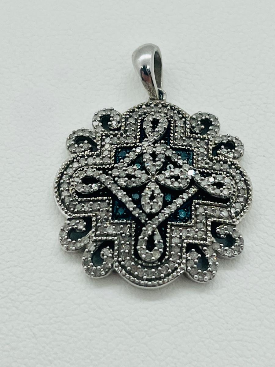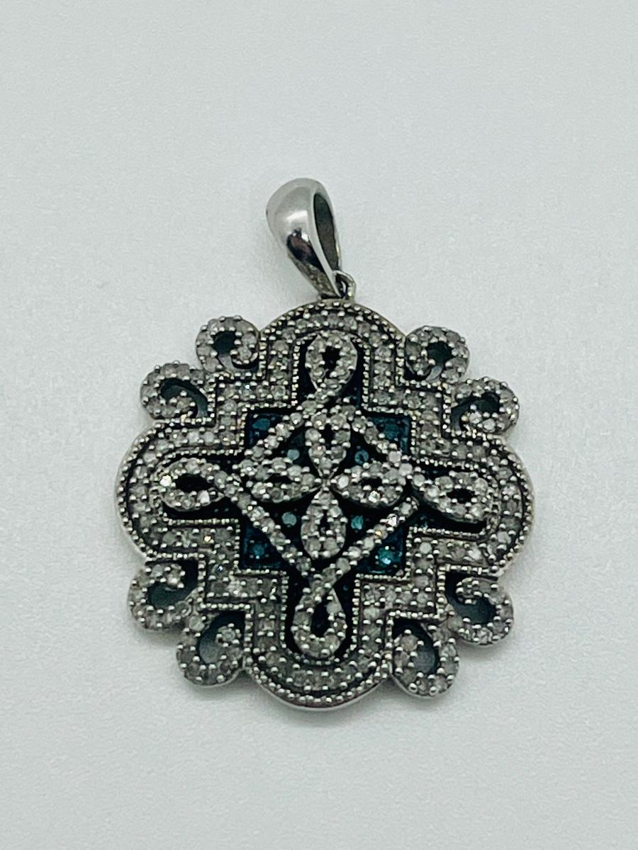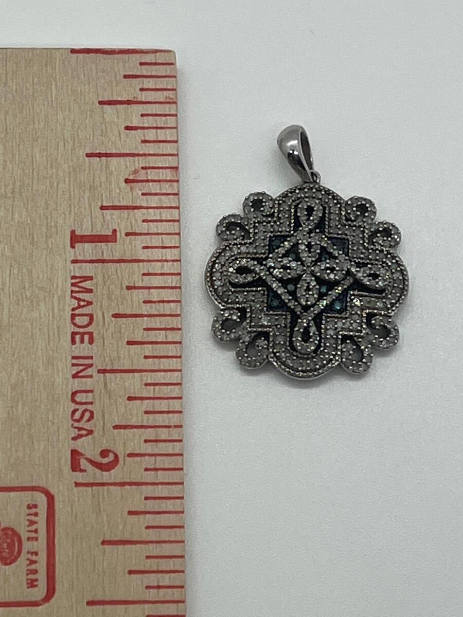 Center diamonds are beautiful teal blue! The bail is marked 925 SJ Used a diamond tester. The pictures show condition, measurements if taken, and what is included in the lot. Due to the large amount that we photograph and the time frame, we are not always able to take measurements. All items unless noted, are pre-owned and have been used, and are untested. Thank you