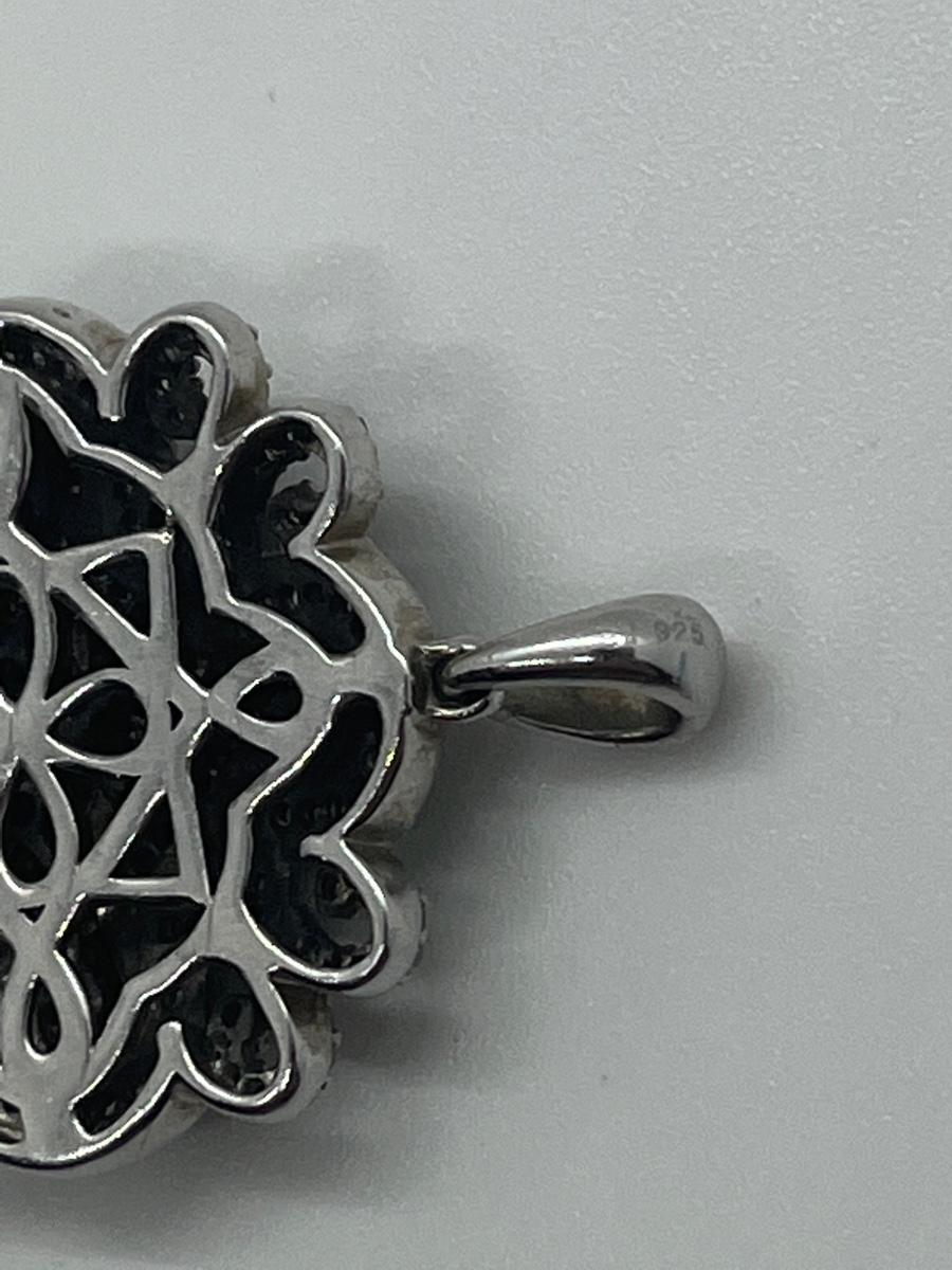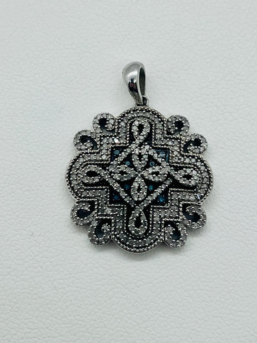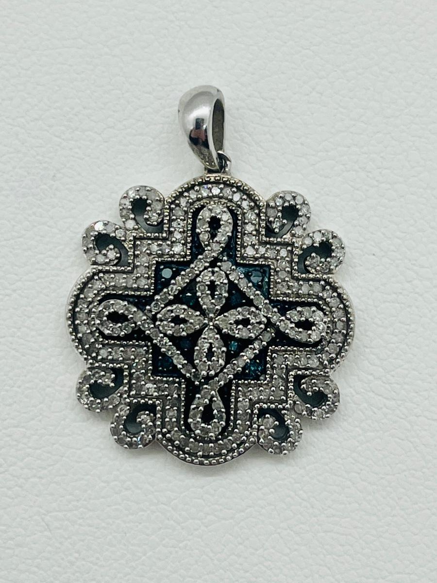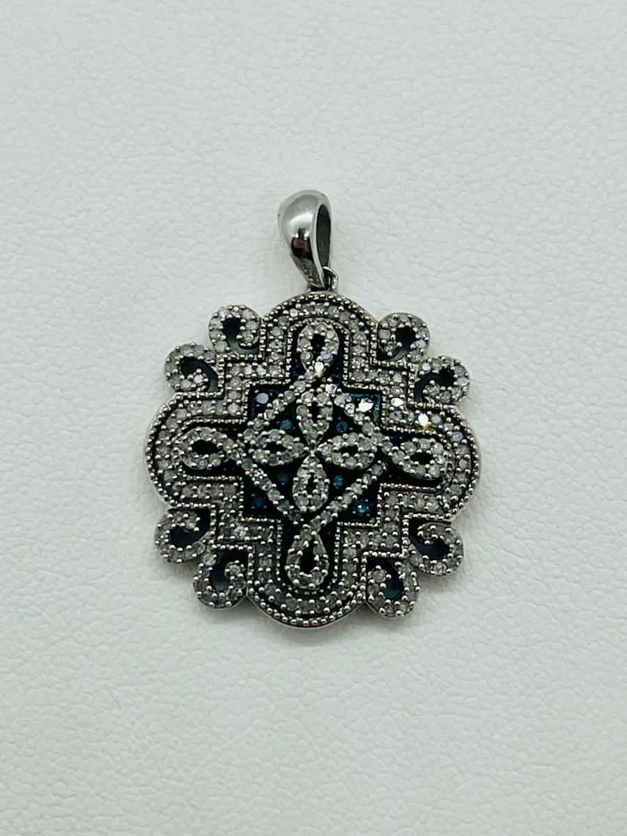 Center diamonds are beautiful teal blue! The bail is marked 925 SJ Used a diamond tester. The pictures show condition, measurements if taken, and what is included in the lot. Due to the large amount that we photograph and the time frame, we are not always able to take measurements. All items unless noted, are pre-owned and have been used, and are untested. Thank you