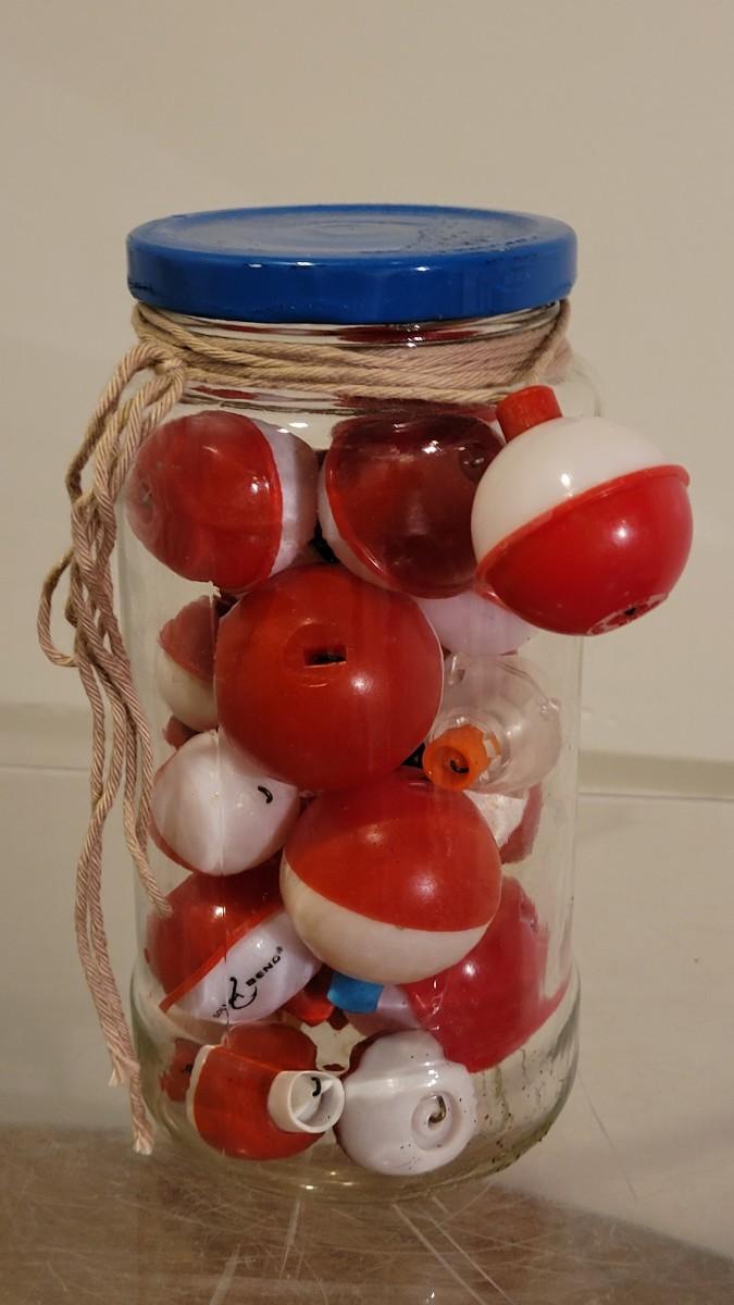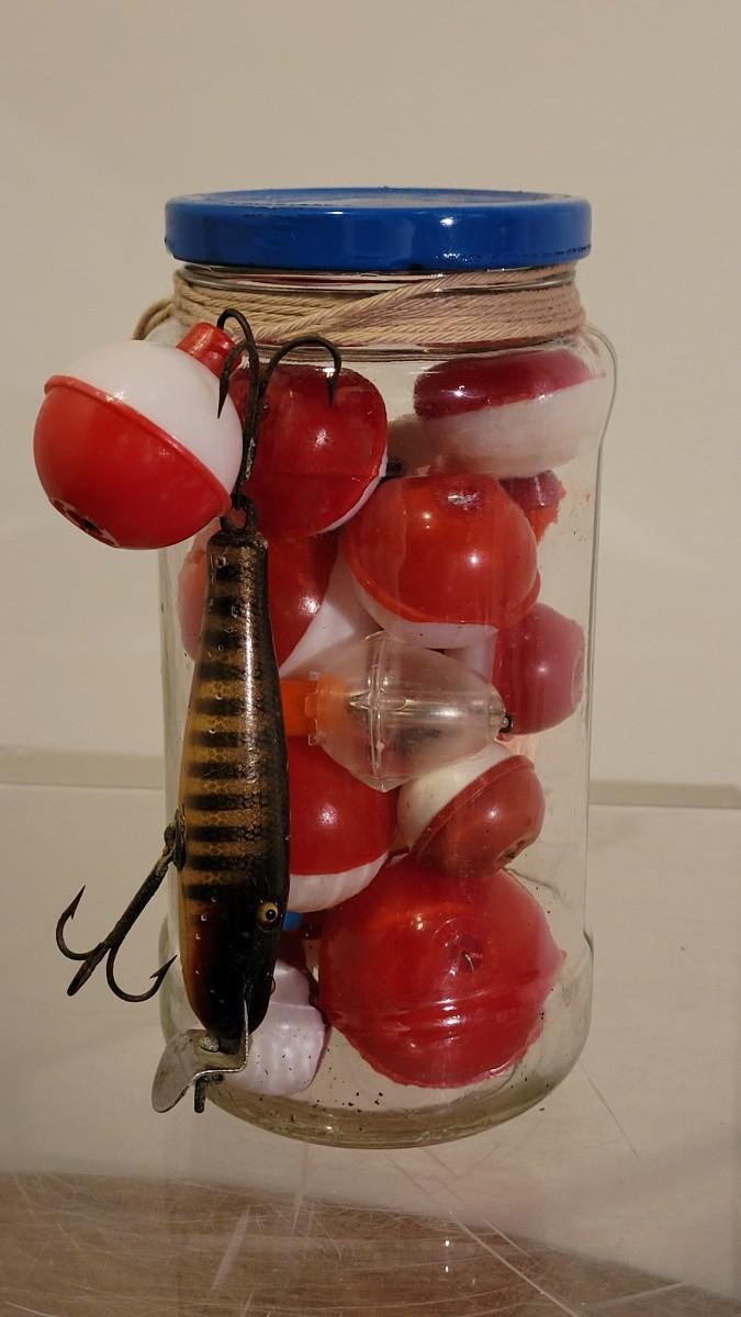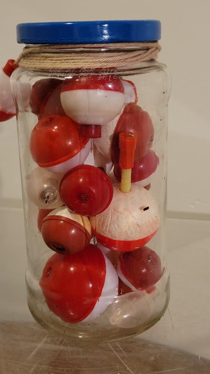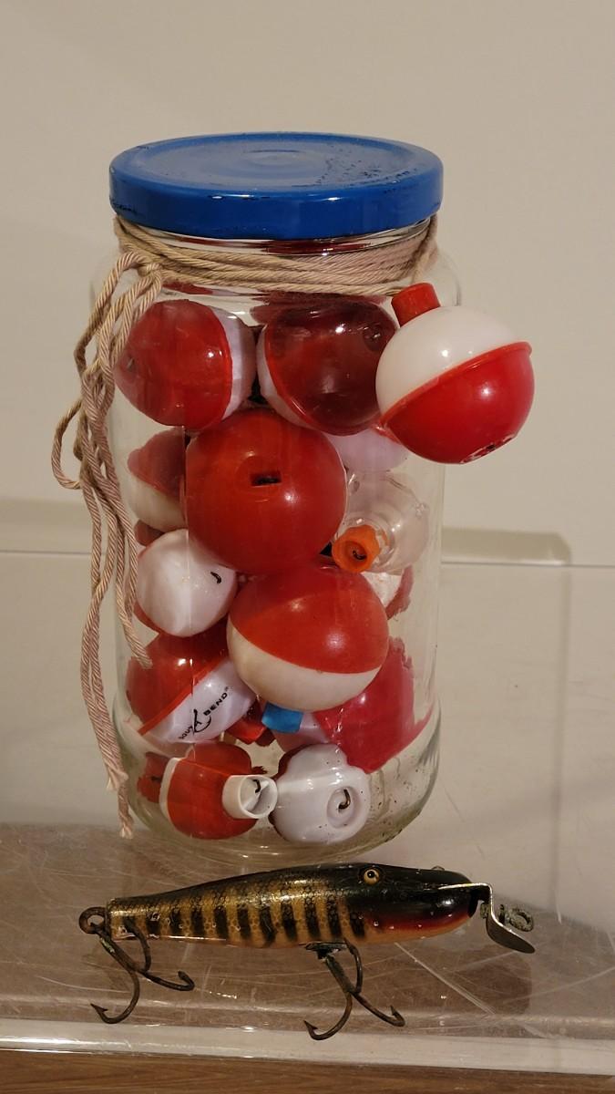 Lot 157: Vintage Jar of Fishing Bobbers and Fishing Lure